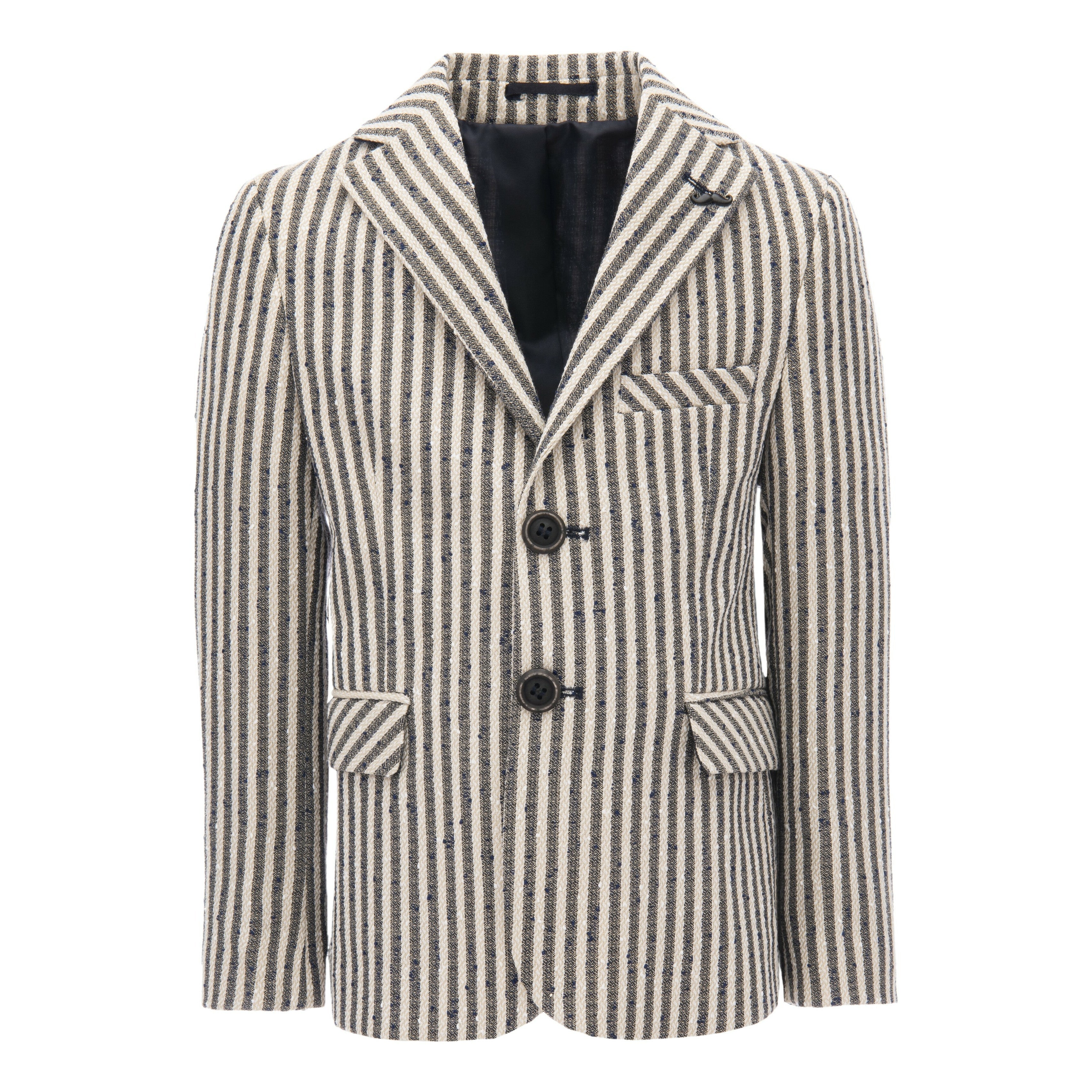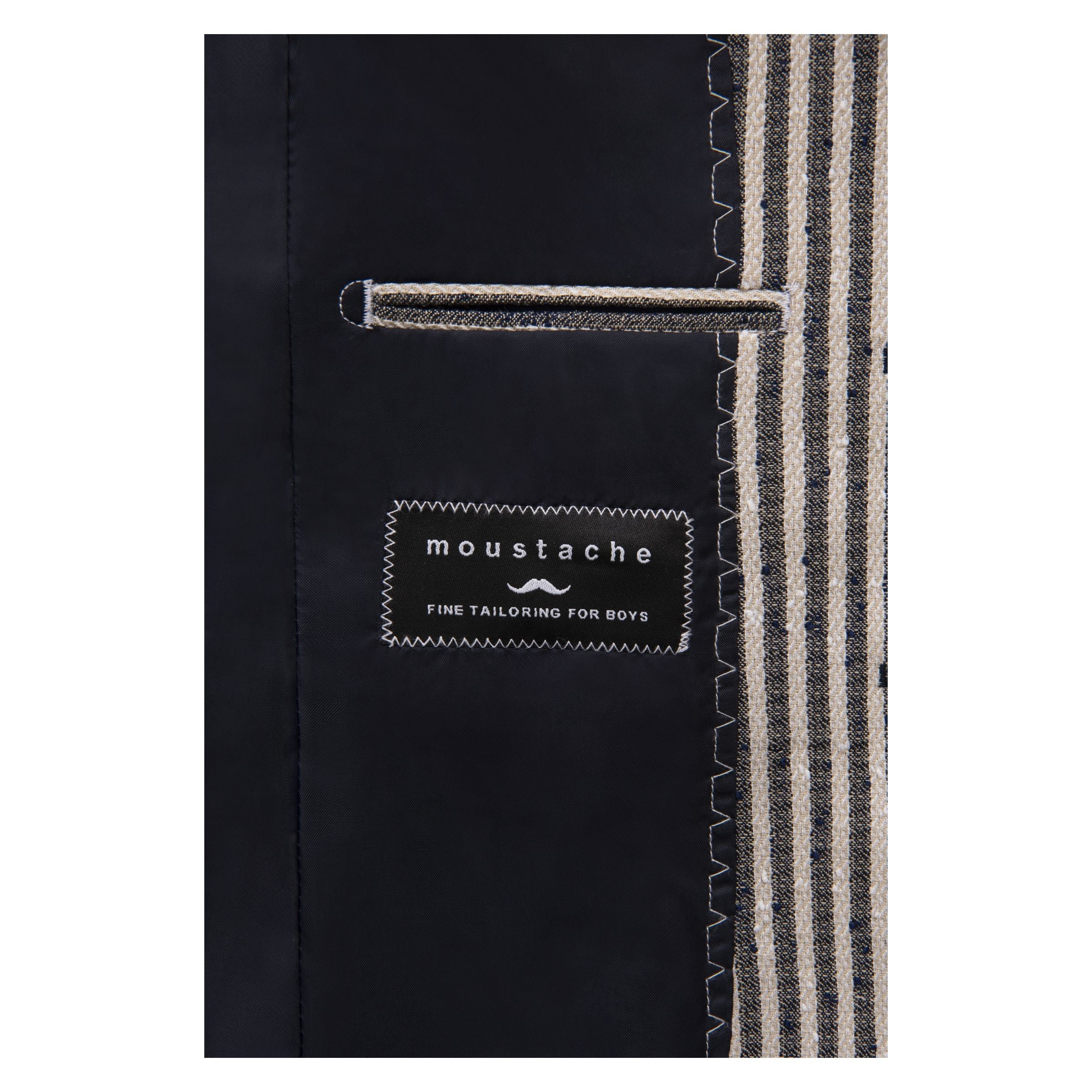 Beige double striped peak lapel blazer for kid boys from Moustache. Featuring a beige and navy double stripe design, this blazer offers an elegant and sophisticated look. The satin-like lining and peak lapel add a touch of luxury, making it perfect for any special occasion.