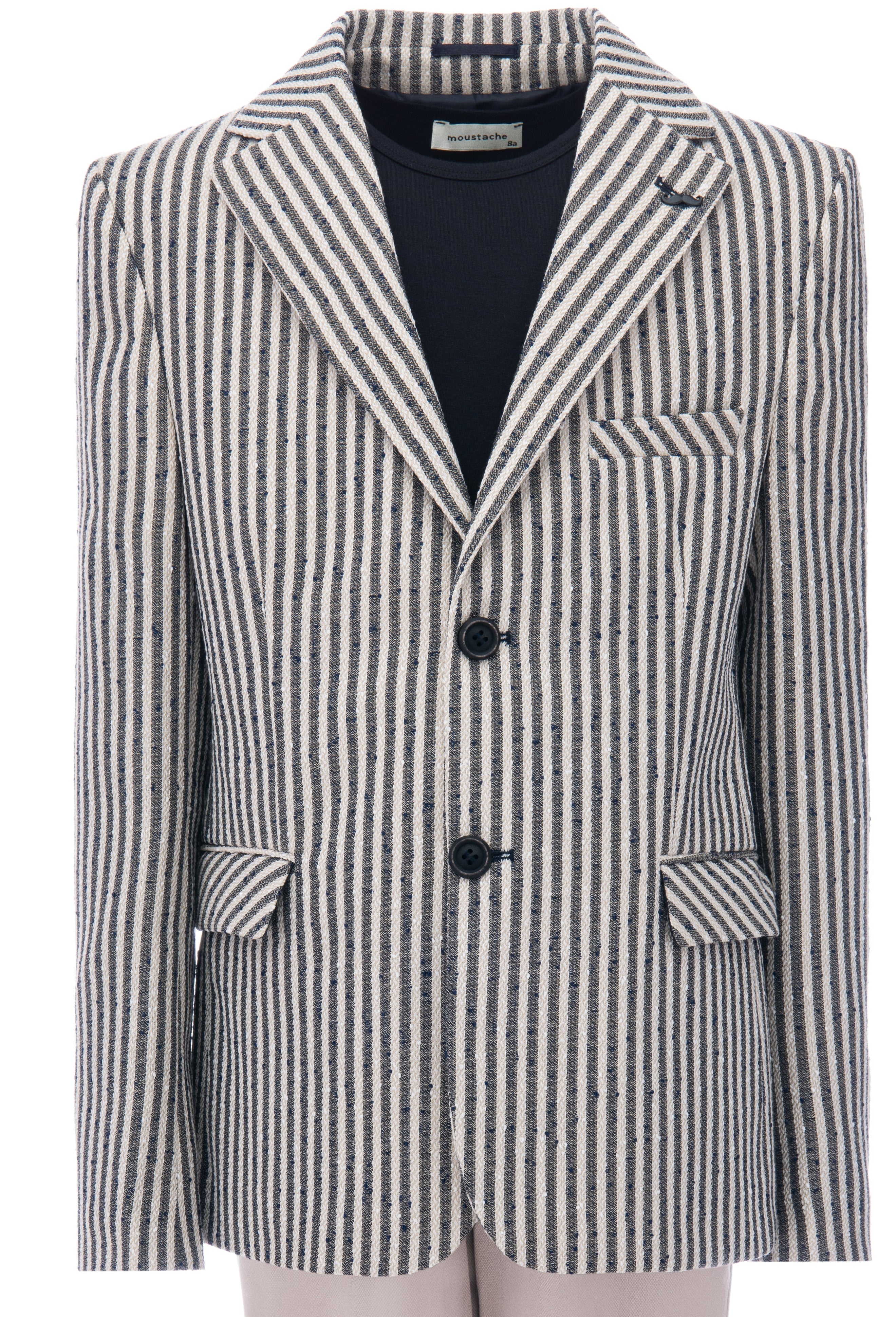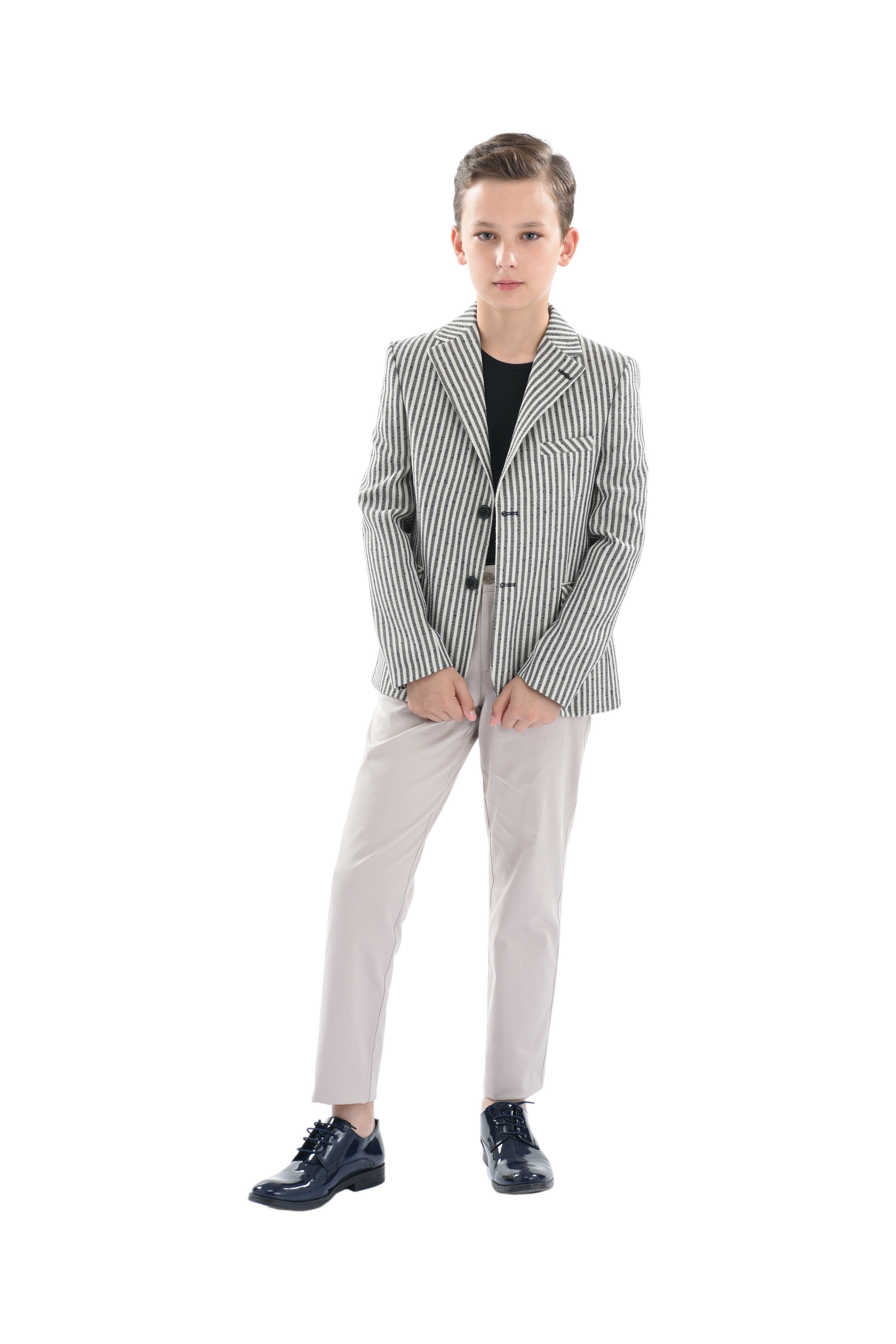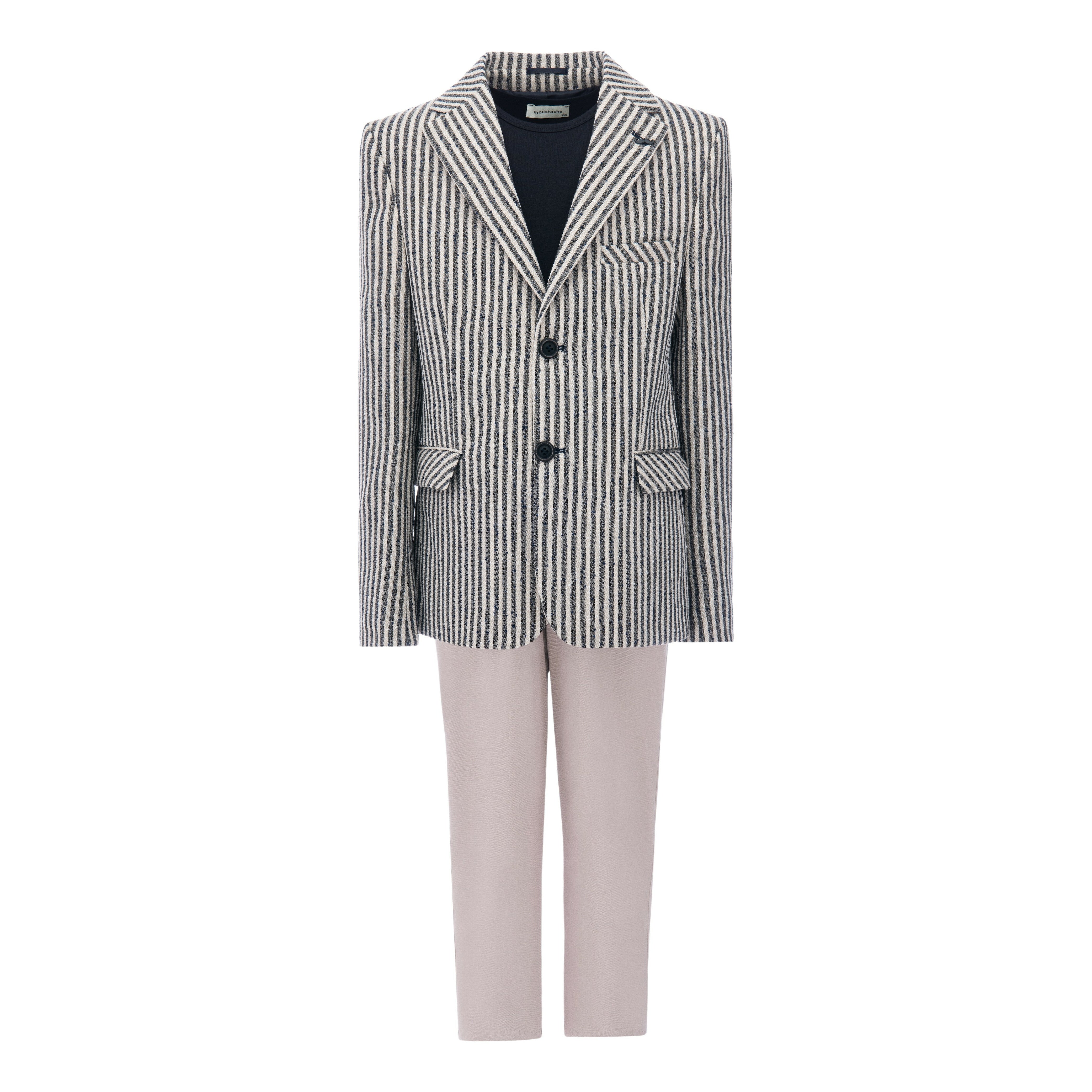 Beige Olivero striped casual dress outfit for kid boys from Moustache. This 3pc ensemble includes a blazer, t-shirt, and matching pants, providing a complete and stylish look for any occasion. The beige and navy striped peak lapel blazer features dual pockets and a double button closure, adding a touch of sophistication.