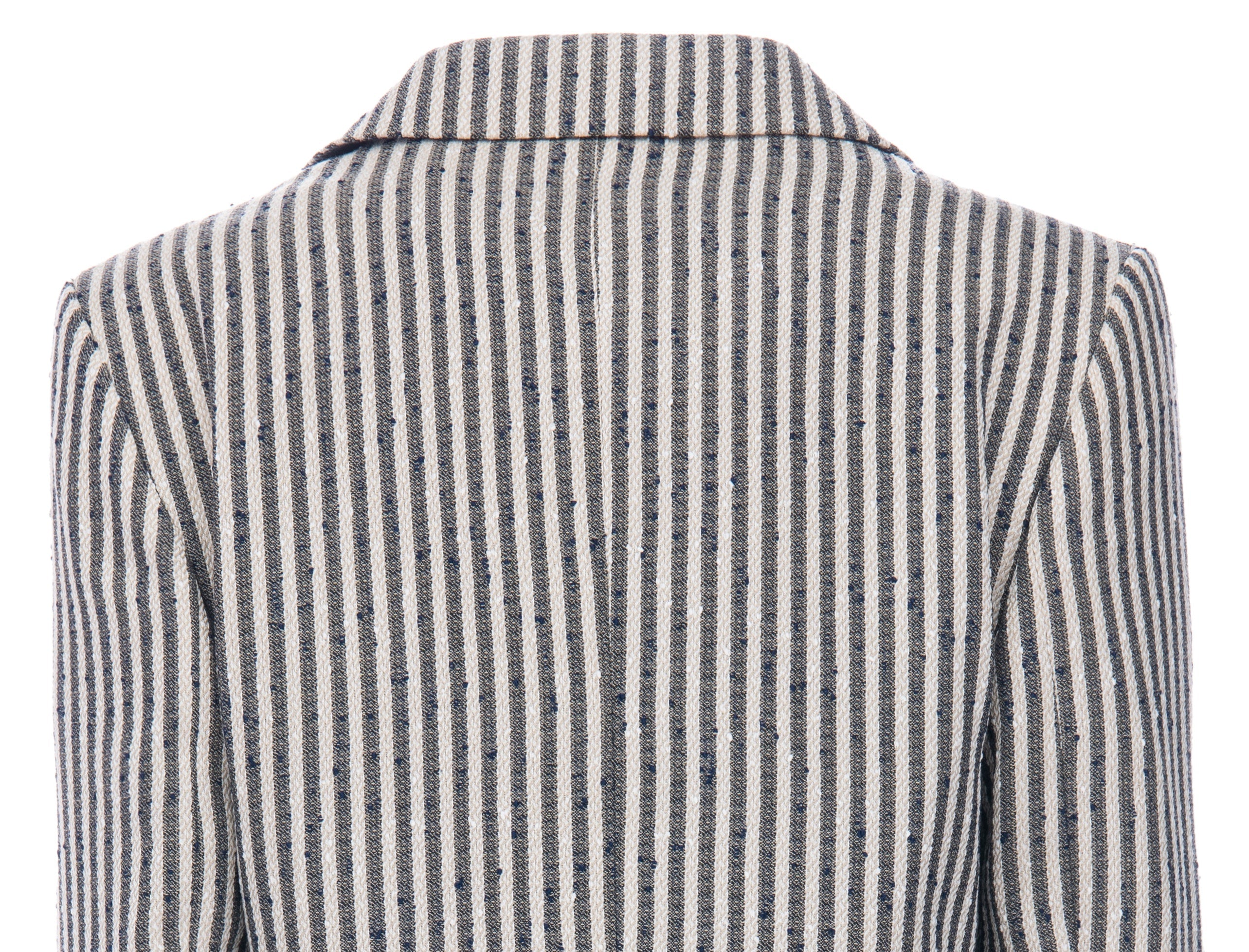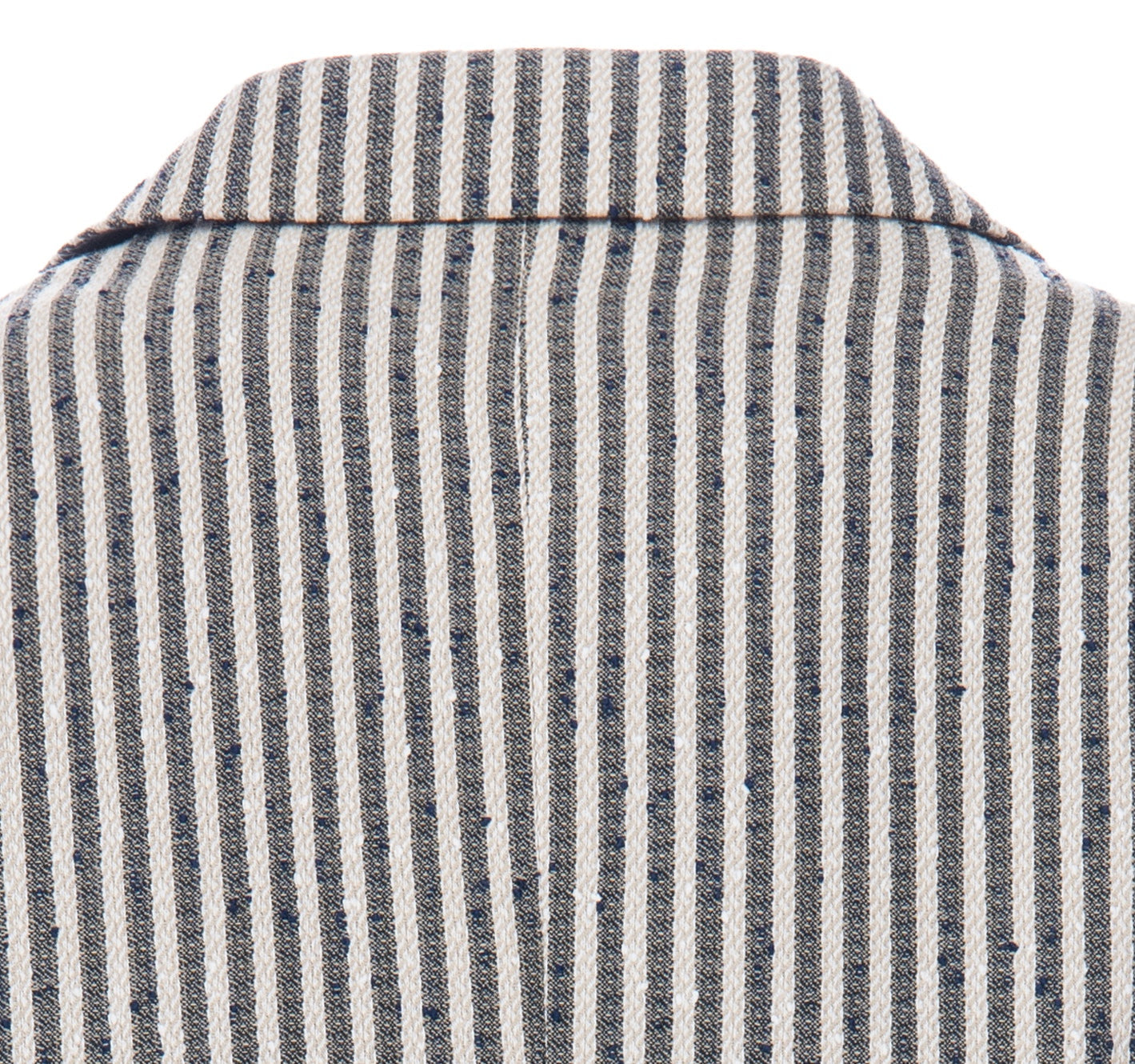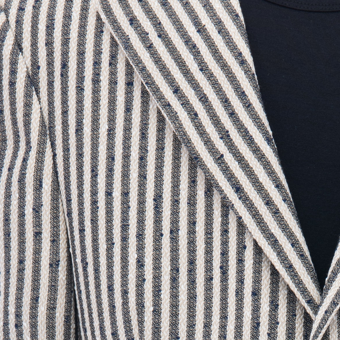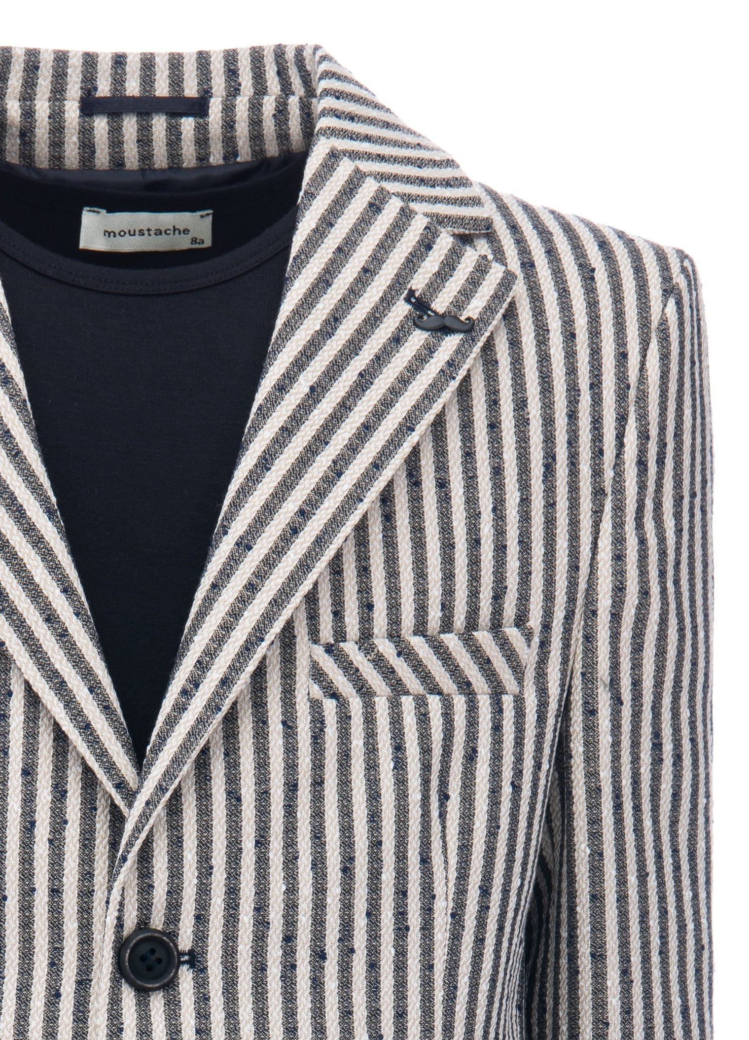 Beige Olivero striped casual dress outfit for kid boys from Moustache. This 3pc ensemble includes a blazer, t-shirt, and matching pants, providing a complete and stylish look for any occasion. The beige and navy striped peak lapel blazer features dual pockets and a double button closure, adding a touch of sophistication.