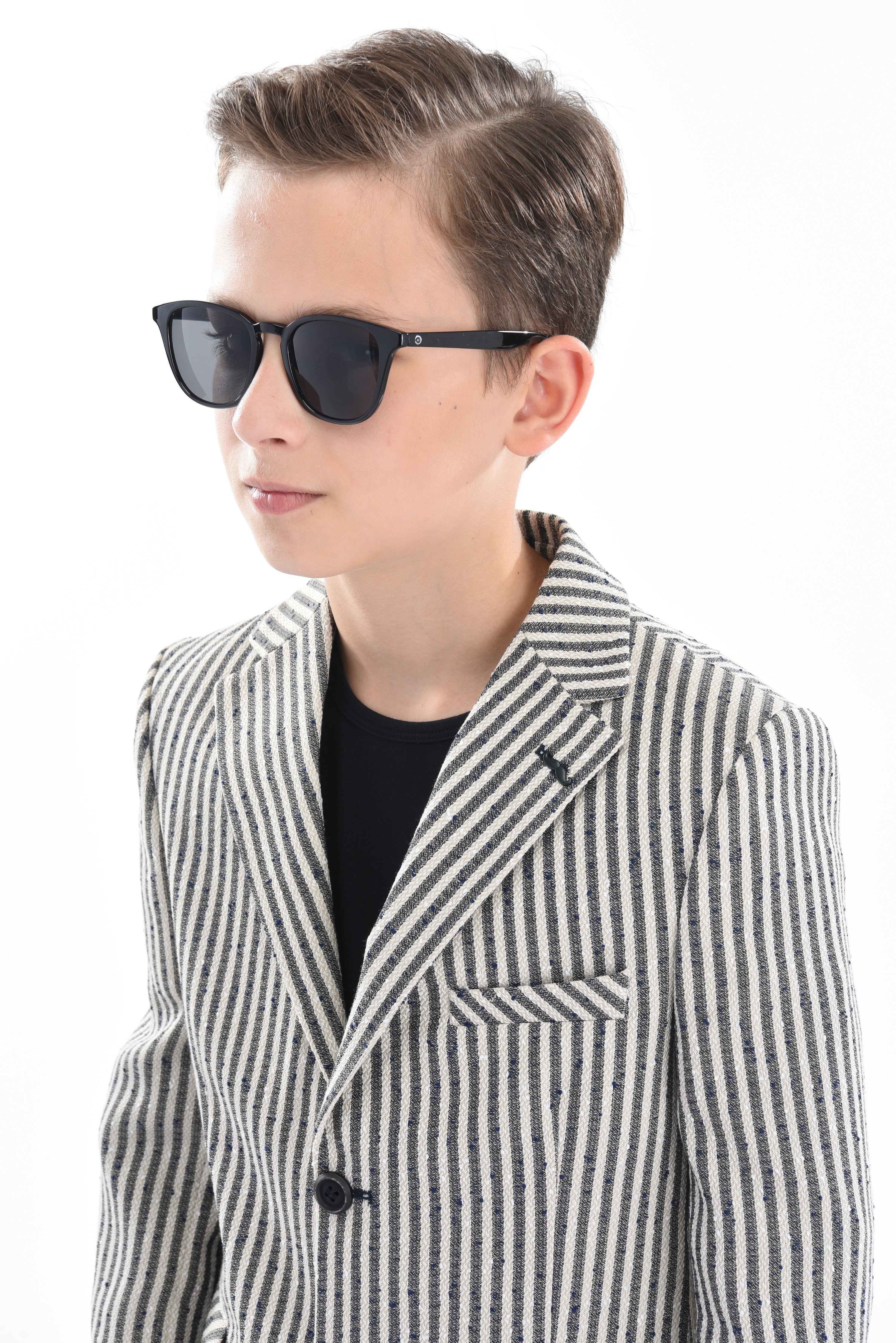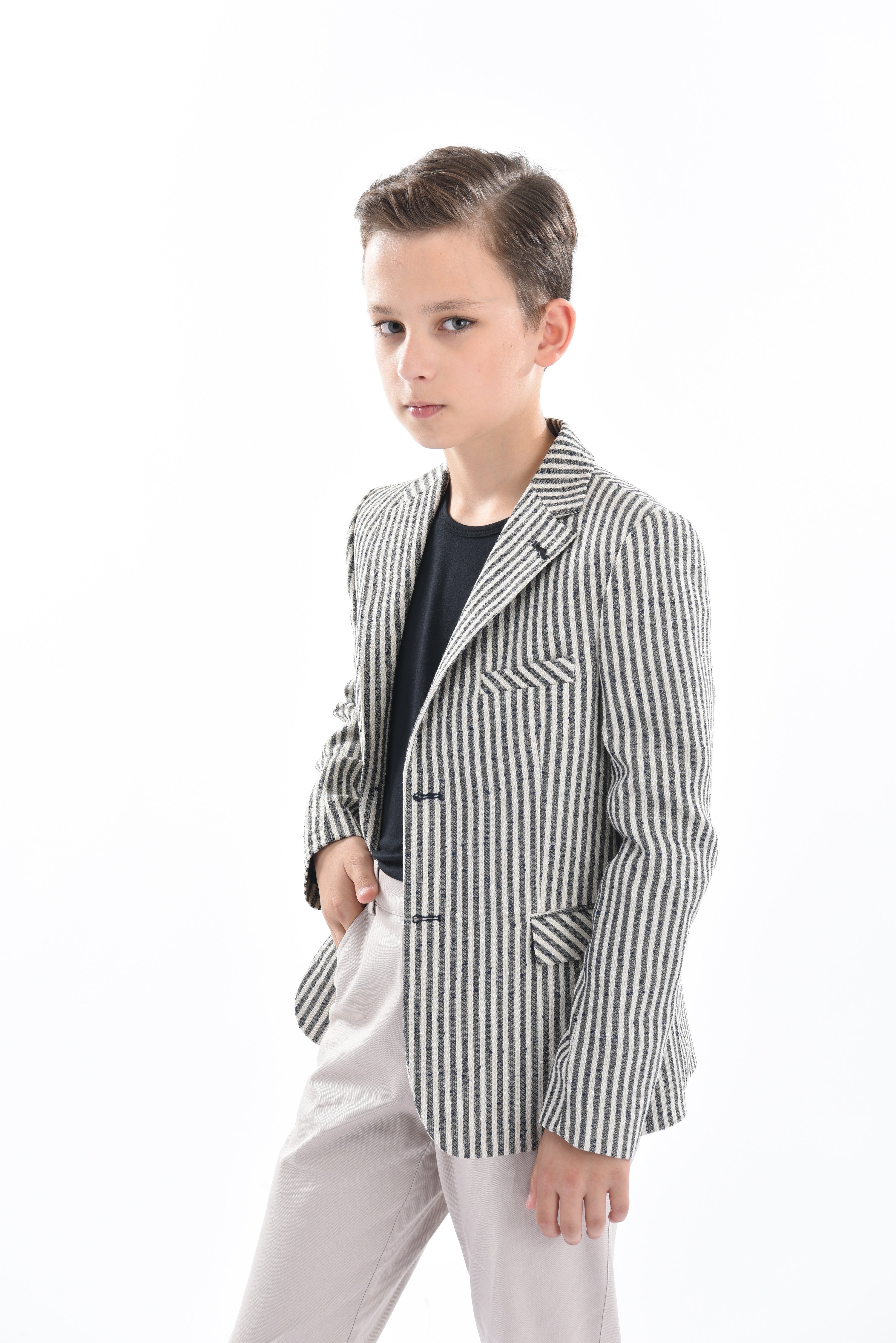 Furthermore, the beige Olivero striped casual outfit for kid boys from Moustache has lightweight fabric ensuring breathability. Keeping your child comfortable throughout the day. The classic design of the blazer, with its peak lapel and dual pockets, adds a timeless appeal. The black t-shirt provides a versatile and modern touch to the ensemble.