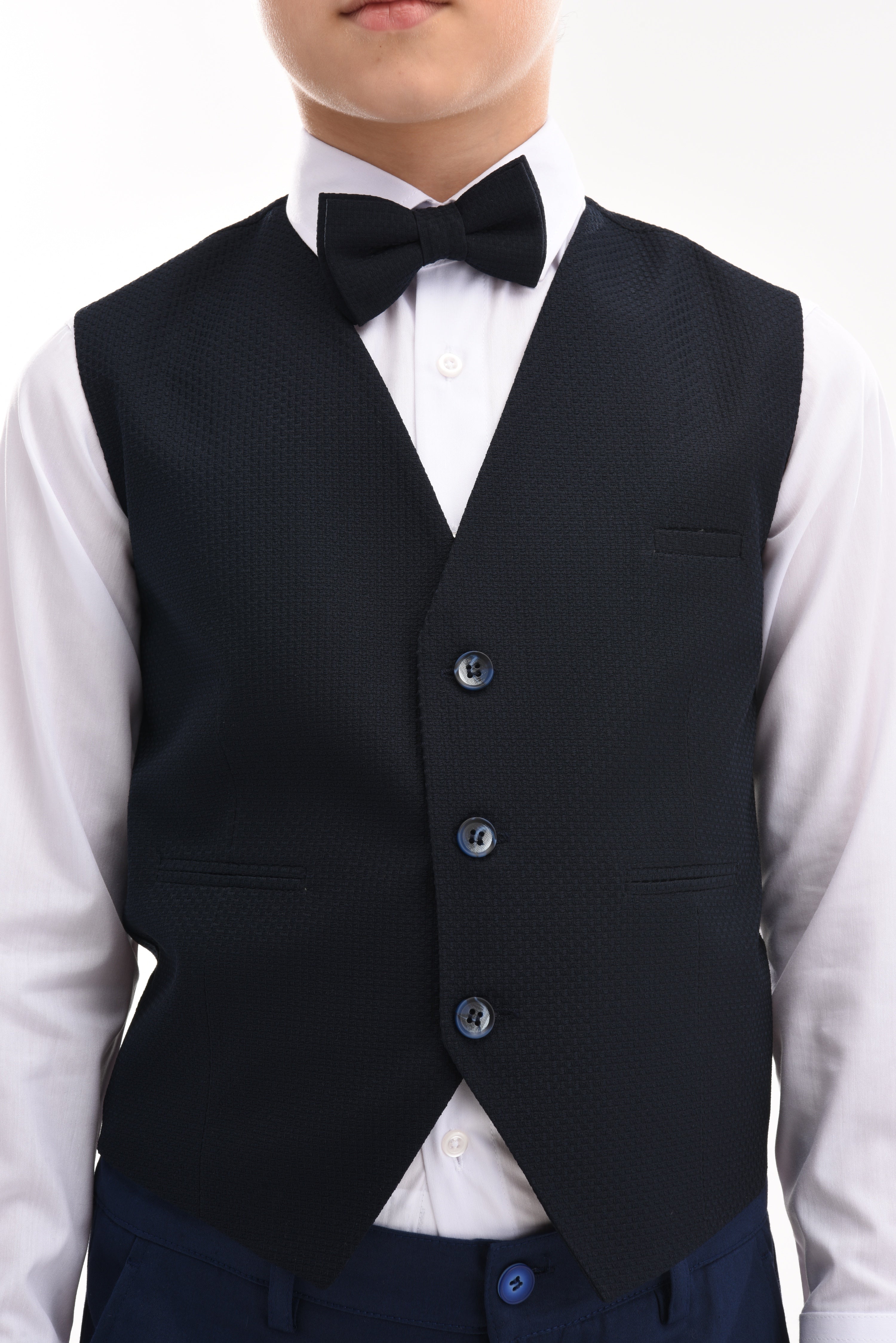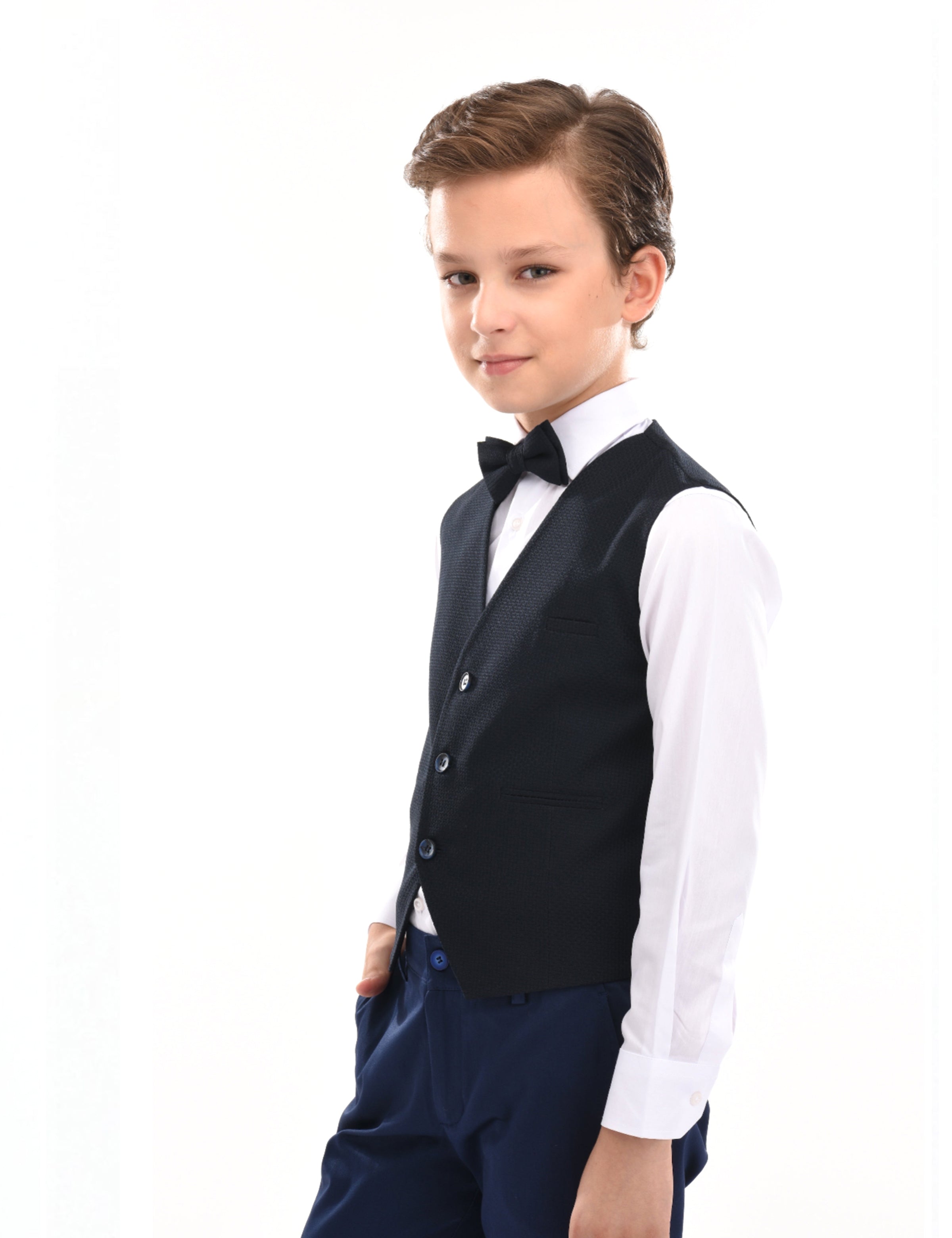Introducing the Benito Suit Vest Outfit Set for boys from Moustache. This stylish set includes a dapper solid navy colored vest with a three-button closure, a satin interior. An adjustable waist for the perfect fit! Paired with a matching bow tie, blue dress pants, and a crisp white dress shirt, this ensemble adds a touch of elegance to any outfit.