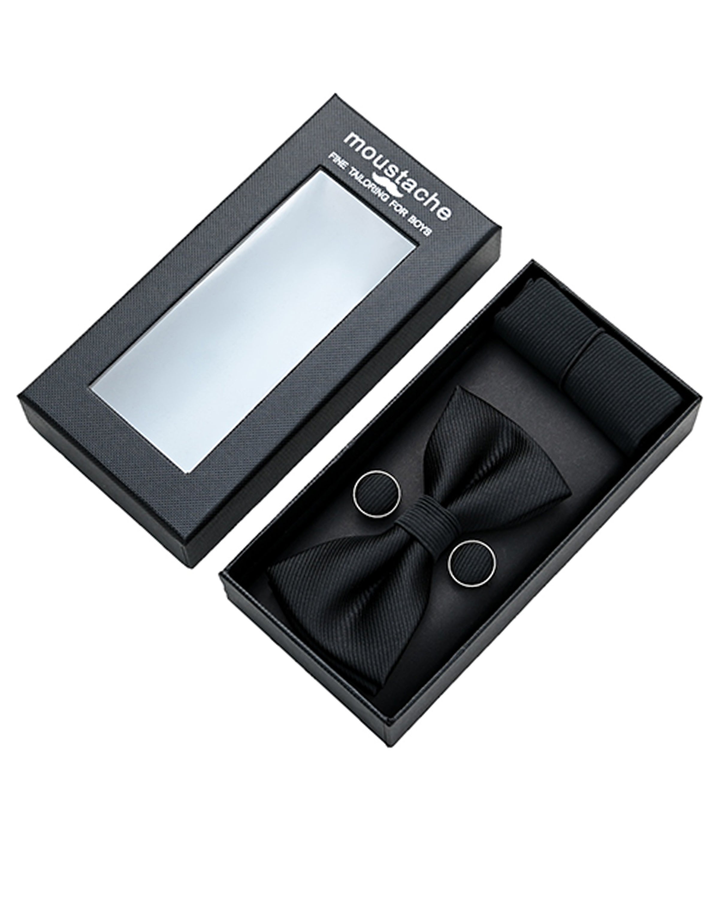 Versatility is at the heart of this set's design. Whether it's donned for a black-tie event, a formal dinner, or to add a touch of refinement to a smart casual ensemble, this black etched bowtie set complements various styles and occasions. Its adaptability guarantees your young man will always look impeccably dressed, regardless of the setting.