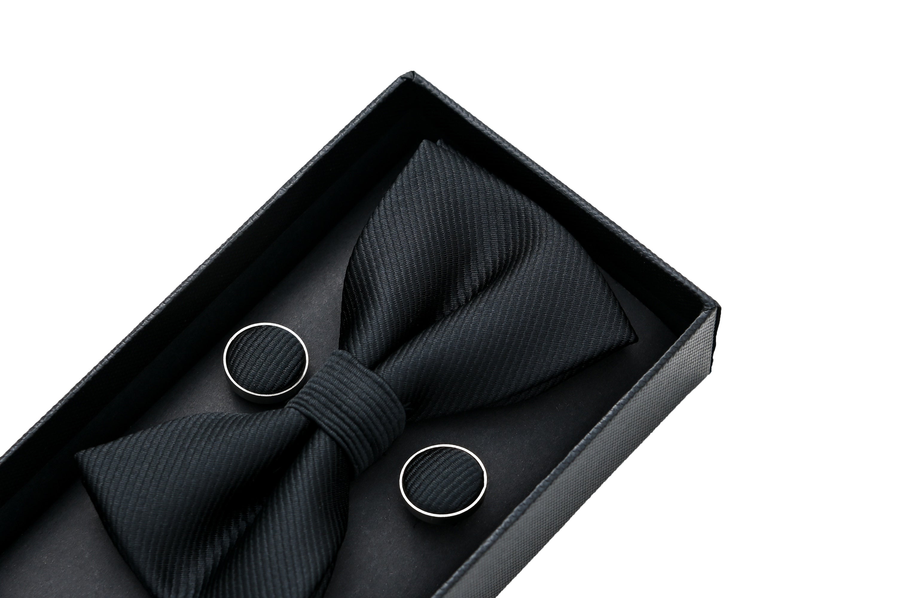 The bowtie showcases a distinguished black fabric with an intricate etched pattern, adding depth and understated texture to any outfit. When paired with the matching cufflinks and pocket square, this set creates a polished, cohesive look that exudes classic style.