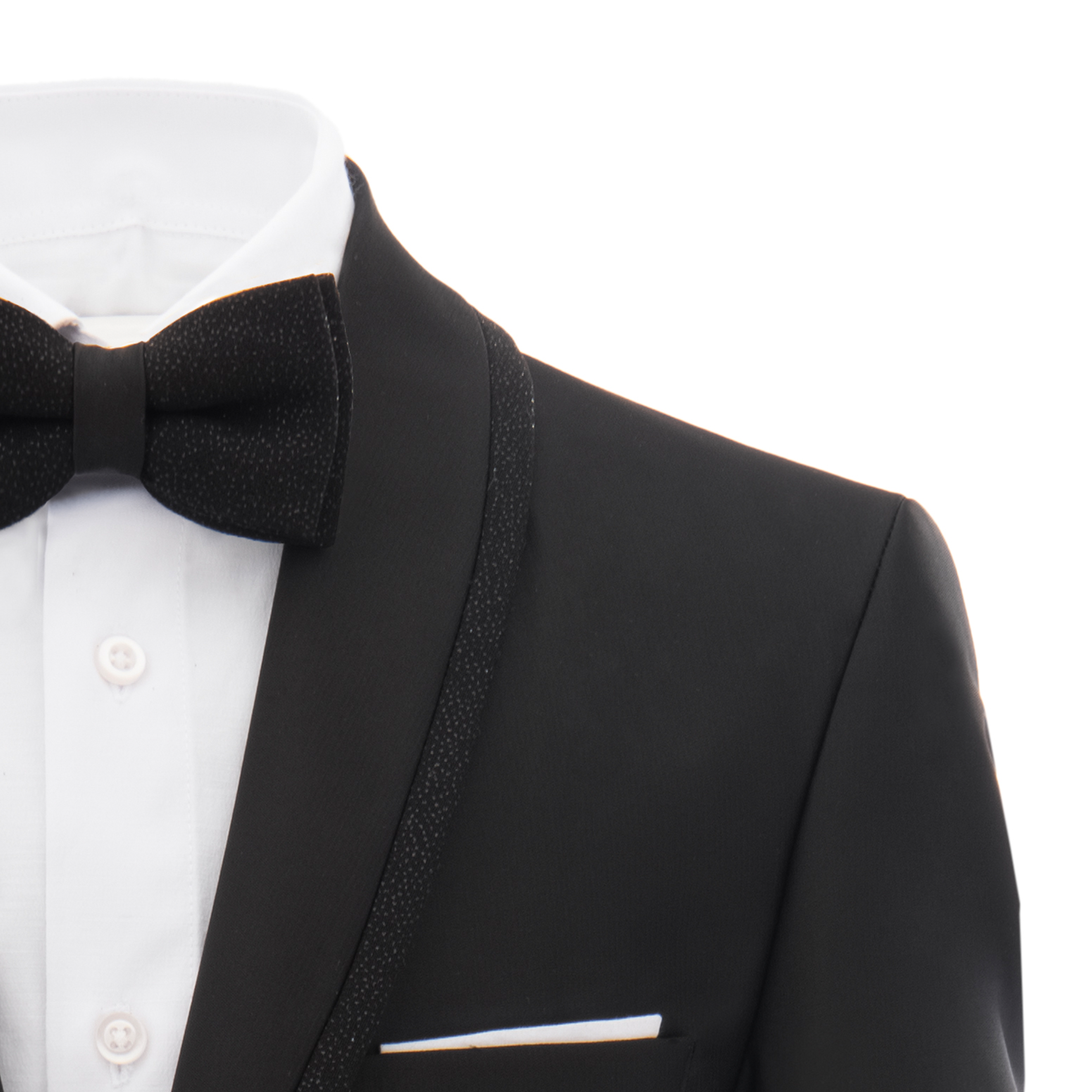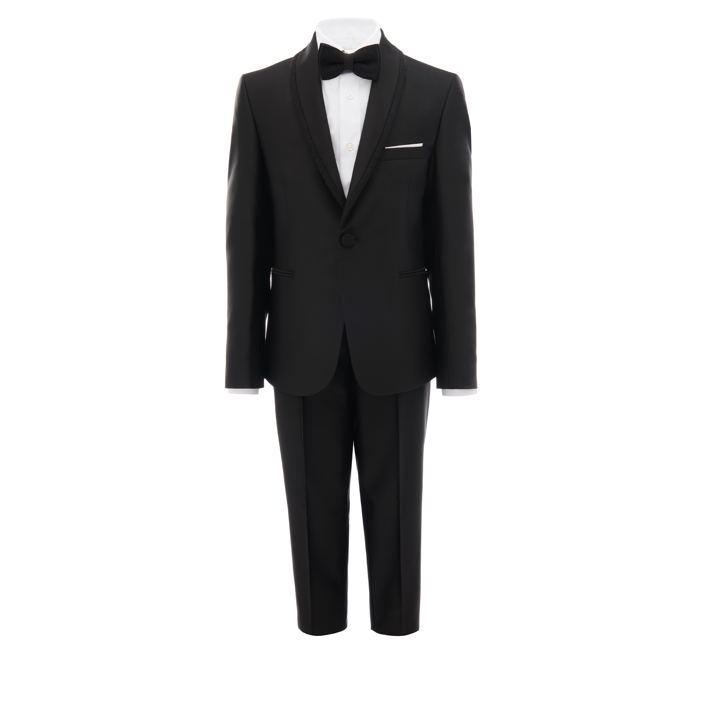 Make your child's special occasions unforgettable with the black glitter trim 4pc peak lapel suit for kid boys from Moustache. This exquisite set includes a white classic dress shirt, a black shawl lapel blazer with eye-catching black glitter trim. Truly this is a completed with a classic black bow tie, adding a touch of elegance.