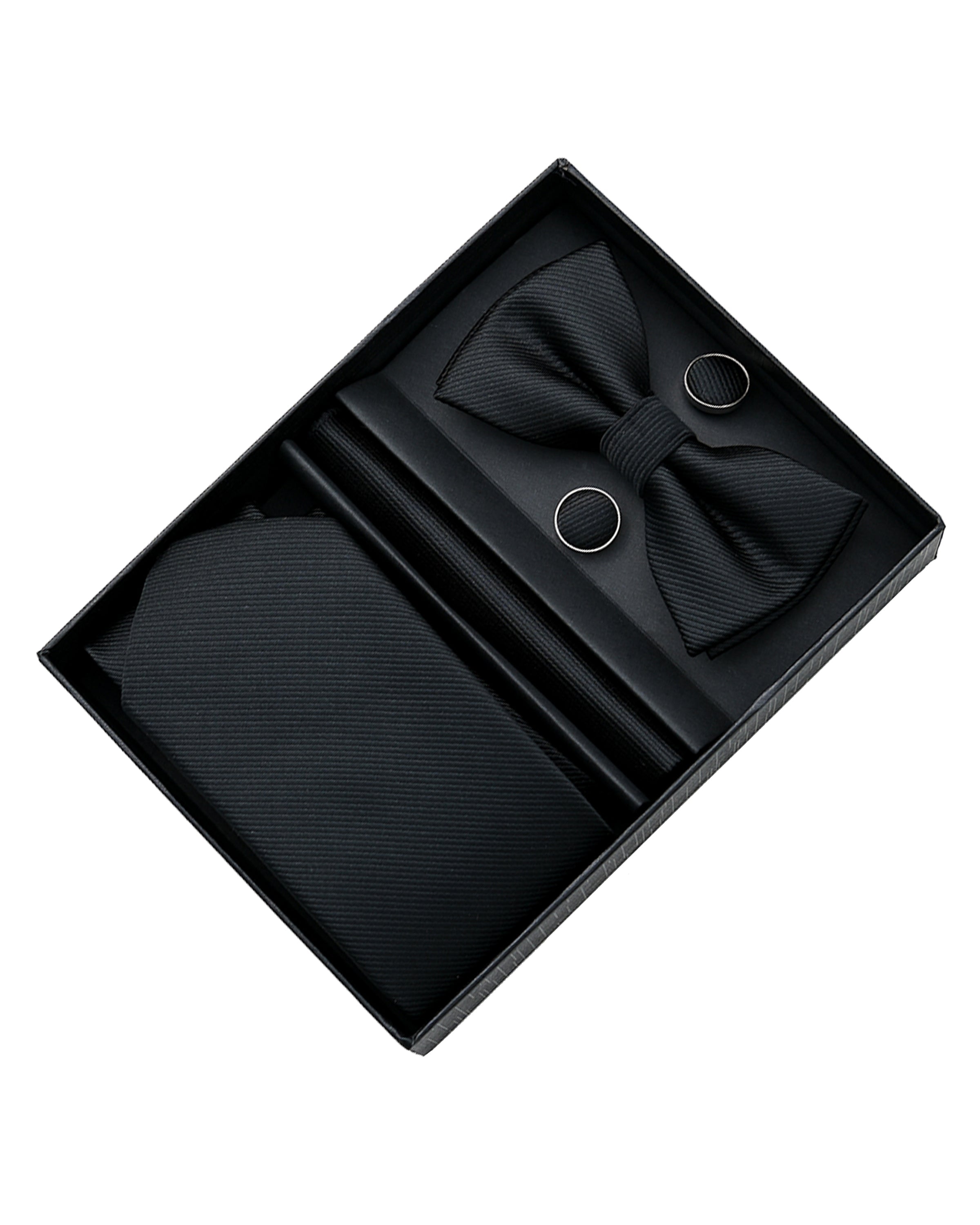 - Set includes matching tie, bowtie, pocket square, and cufflinks