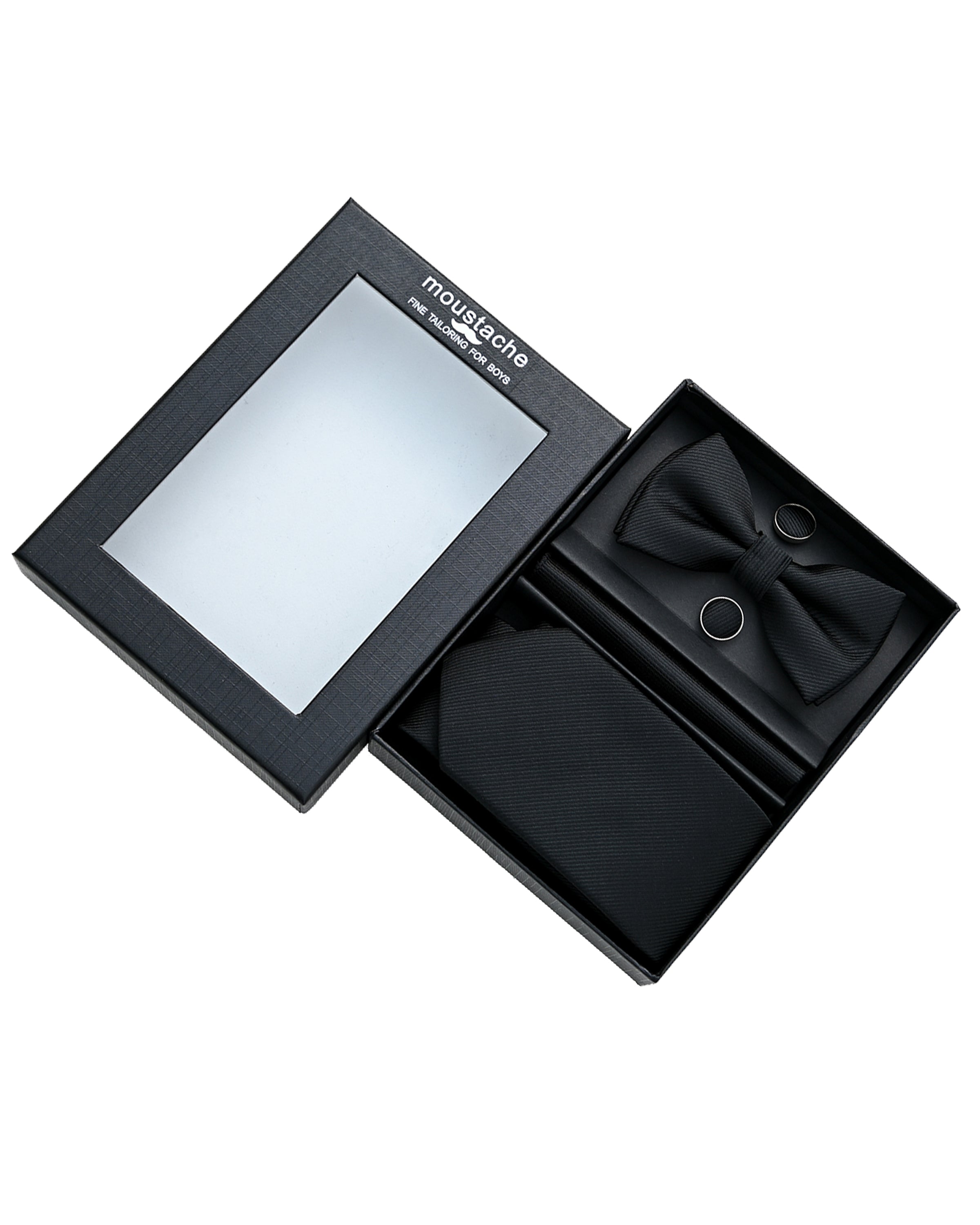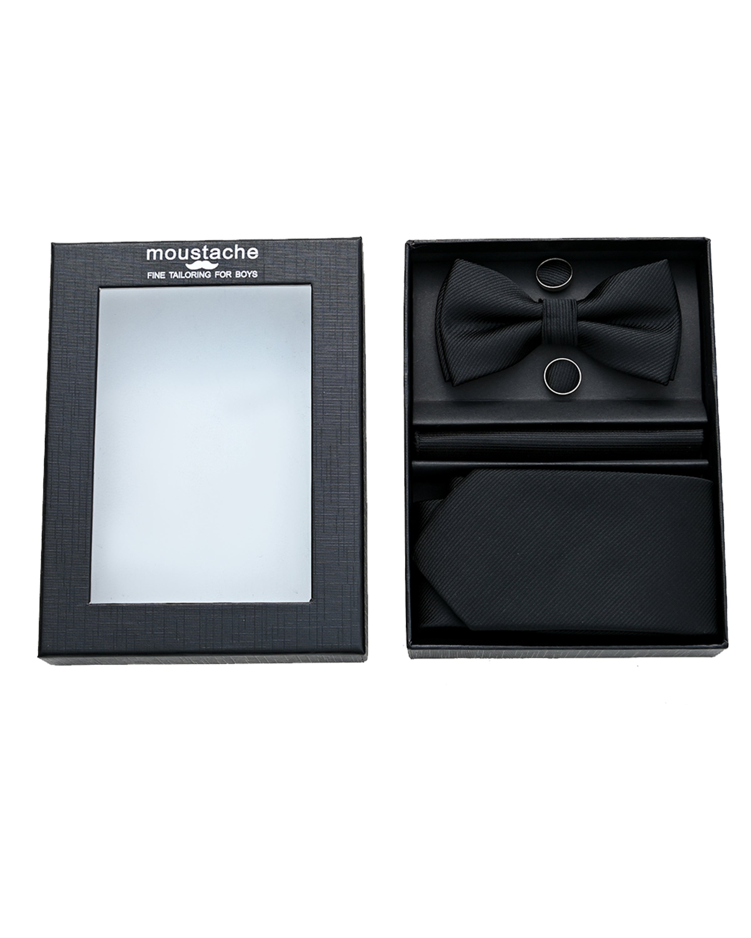Crafted from premium materials, this black textured tie set caters to a wide range of sizes and style preferences. The tie and bowtie are easy to knot and adjust, providing both style and practicality for your young gentleman. The included pocket square and cufflinks add extra touches of refinement to complete the ensemble.