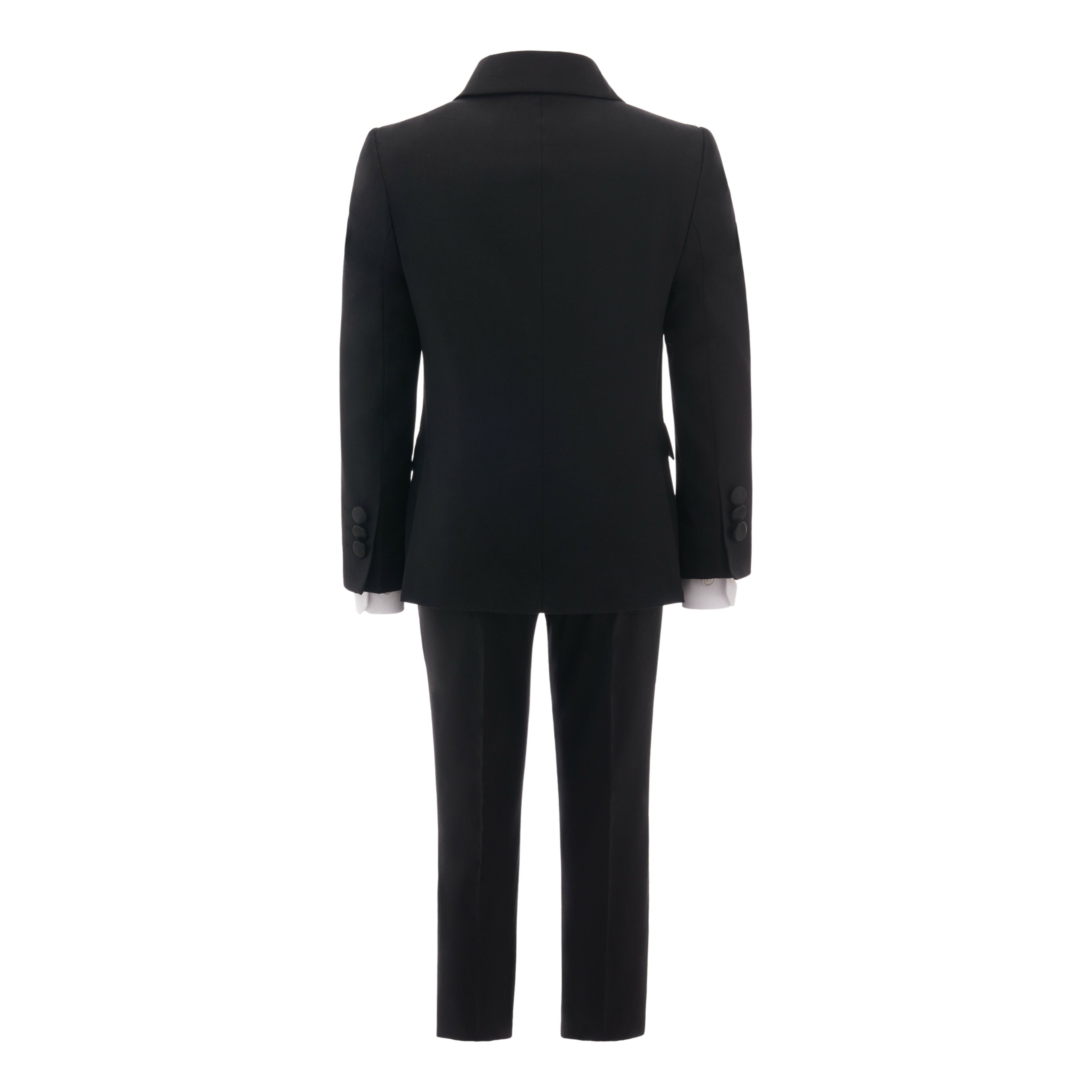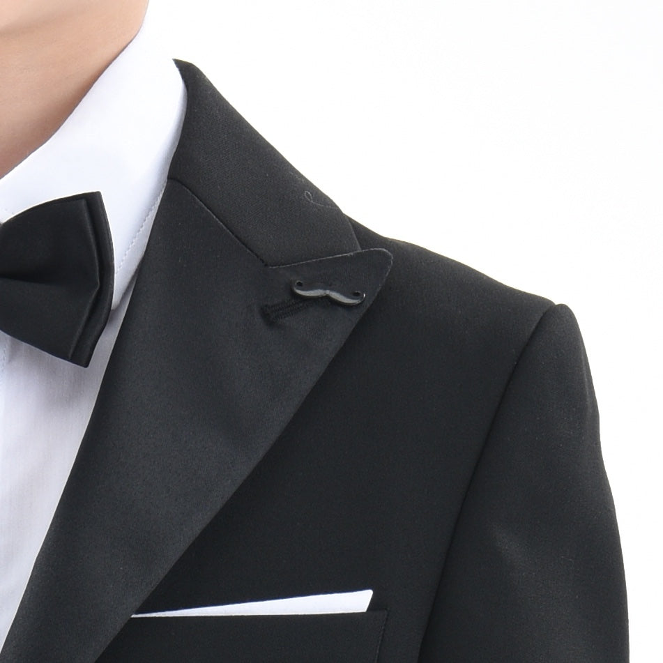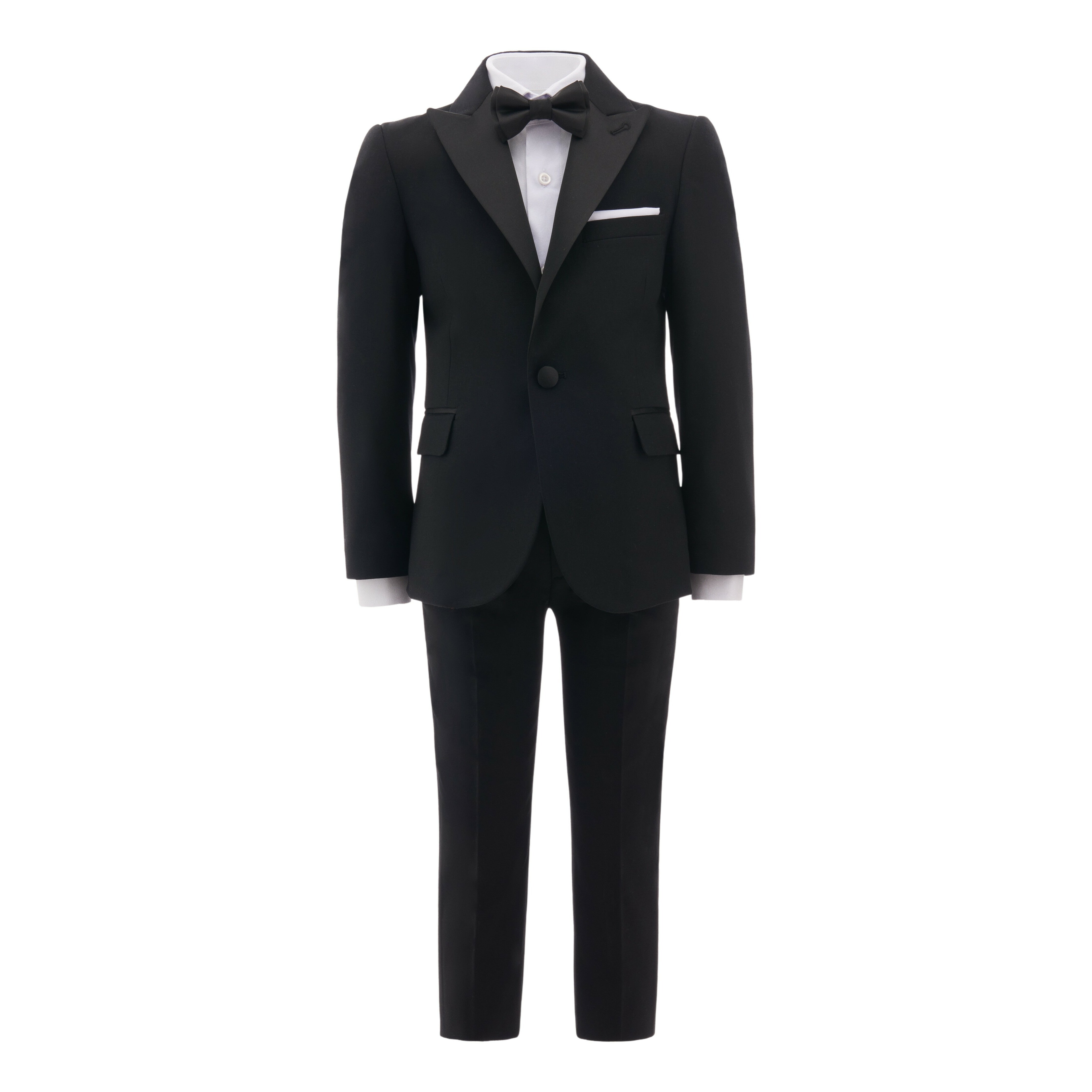 Make a statement with the black peak lapel tuxedo with one button for kid boys from Moustache. This stylish suit features a white classic dress shirt, a black peak lapel blazer, and formal straight trousers. Finalized with a classic black bow tie.