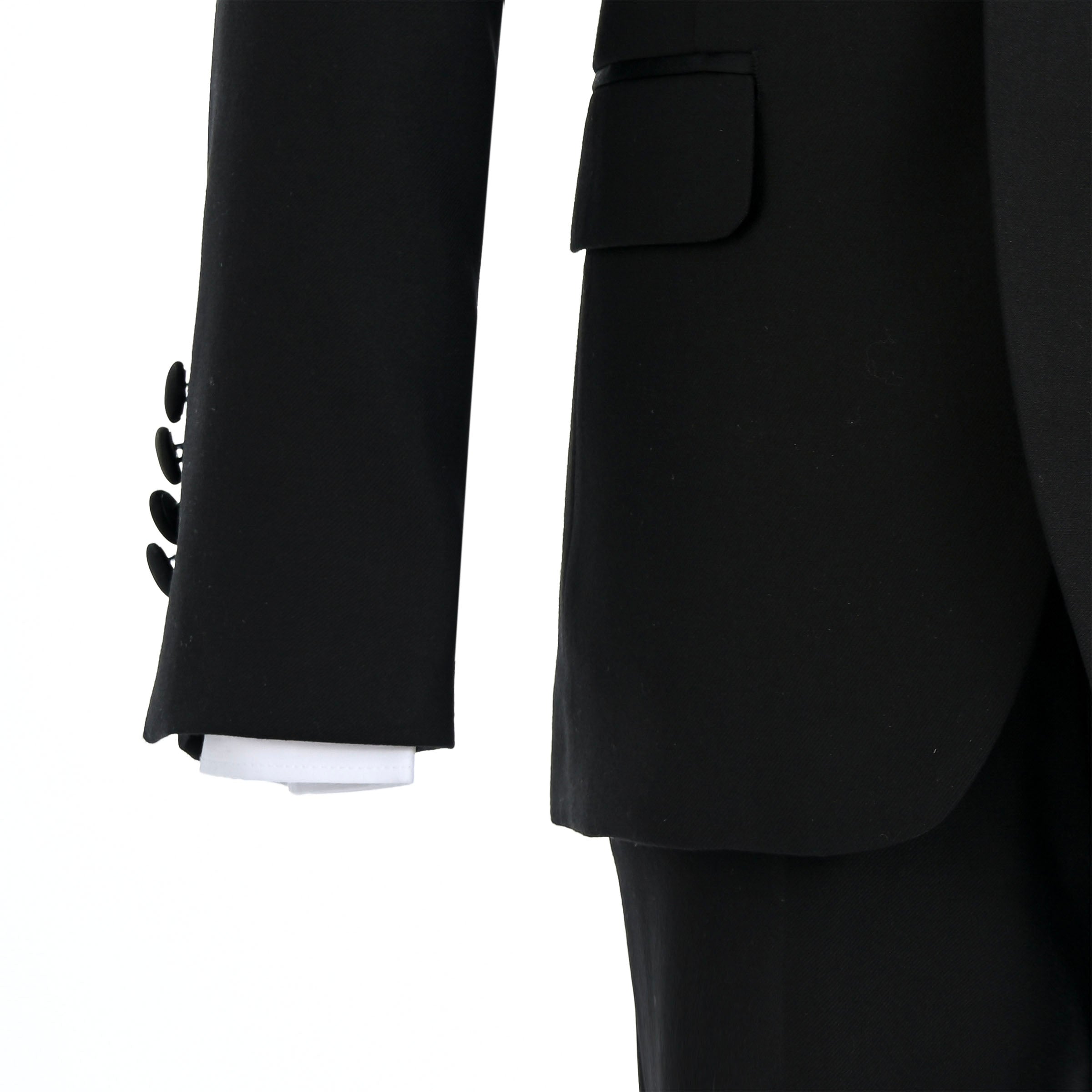 Perfect for special occasions, this expertly tailored Black Peak Lapel Trim Wool Suit delivers sophisticated style with modern refinement. Crafted from a premium wool blend fabric, this suit offers both comfort and durability while maintaining a polished appearance throughout any formal event.