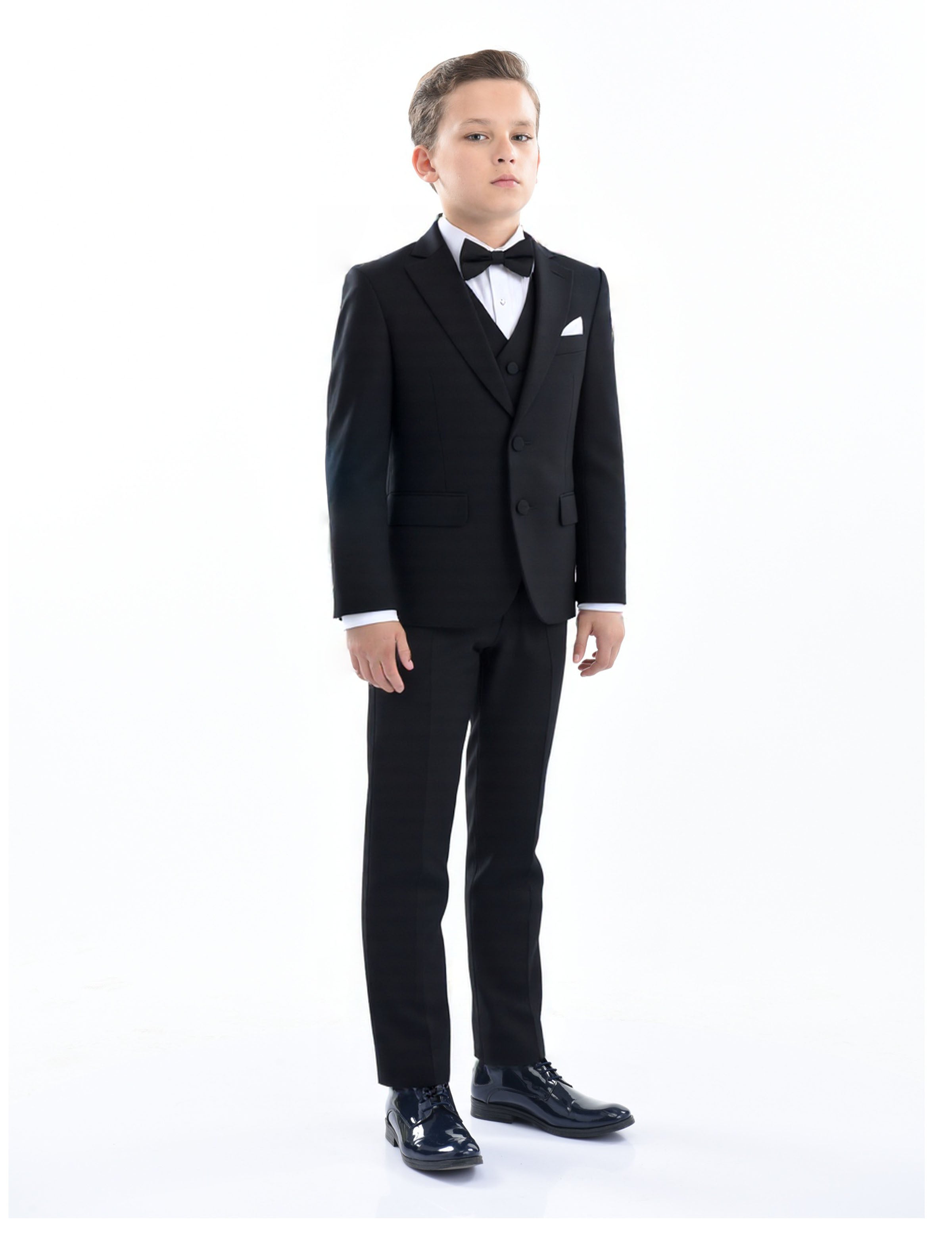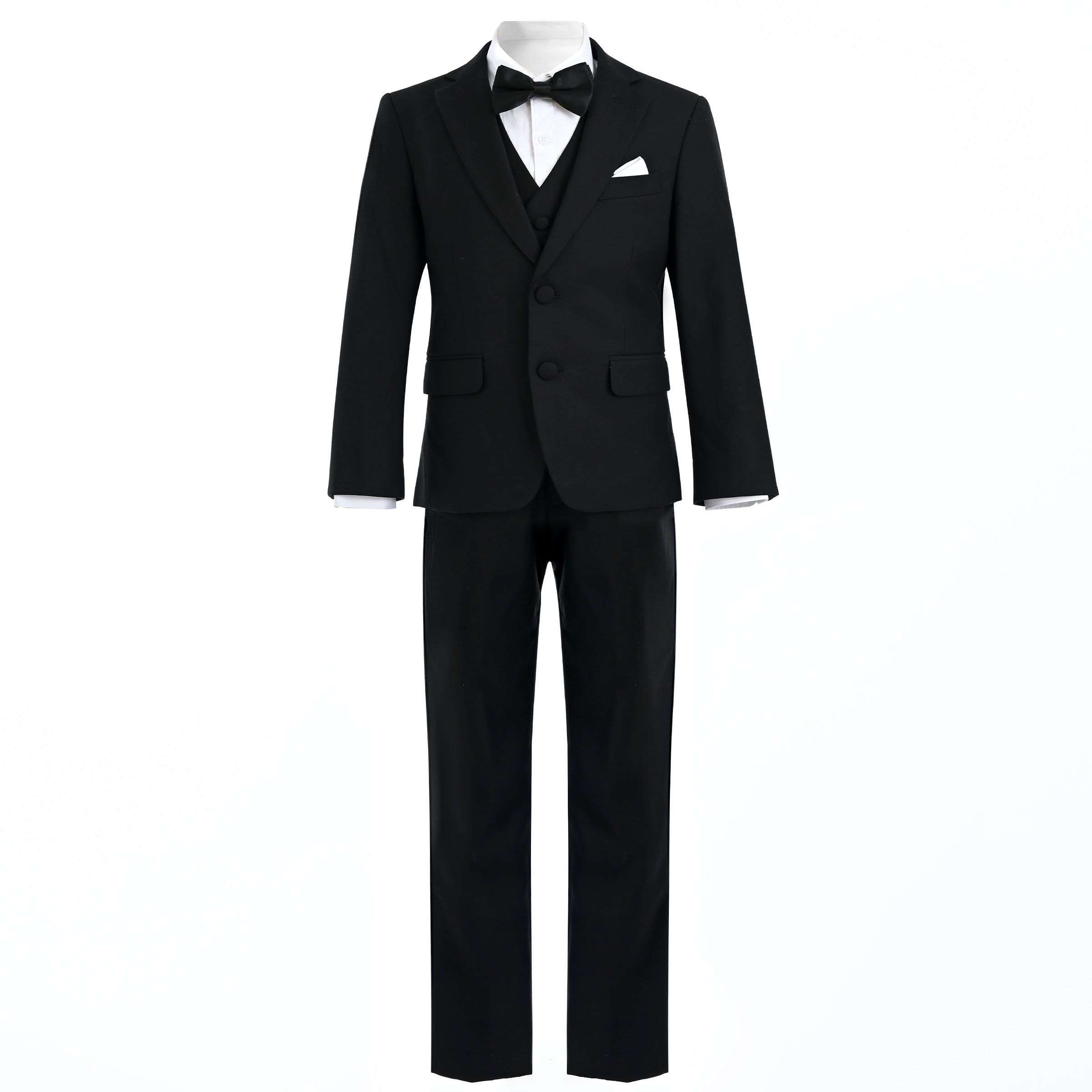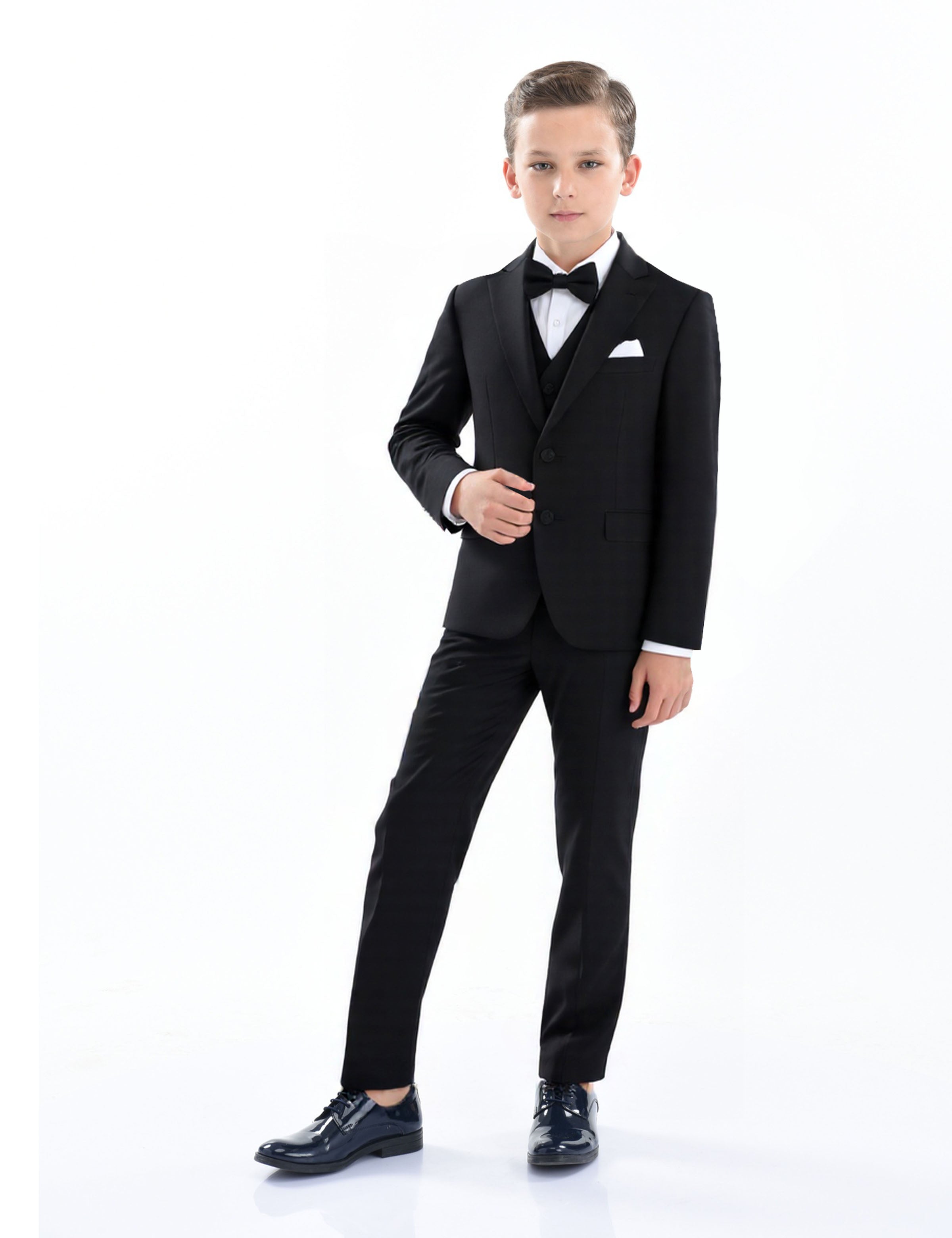 Designed for timeless elegance, the Black Suit Peak Lapel Tuxedo Set by Moustache is a refined five-piece ensemble, perfect for formal occasions. The sleek black blazer features a classic peak lapel, adding a sophisticated touch, while the crisp white dress shirt and adjustable vest ensure a polished, tailored look. The flat-front slim-fit pants, complete with an adjustable waistband, provide both comfort and modern style.