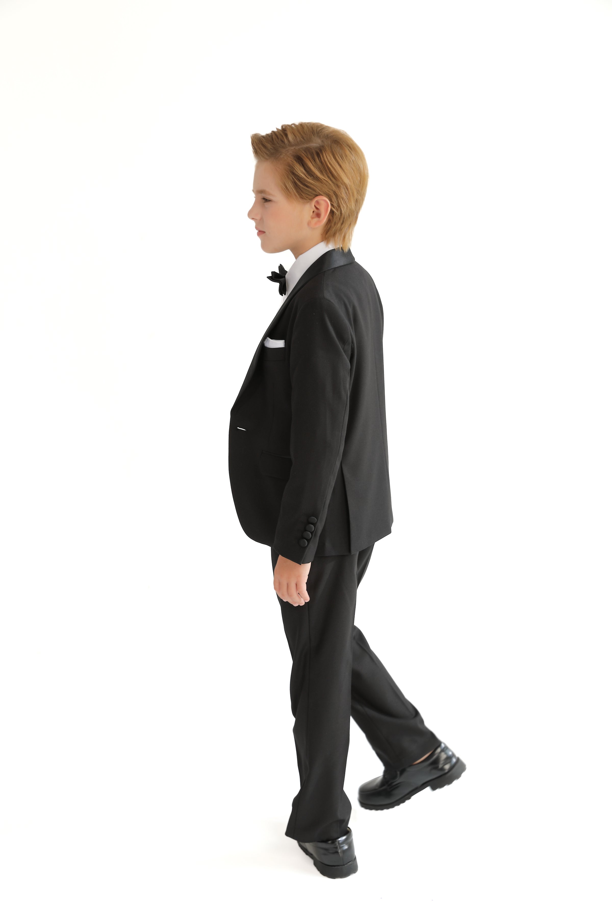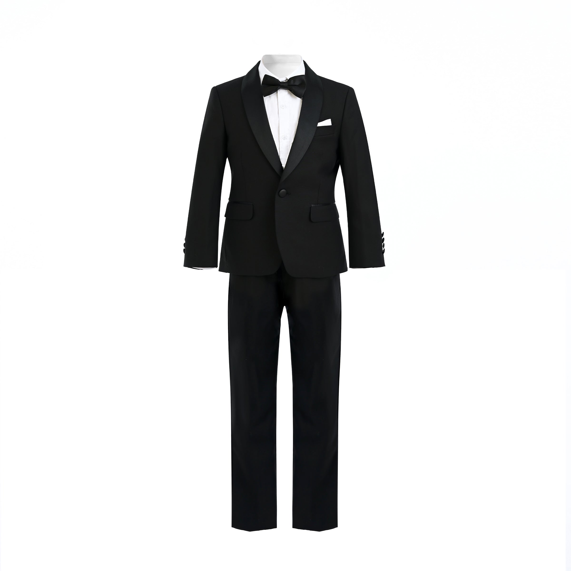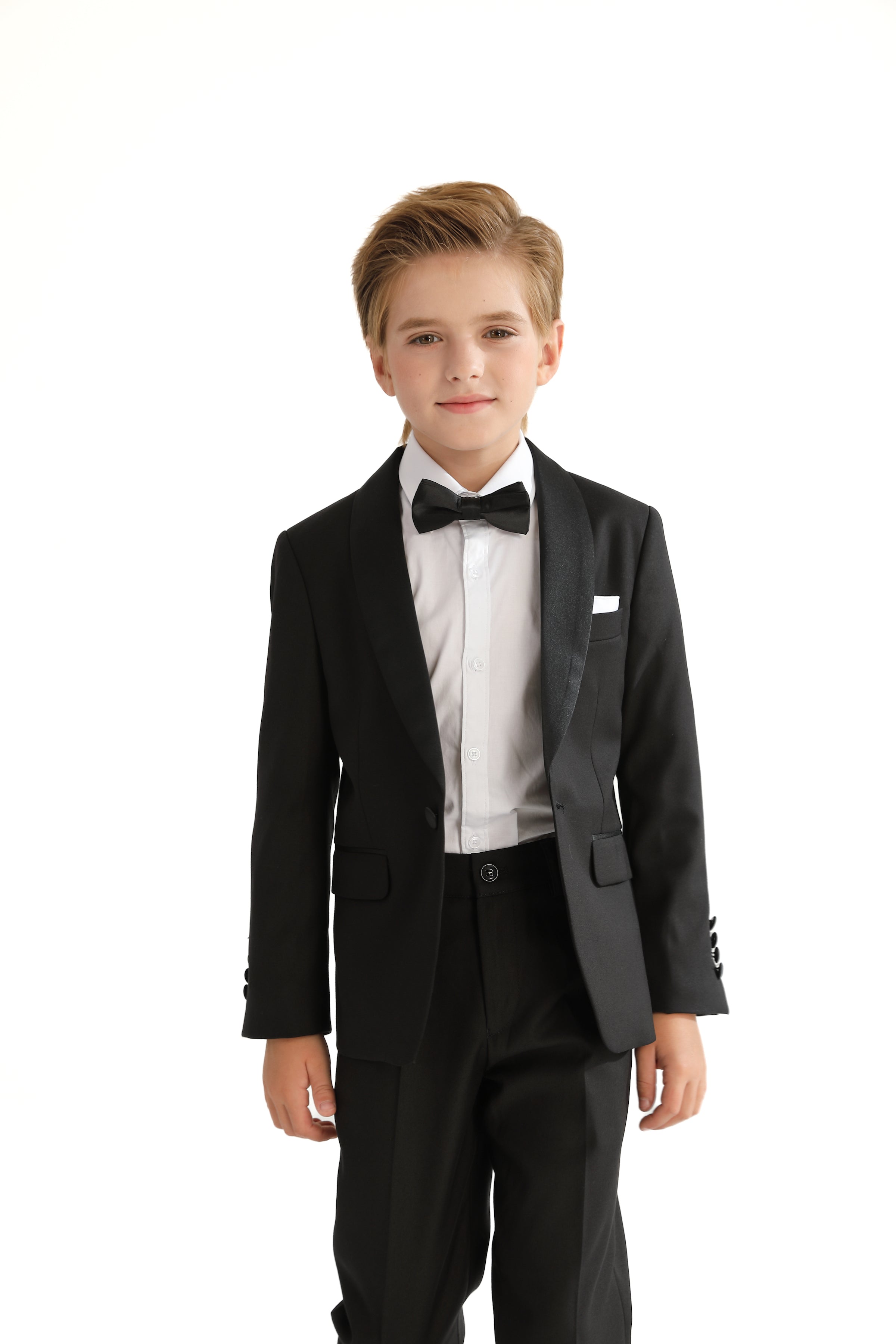 Elevate your young gentleman's wardrobe with our exquisite Black Shawl Lapel Wool Suit, a perfect blend of timeless elegance and modern style. This dapper ensemble includes a sophisticated blazer, crisp dress shirt, matching pants, and a charming bowtie, all designed to make your little man the star of any formal occasion.