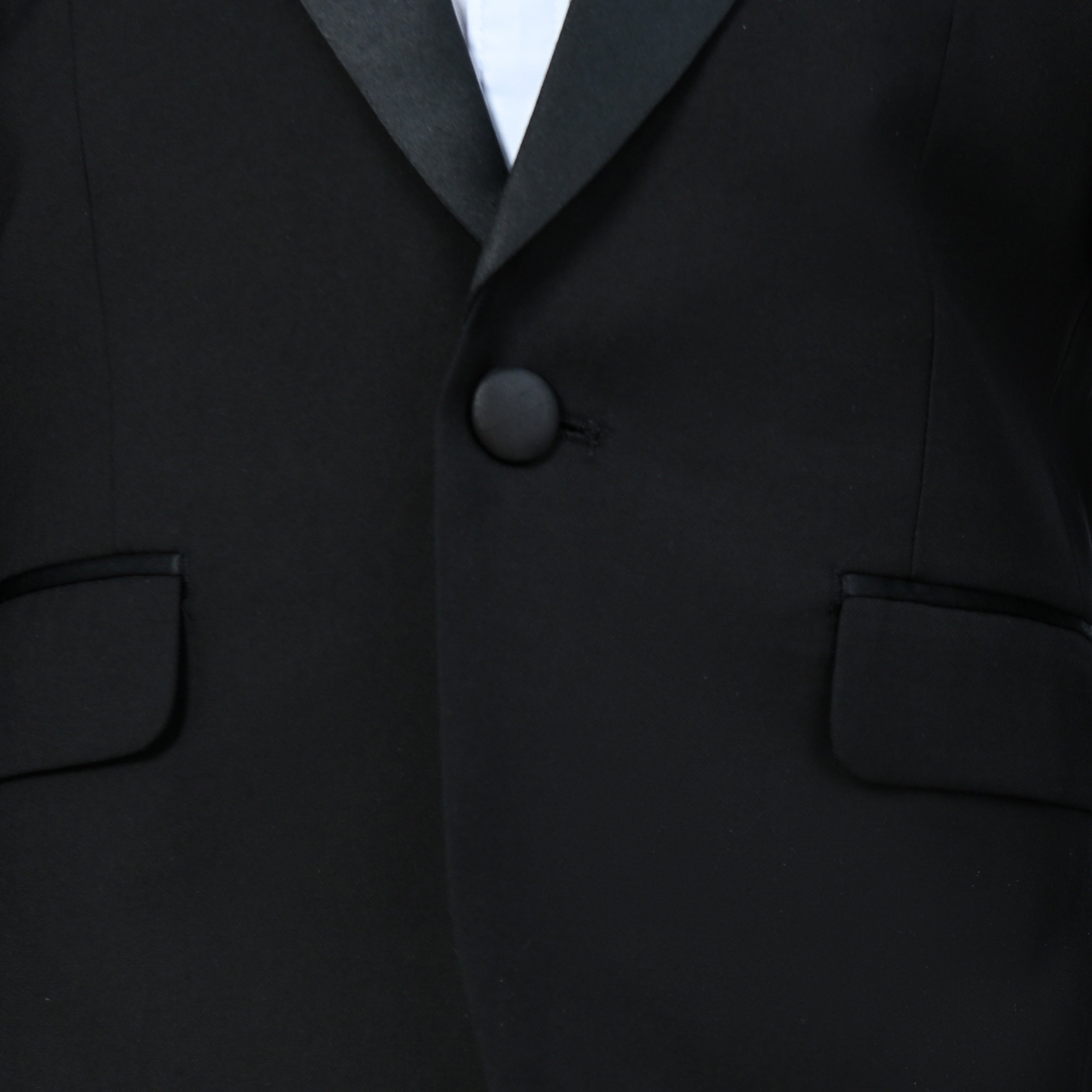 Crafted from a premium wool blend, the suit offers both comfort and durability, ensuring he looks sharp throughout the event. The blazer features a distinctive shawl lapel adorned with sleek black trim, adding a touch of contemporary flair to the classic silhouette. A single button closure provides a streamlined look, while dual front pockets offer both style and functionality. Inside, a full lining ensures comfort and helps the blazer retain its shape.