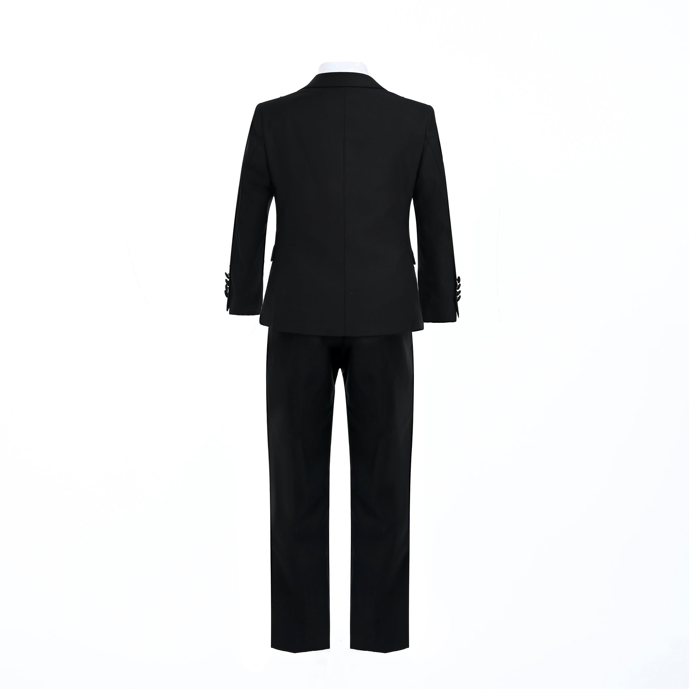 The coordinating pants boast an elastic waistband for ease of movement, along with a front zip fly and button closure that give a grown-up feel. A crisp, wrinkle-resistant dress shirt completes the look, featuring easy-to-manage buttons and adjustable cuffs. The pre-tied bowtie adds a final touch of charm, easily adjustable for the perfect fit. Whether he's playing the role of ring bearer, attending a wedding, or dressing up for a holiday celebration, this Black Shawl Lapel Wool Suit will have him looking impeccably styled.