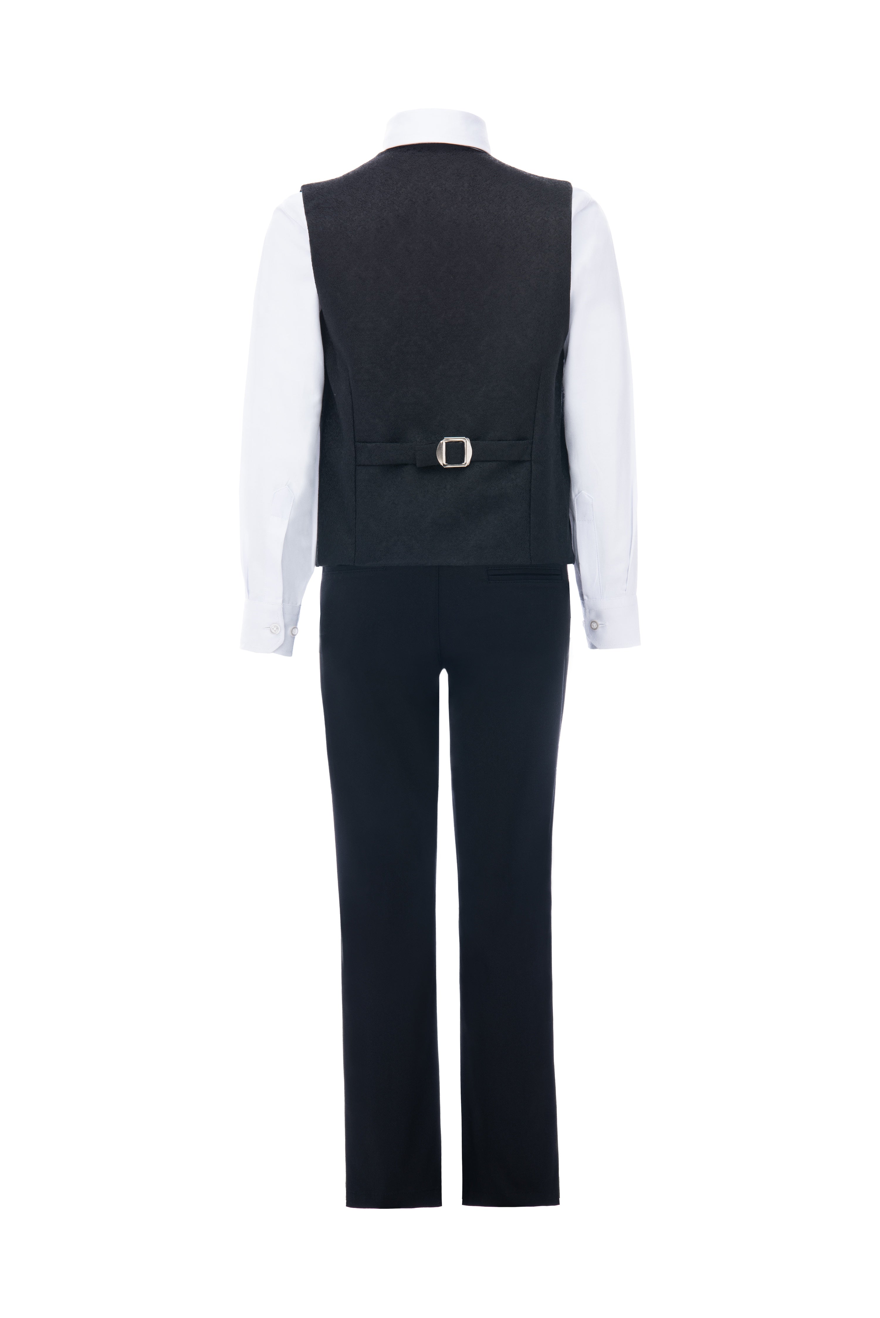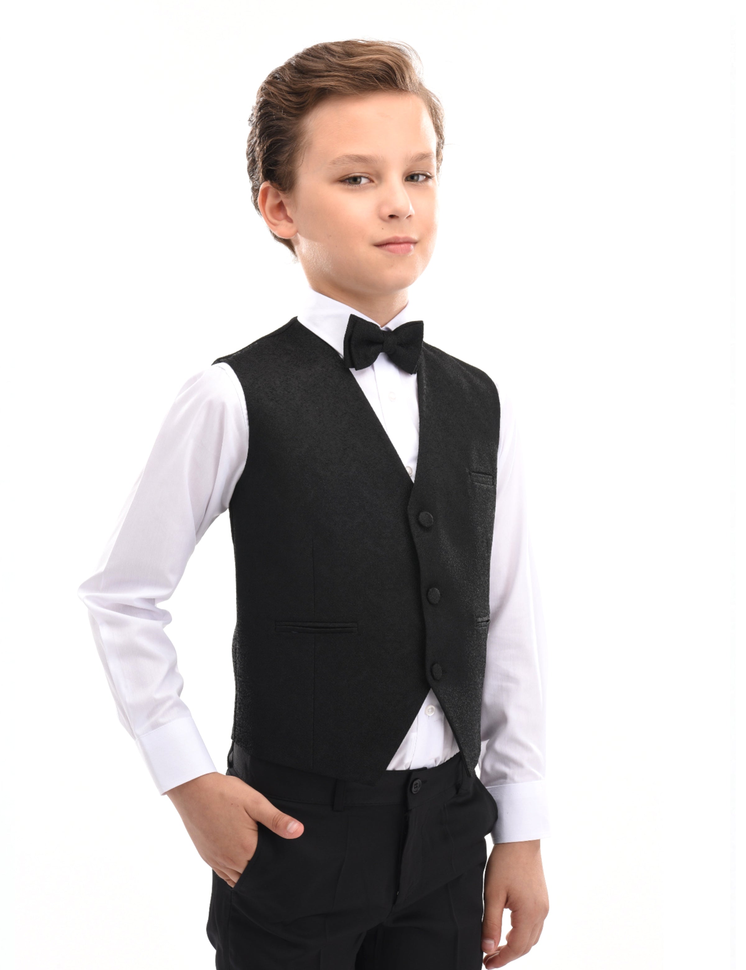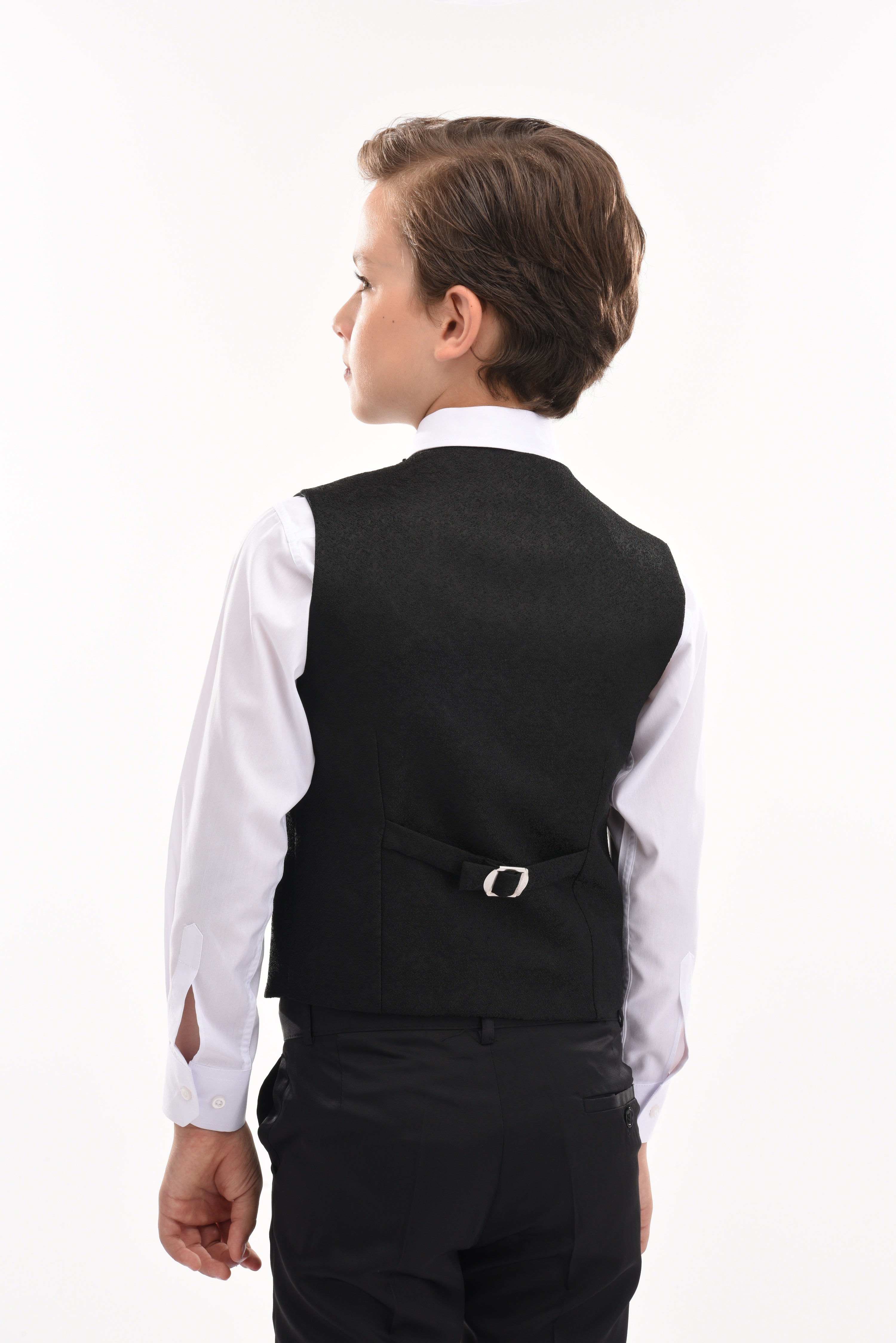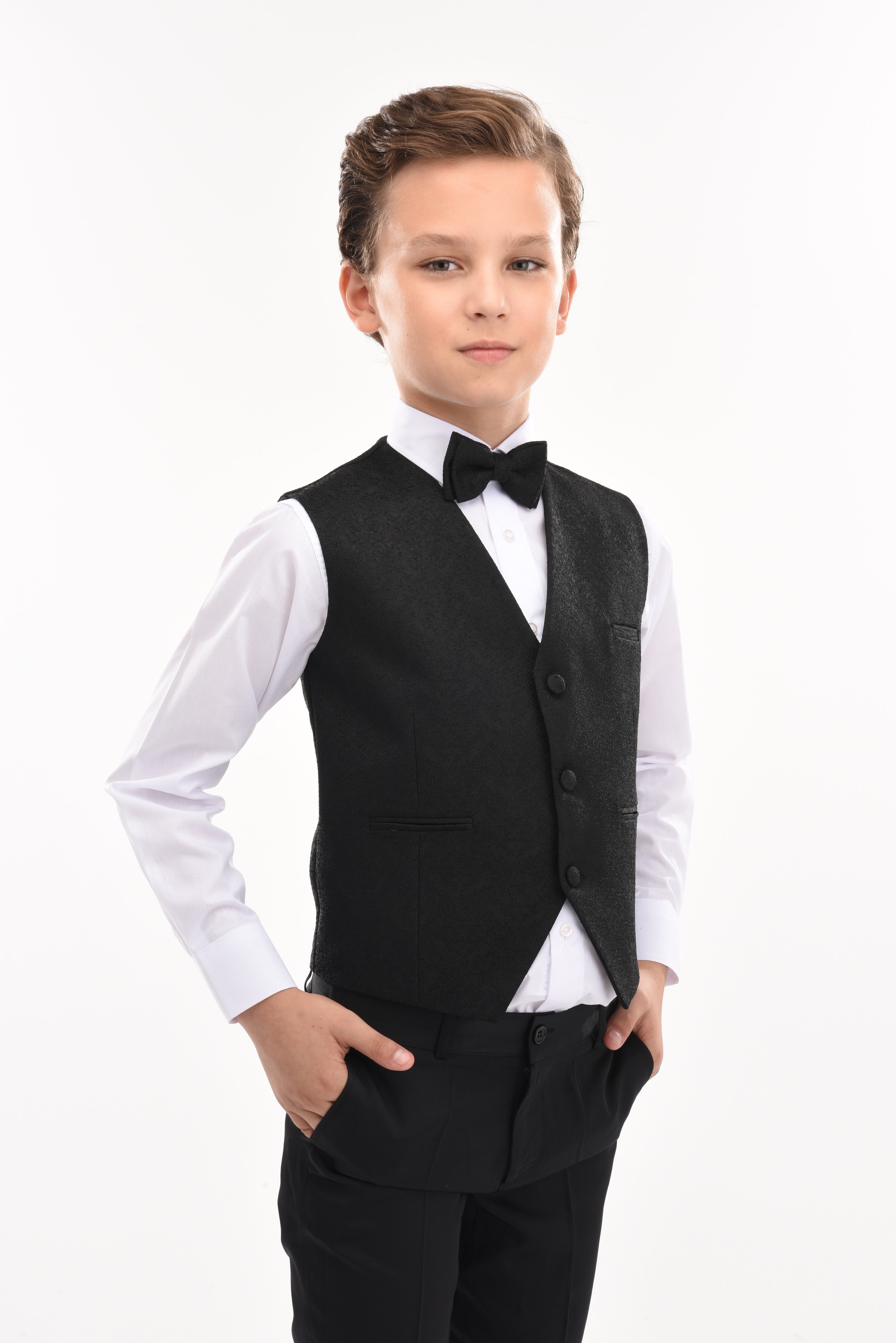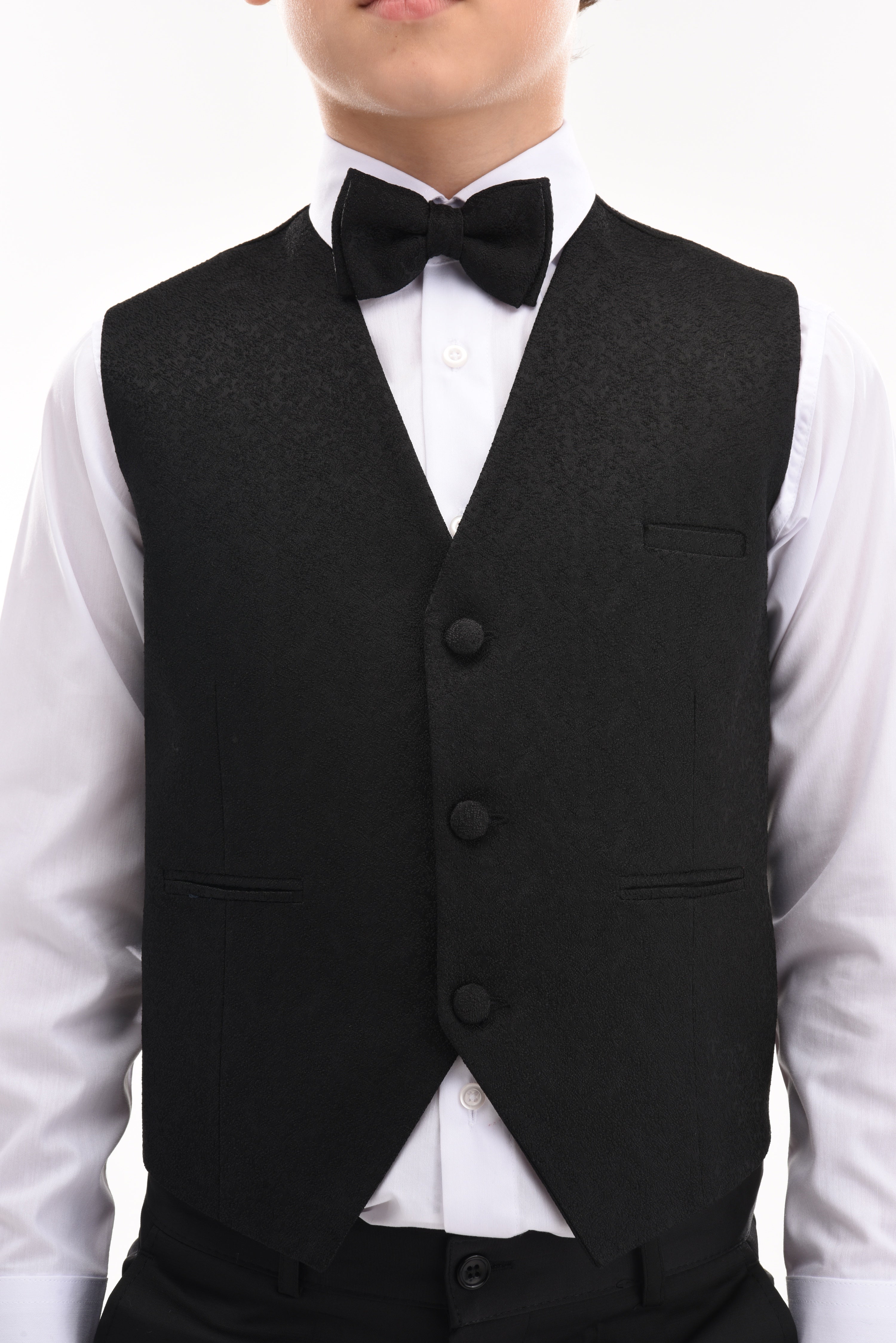 Introducing the Zenon Suit Vest Outfit Set for boys from Moustache. This stylish set includes a dapper black colored vest with a three-button closure, a satin interior. An adjustable waist for the perfect fit! Paired with a matching bow tie, black dress pants, and a crisp white dress shirt, this ensemble adds a touch of elegance to any outfit.