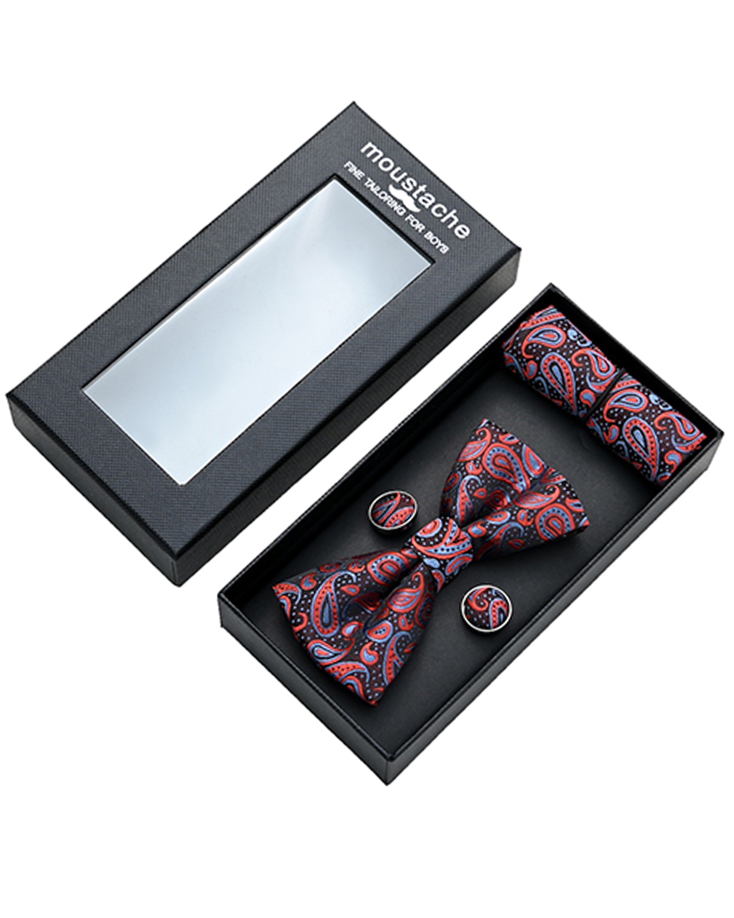 Crafted from premium materials, the Blue and Red Paisley Bowtie Set features an adjustable neck strap. Ensuring a comfortable fit for all sizes. Moreover, our cufflinks are designed for easy and secure attachment to shirt cuffs. This provides both style and practicality for your young gentleman.
