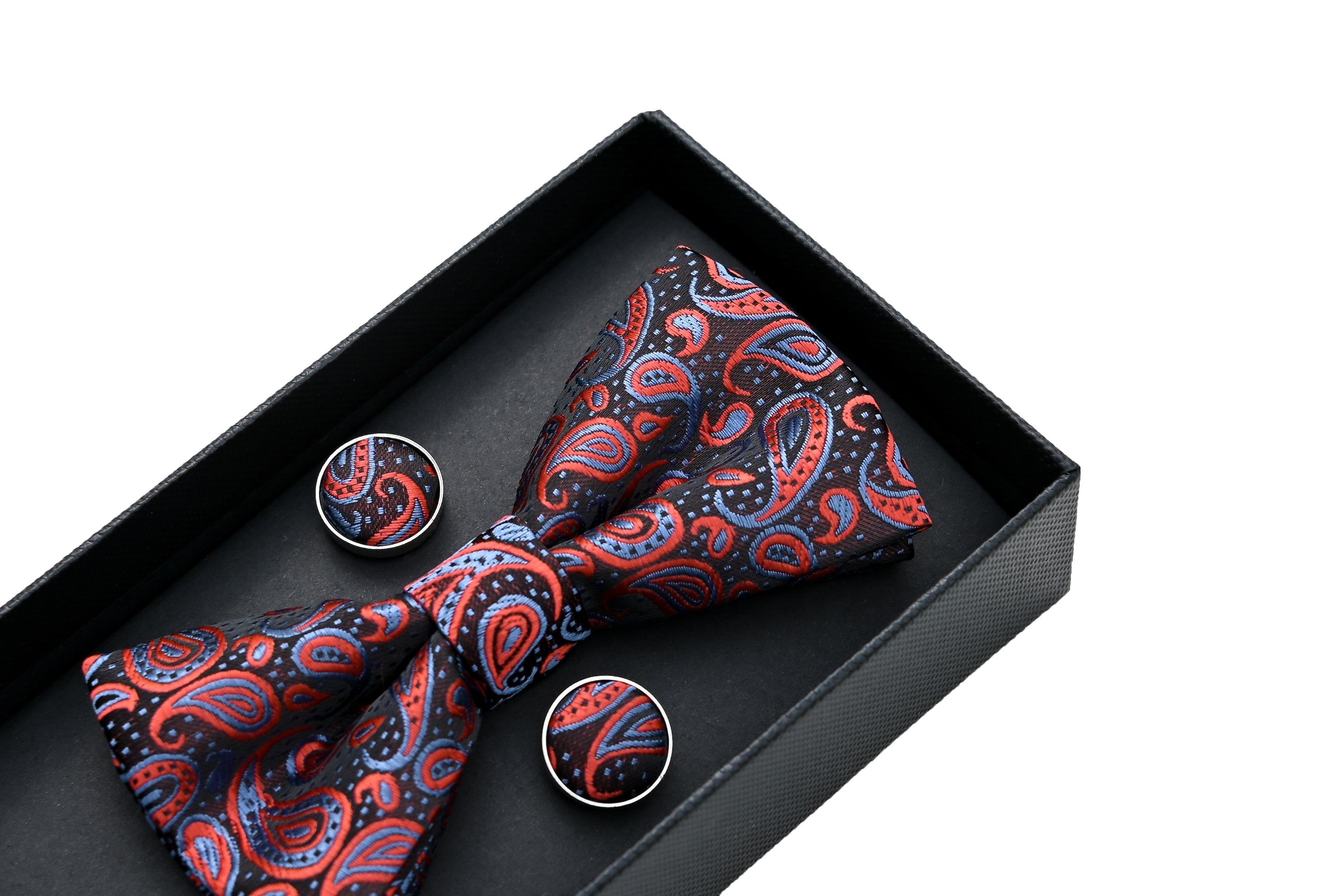 The bowtie showcases an eye-catching paisley pattern in rich blue and red hues, adding depth and character to any outfit. When paired with the matching cufflinks and pocket square, this set creates a polished, cohesive look.