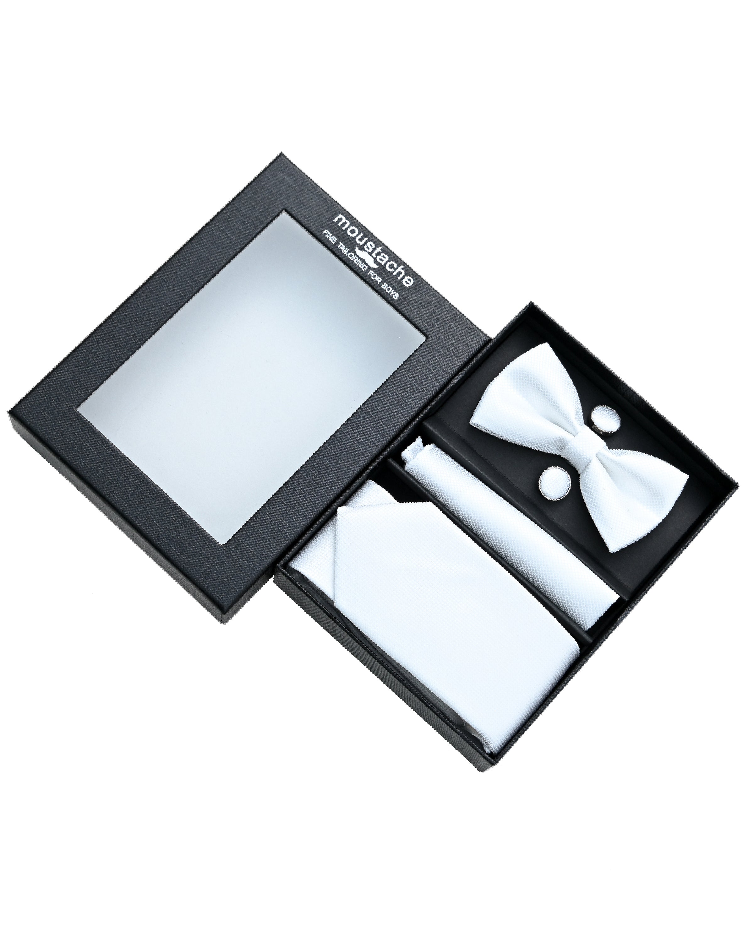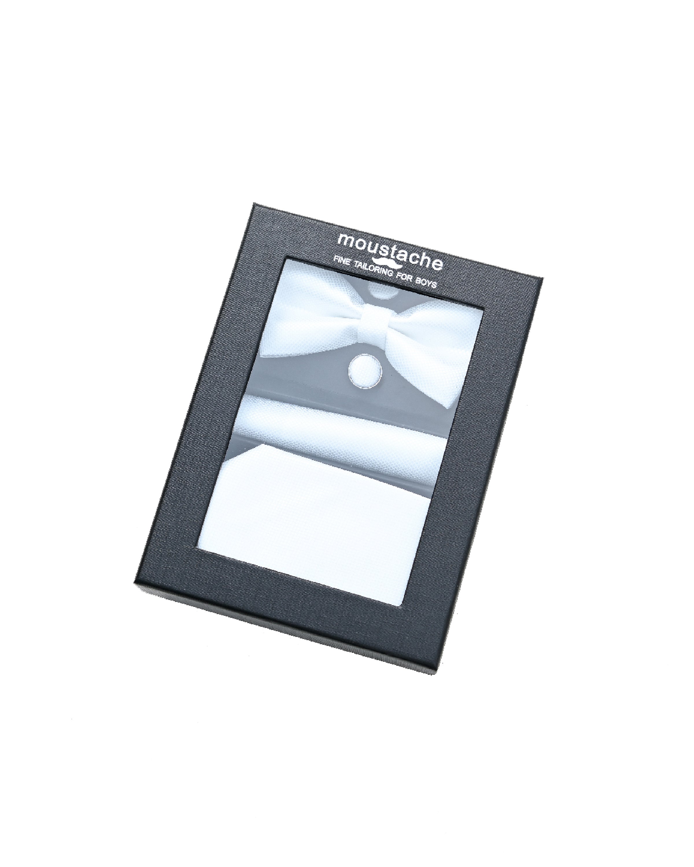 Elevate your young gentleman's attire with the Classic White Tie Set from Moustache. This meticulously crafted ensemble combines timeless elegance with pristine sophistication, featuring a tie, bowtie, pocket square, and cufflinks. Moreover, it's perfect for both formal events and stylish everyday wear.