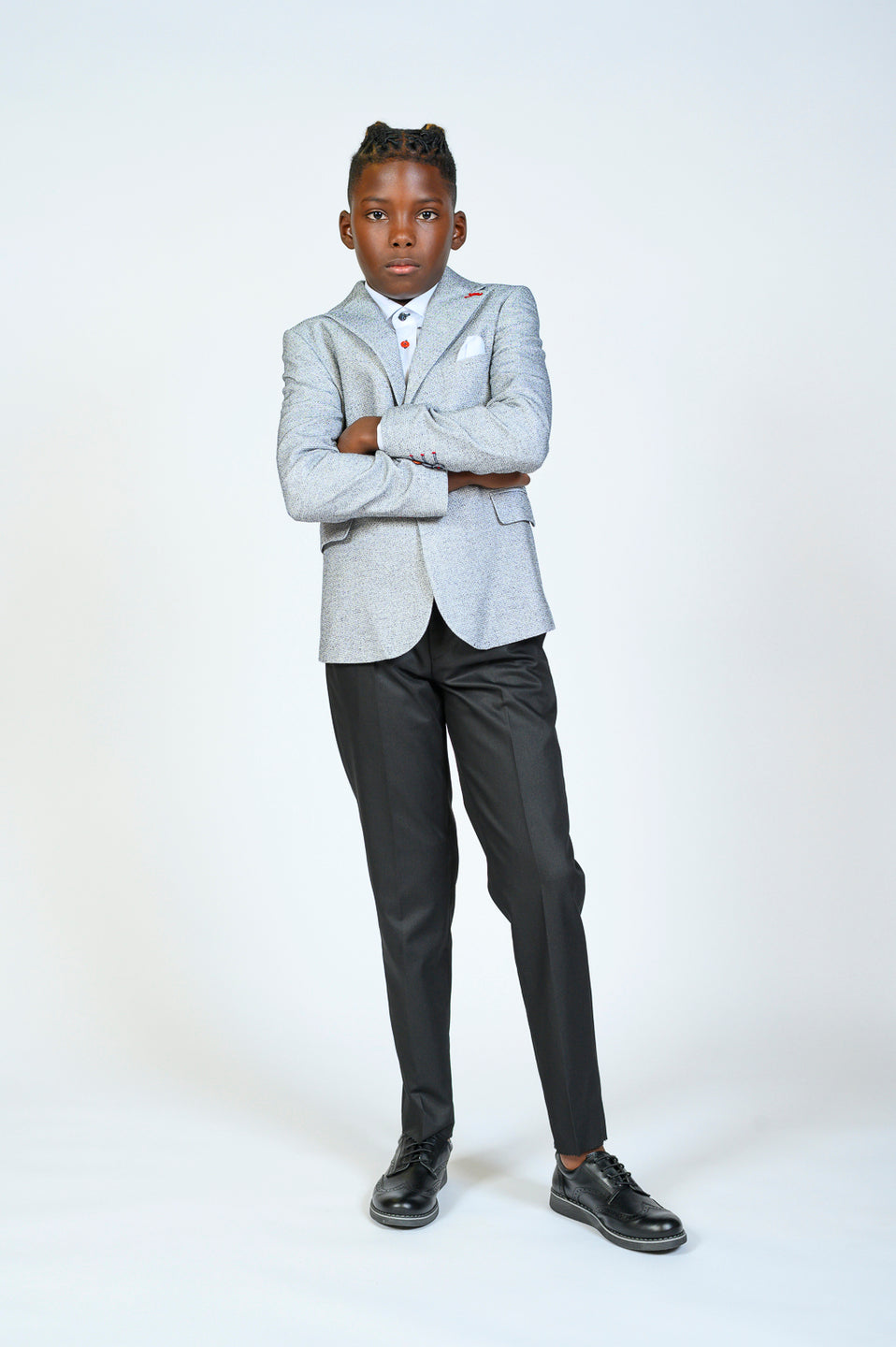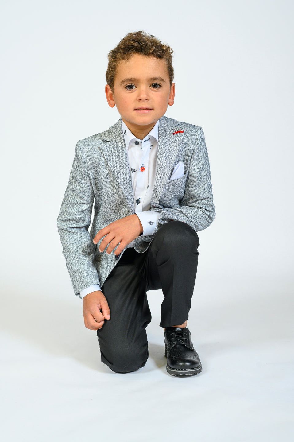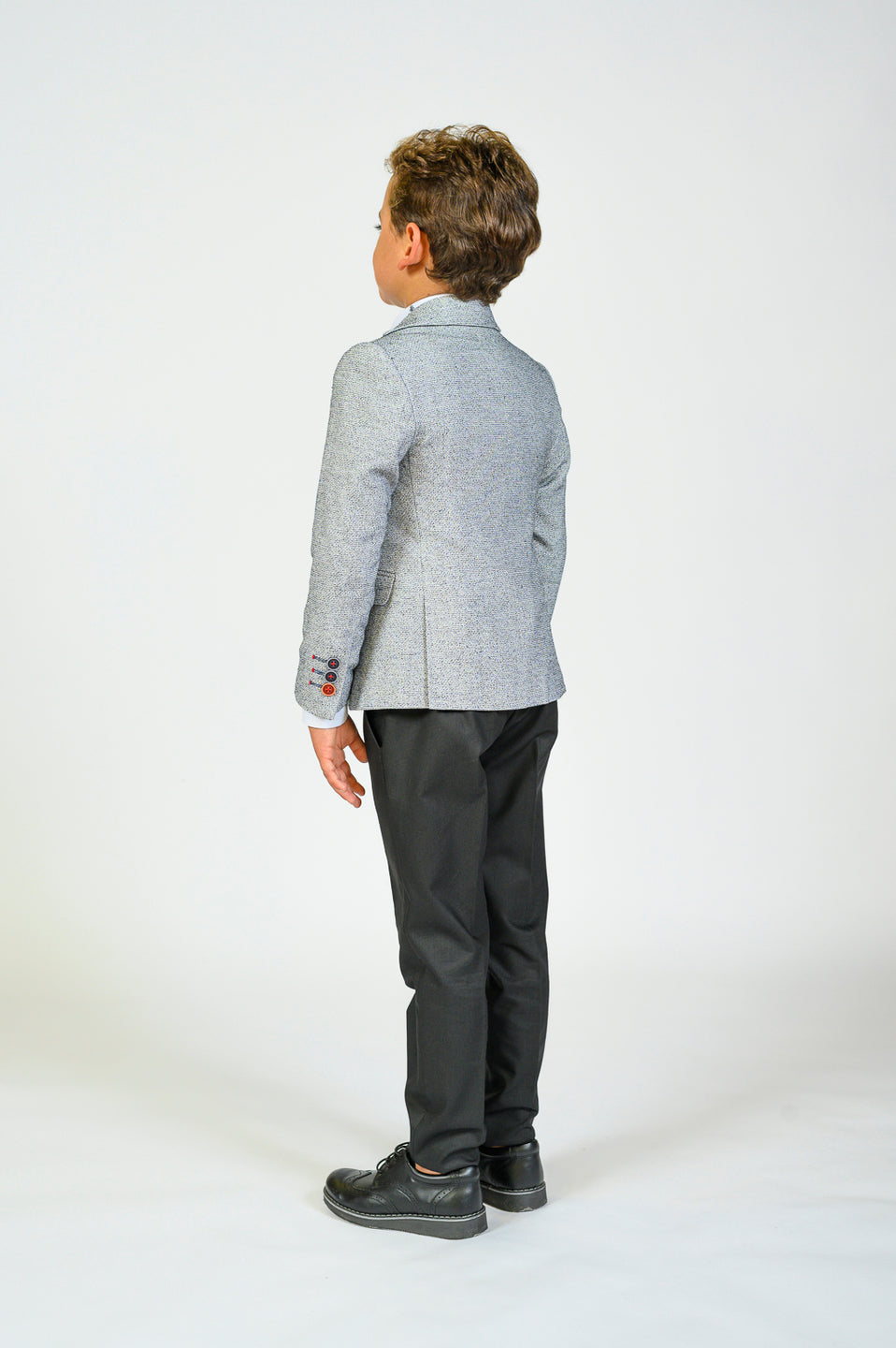 Dress your young man in style with this cool gray embroidered blazer from Moustache. Made from lightweight cotton, this blazer offers a comfortable fit that's perfect for all-day wear. The long sleeves feature button closure hems for a secure fit. The pocket on the upper left-hand side adds a touch of sophistication, complete with a coordinating handkerchief.