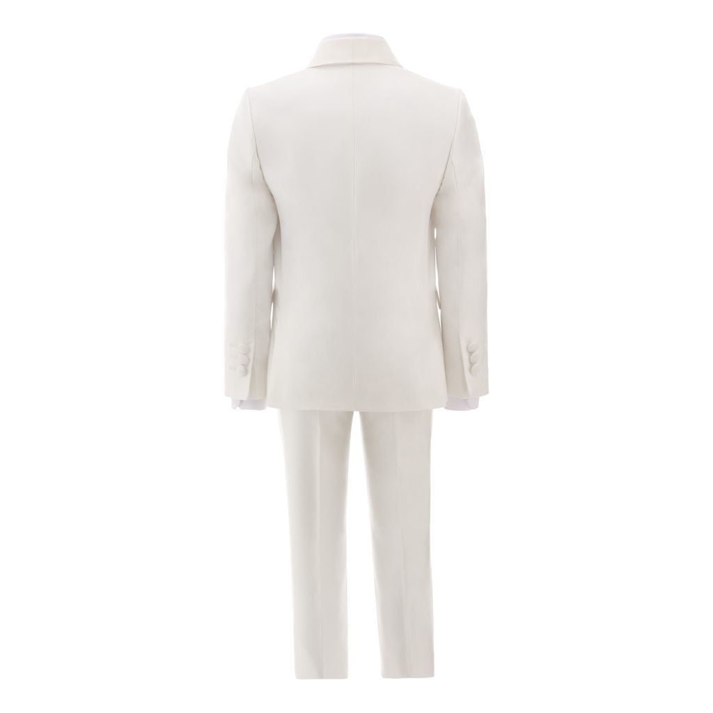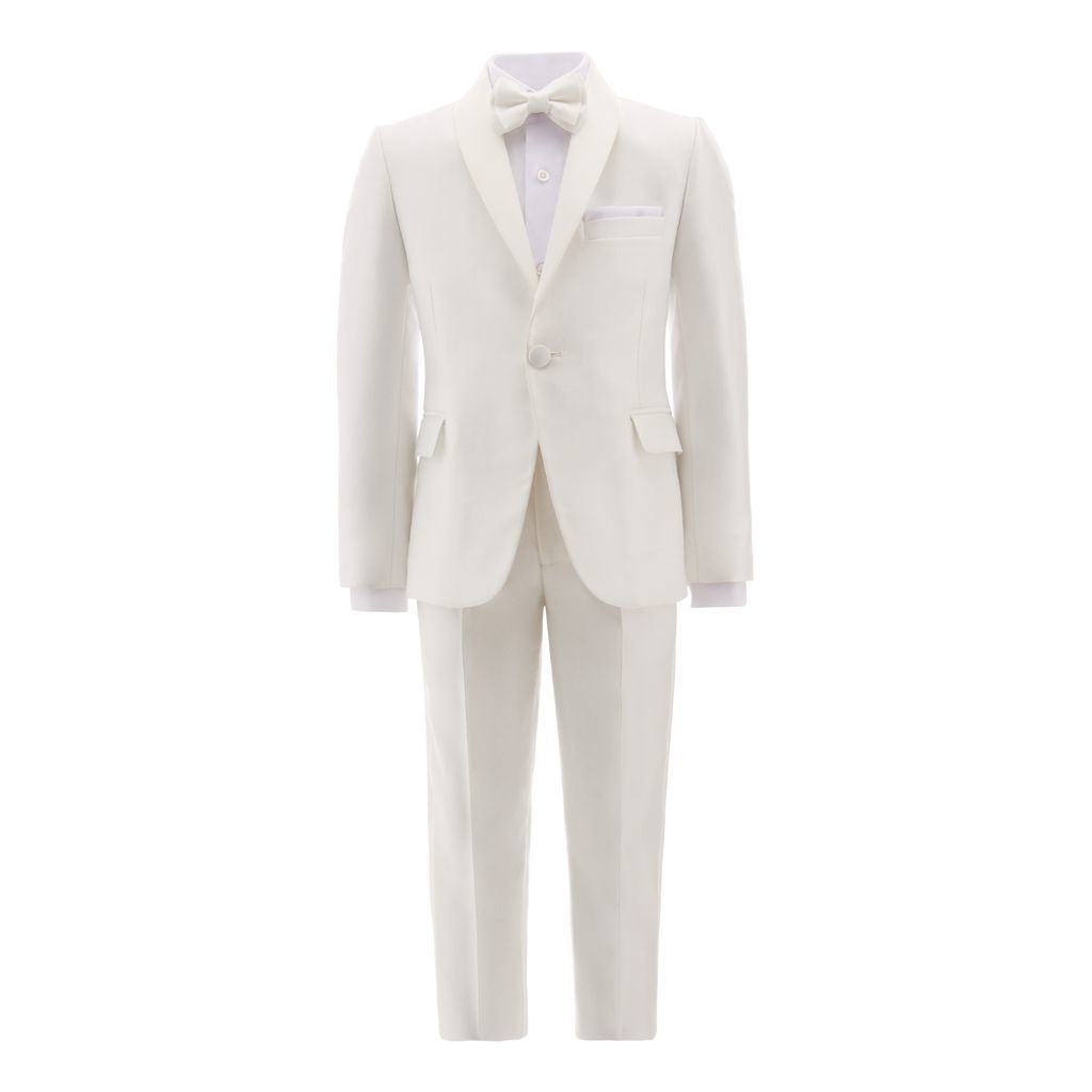 Elevate your child's formal wardrobe with our Cream 5 pc Shawl Lapel Suit from Moustache. This stylish suit set includes a cream shawl lapel blazer, formal straight pants, classic white shirt, and matching cream bowtie.