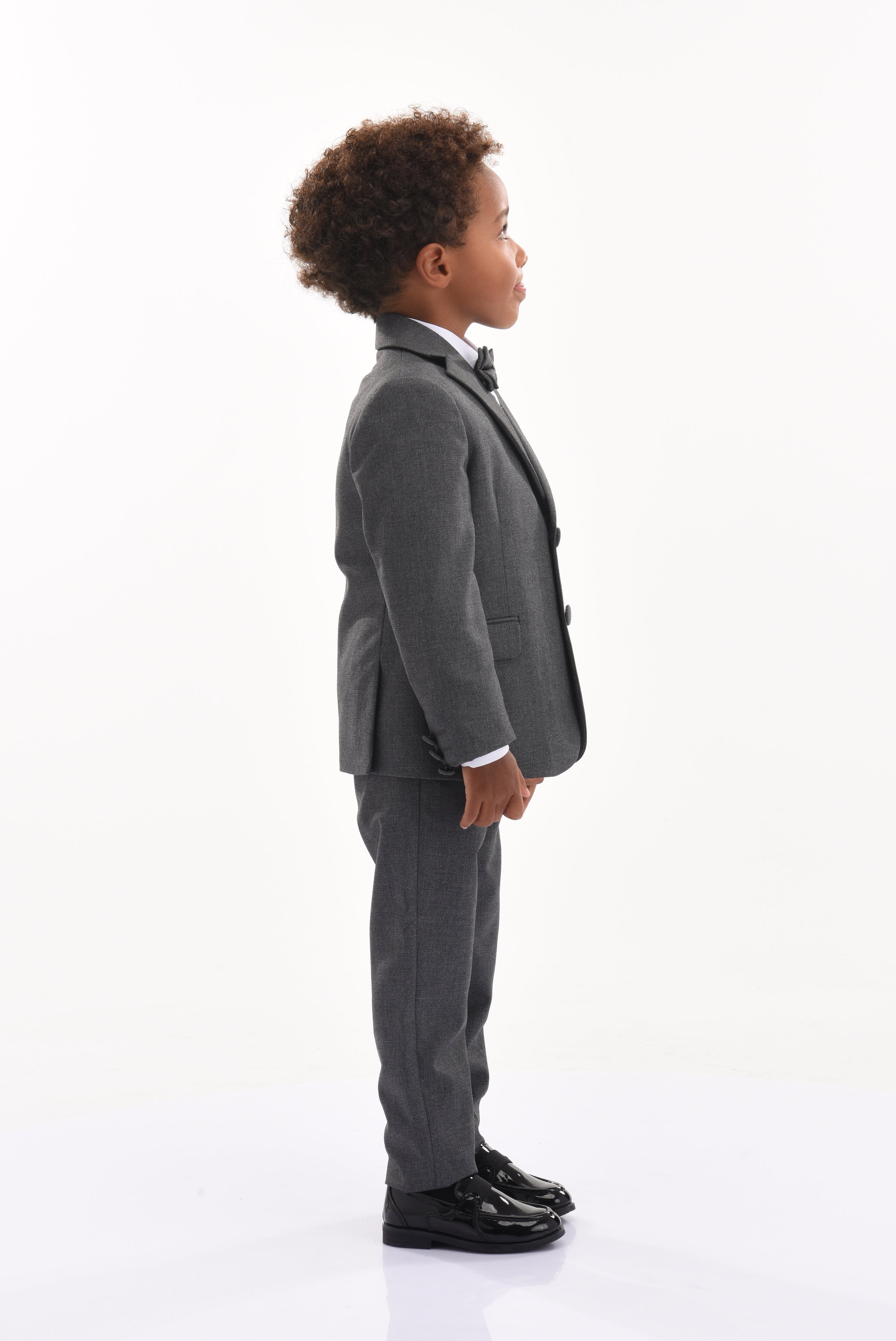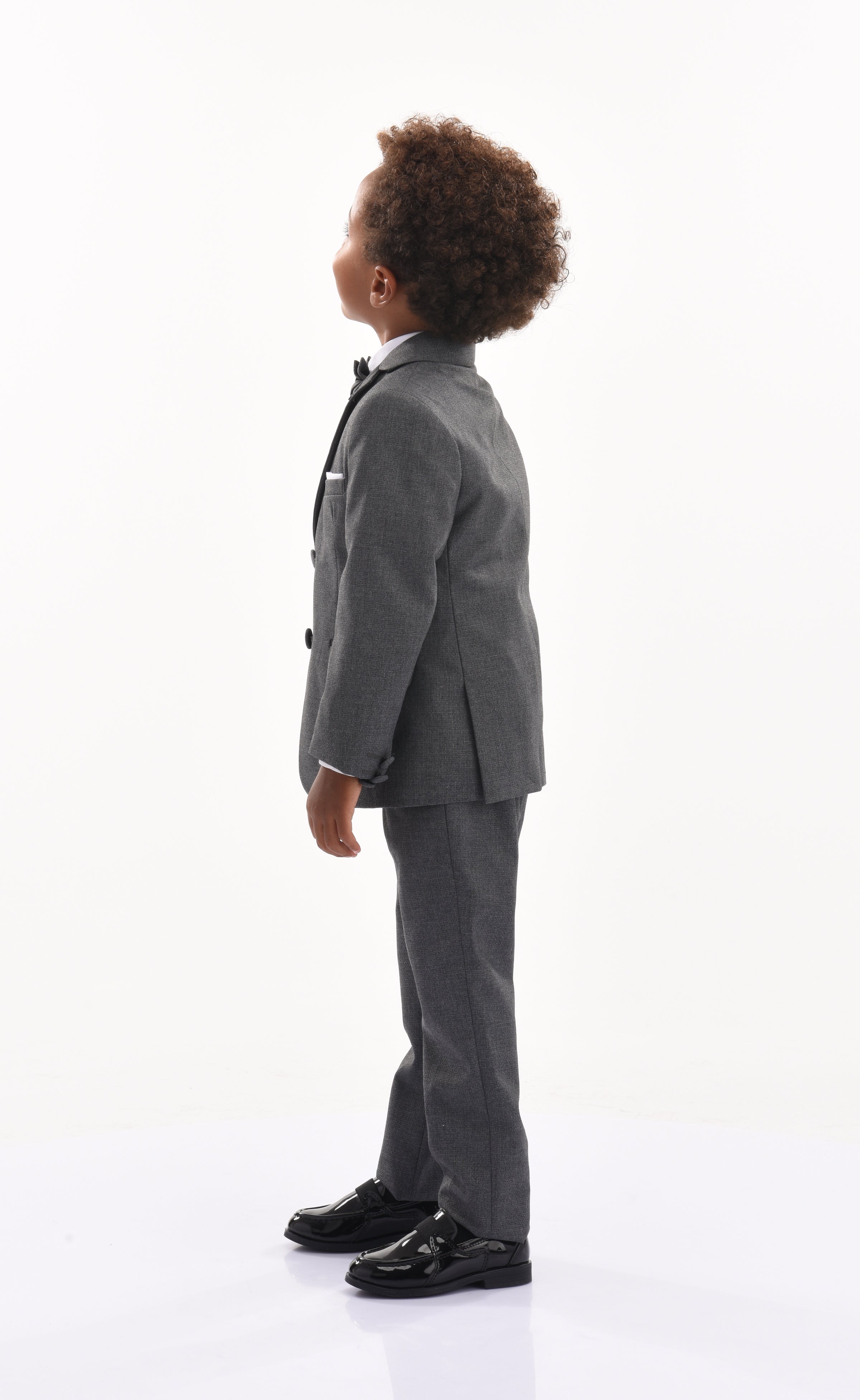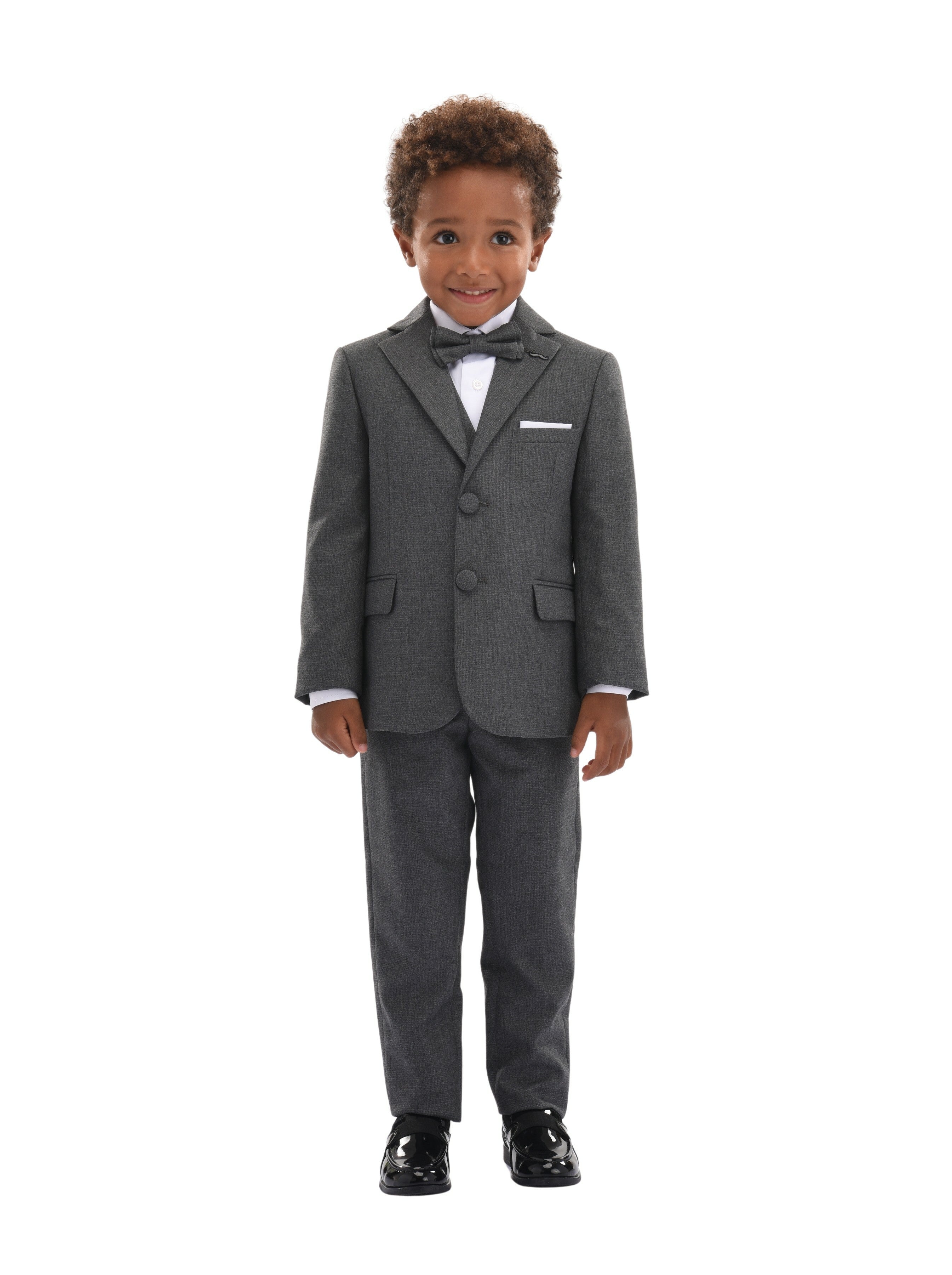 Presenting our exquisitely crafted Gray 5pc Peak Lapel Tuxedo set, designed to make a lasting impression at any special event. This refined ensemble features a meticulously tailored slim-fit blazer with distinguished peak lapels, creating a sophisticated silhouette that's both timeless and contemporary. The crisp white dress shirt serves as the perfect foundation, while the matching vest, complete with an adjustable back strap, adds a layer of classic elegance. Complementing flat-front pants, precisely cut for a modern slim fit, feature a comfortable adjustable waistband to ensure the perfect fit for your growing child.