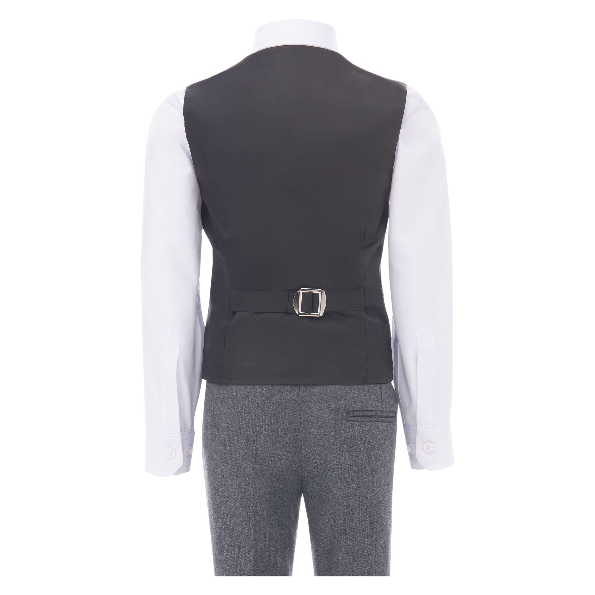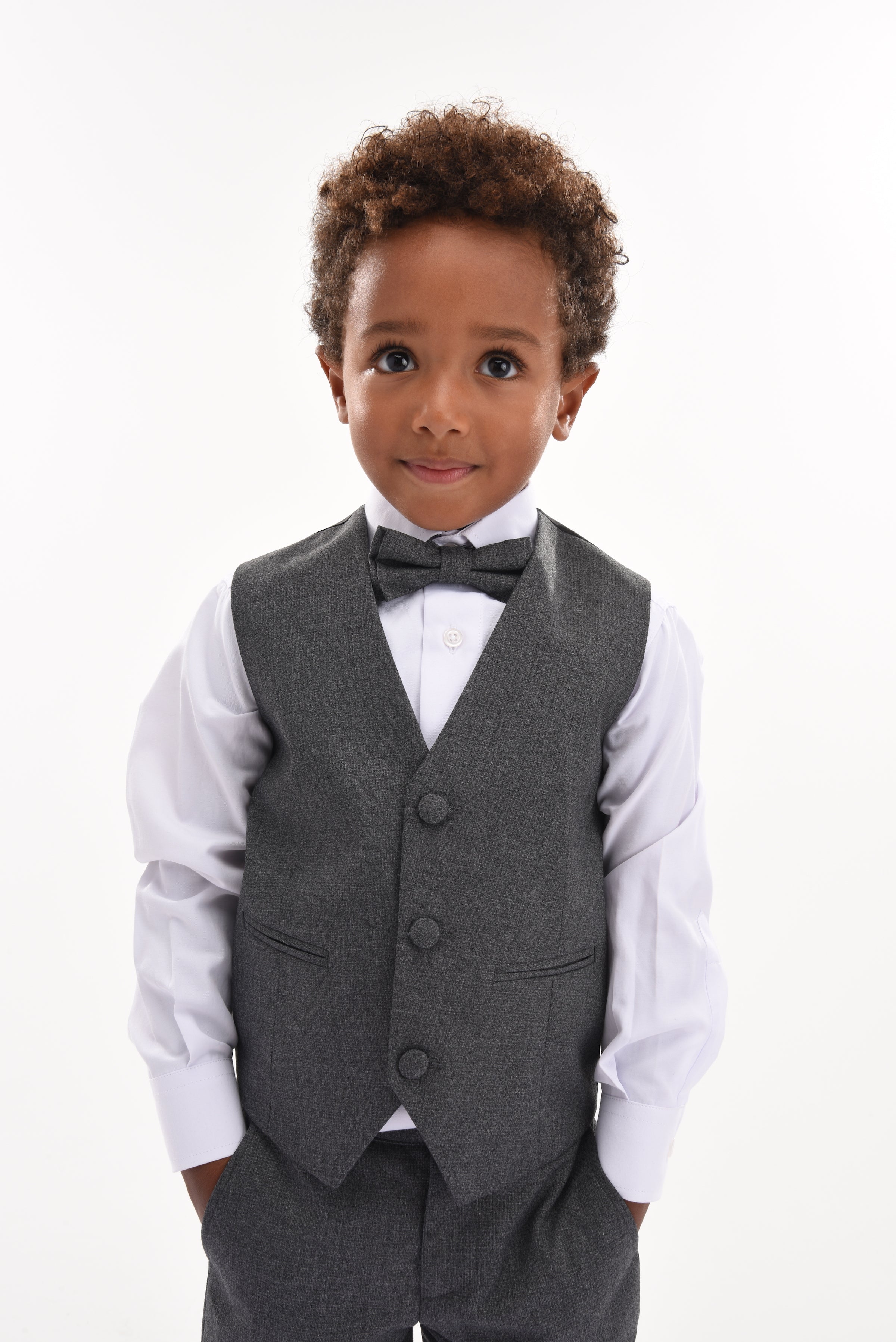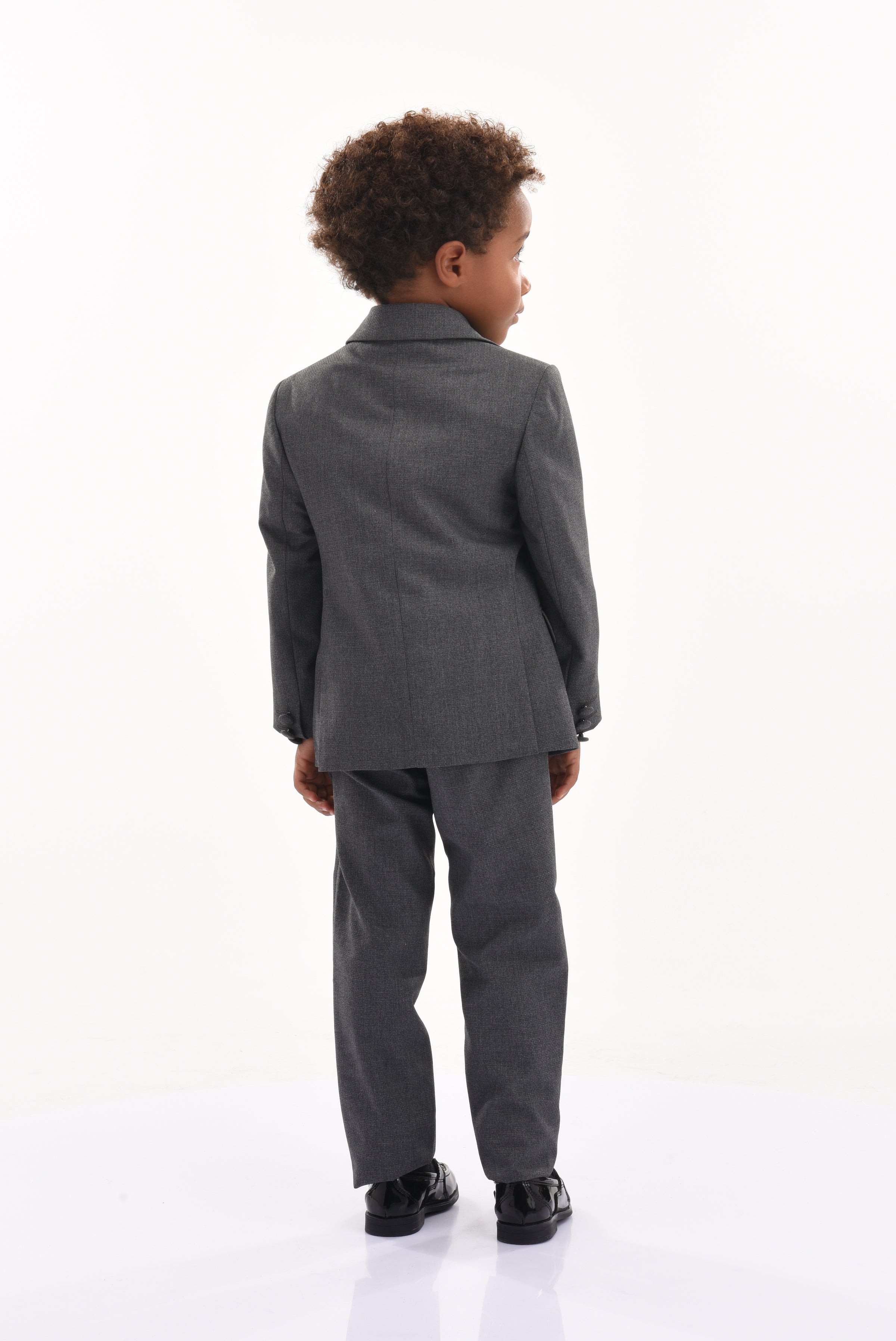 Presenting our exquisitely crafted Gray 5pc Peak Lapel Tuxedo set, designed to make a lasting impression at any special event. This refined ensemble features a meticulously tailored slim-fit blazer with distinguished peak lapels, creating a sophisticated silhouette that's both timeless and contemporary. The crisp white dress shirt serves as the perfect foundation, while the matching vest, complete with an adjustable back strap, adds a layer of classic elegance. Complementing flat-front pants, precisely cut for a modern slim fit, feature a comfortable adjustable waistband to ensure the perfect fit for your growing child.