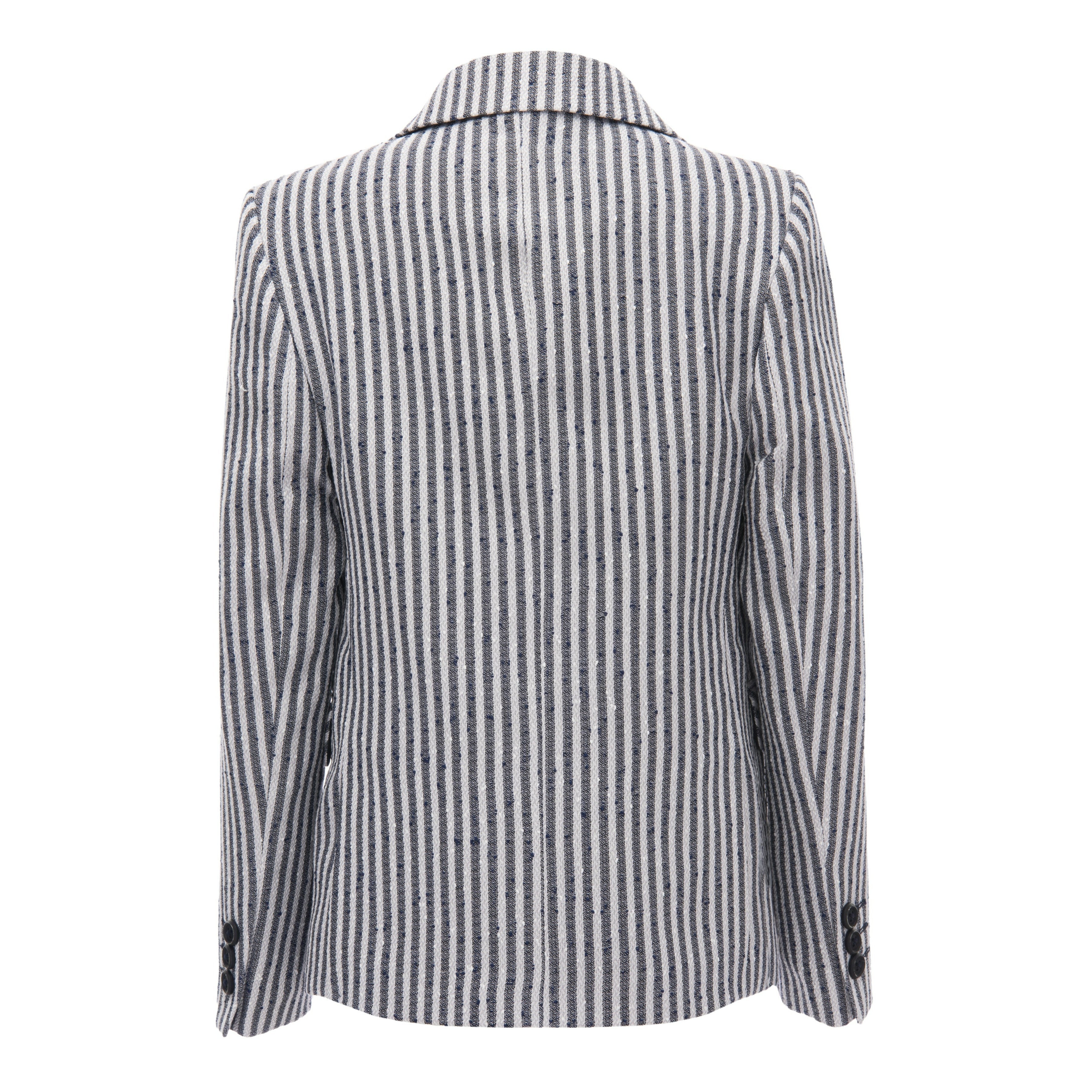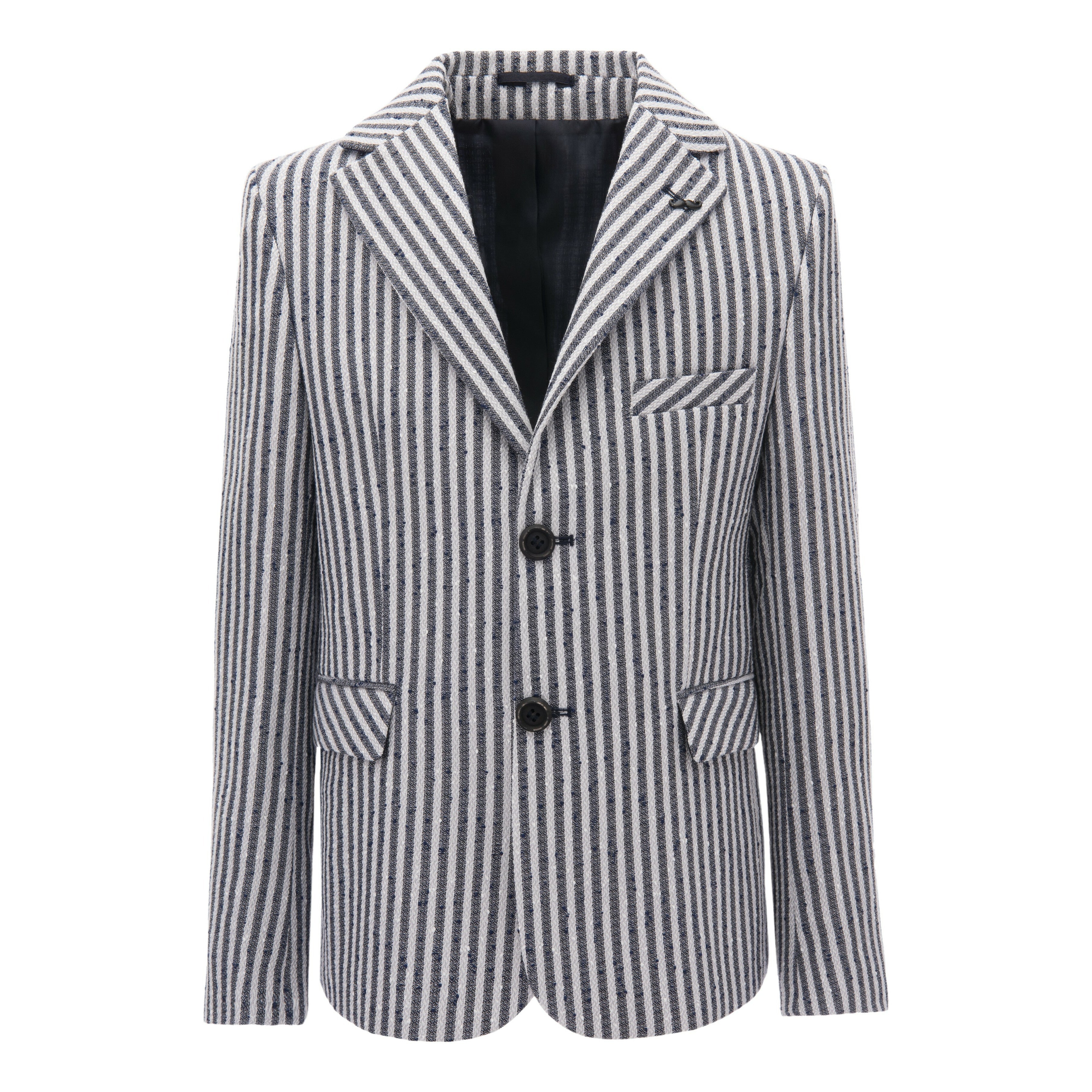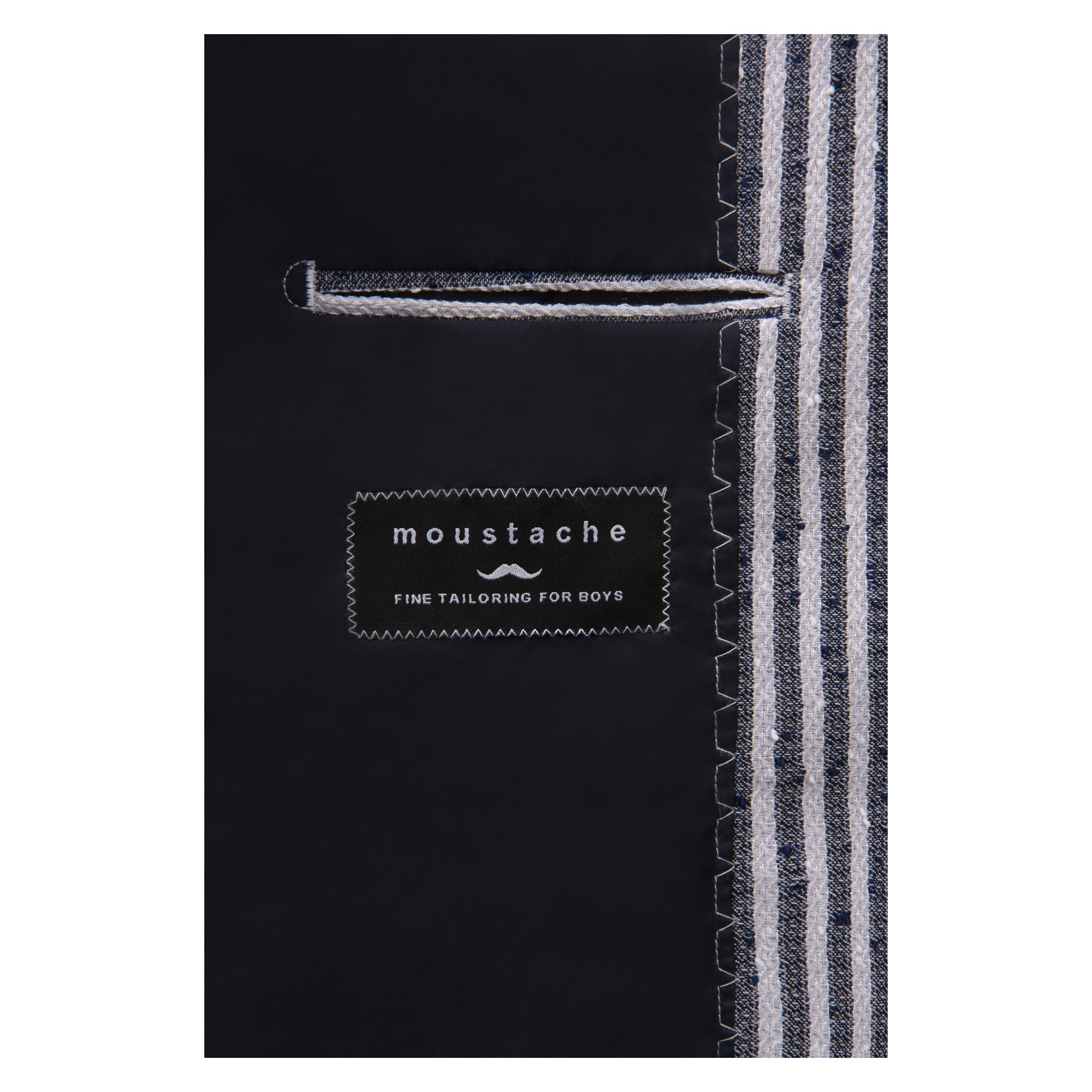 Elevate your child's style with the Gray Double Striped Blazer from Moustache. This sophisticated blazer features a gray and navy double stripe design, adding a touch of elegance to any outfit.