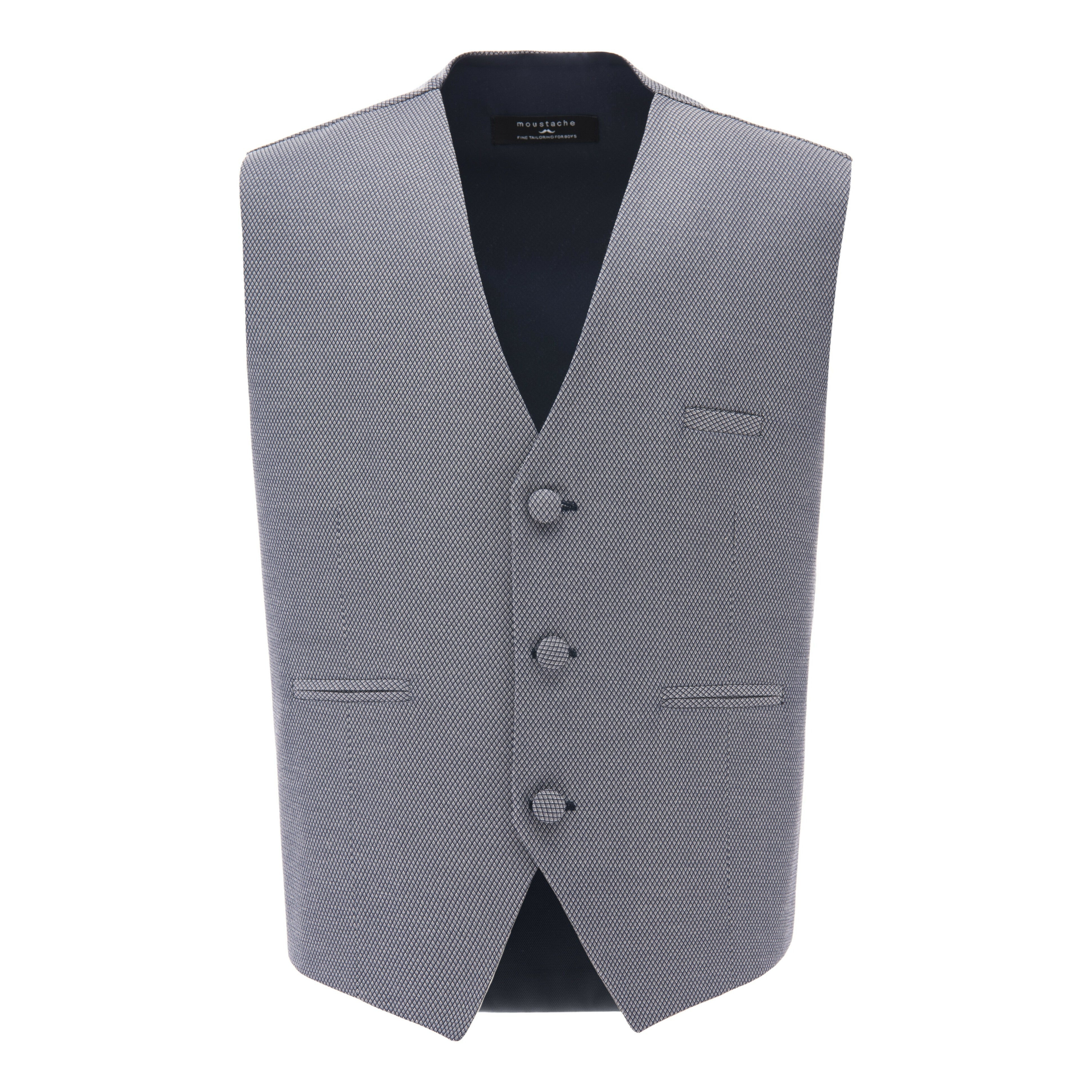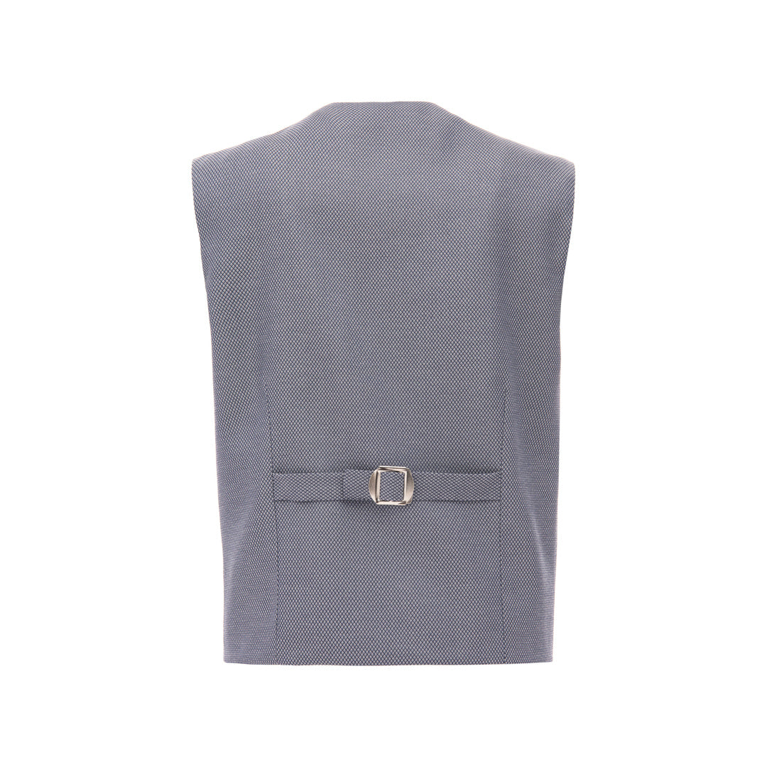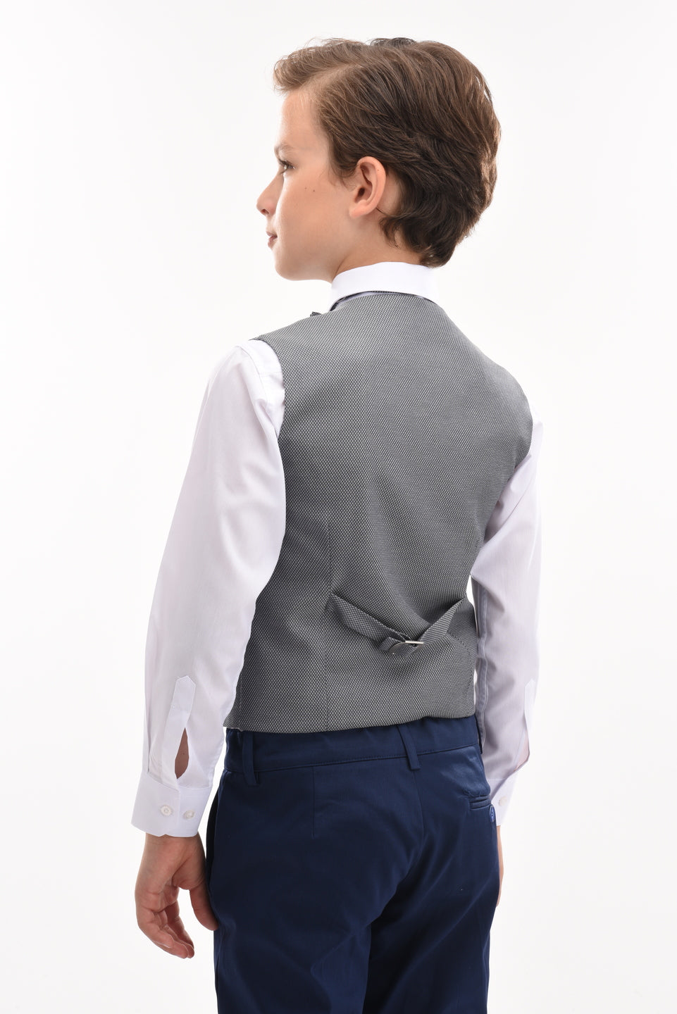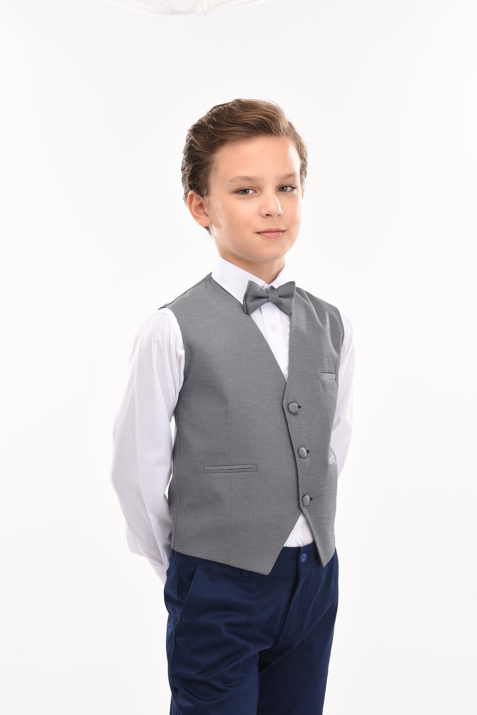 Add a touch of elegance to your child's outfit with the Gray Micro Print Suit Vest and Matching Bowtie. This set includes a vest and bow tie, both featuring a sophisticated micro dotted print in navy.