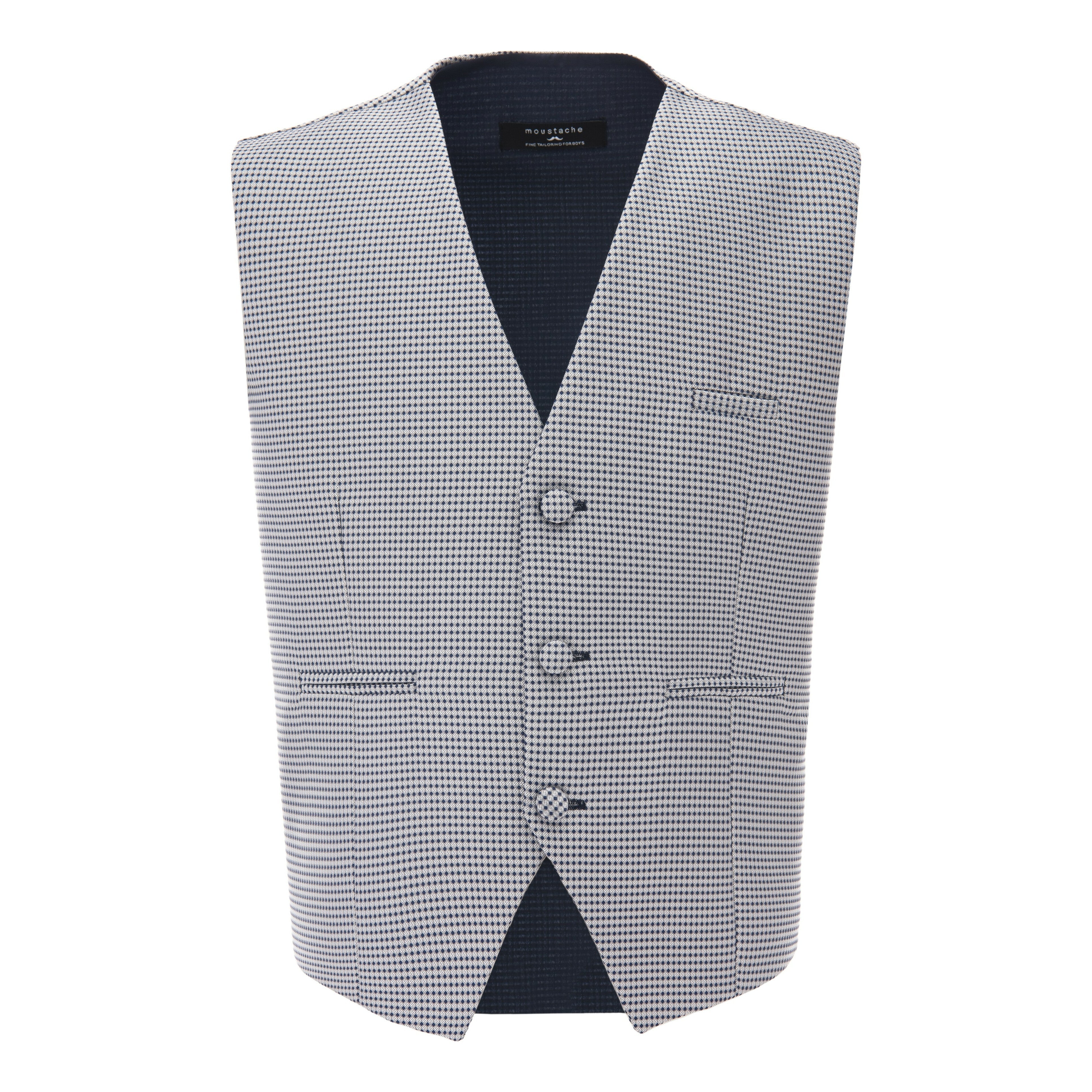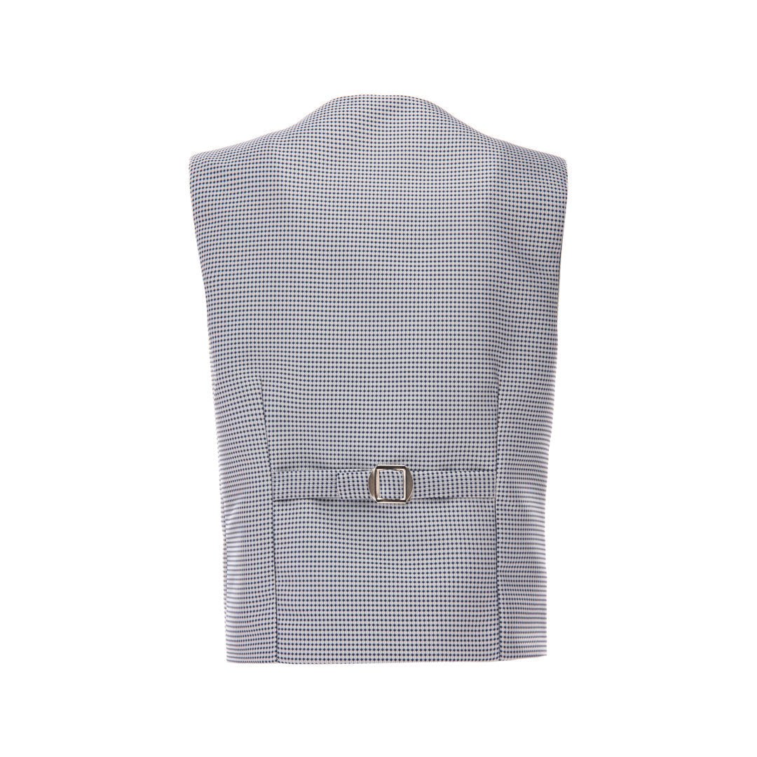 The vest features a classic pin design in grey, adding a subtle yet sophisticated touch to any outfit. It is designed with a three-button closure for easy wear and a satin interior for added comfort. The back of the vest is adjustable, ensuring a perfect fit for your child.