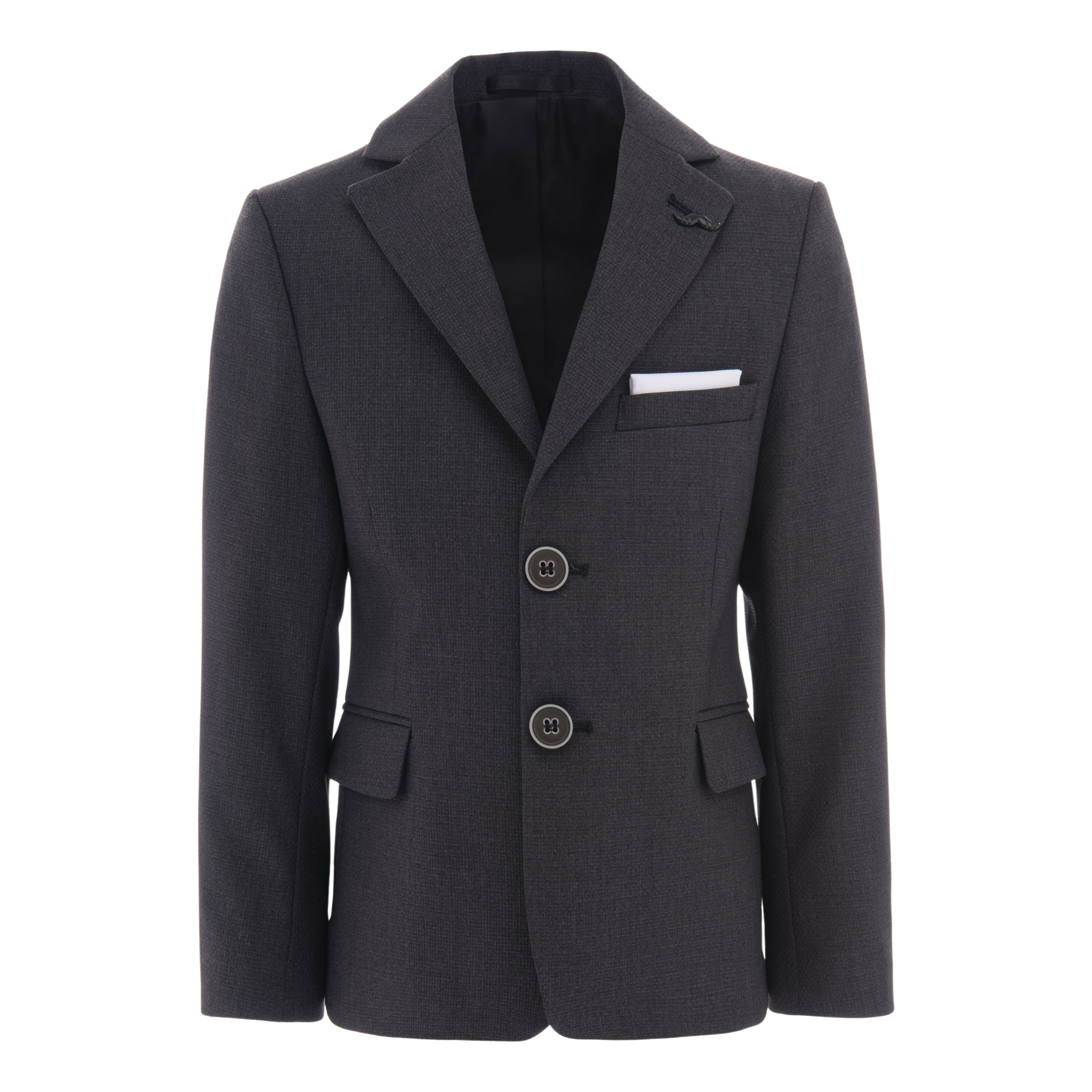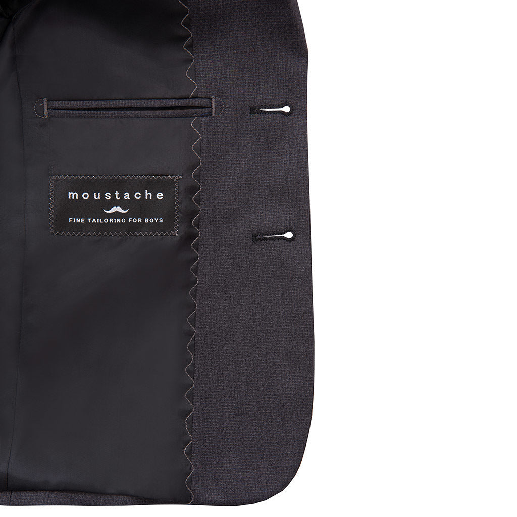 Elevate your child's wardrobe with this gray twill peak lapel blazer from Moustache. Crafted from twill fabric, this blazer offers a lightweight and comfortable fit. The satin-like lining adds a touch of luxury, while the long sleeves with button closure hems provide a sophisticated look. The blazer also features a pocket on the upper left-hand side with a handkerchief, adding a stylish detail.