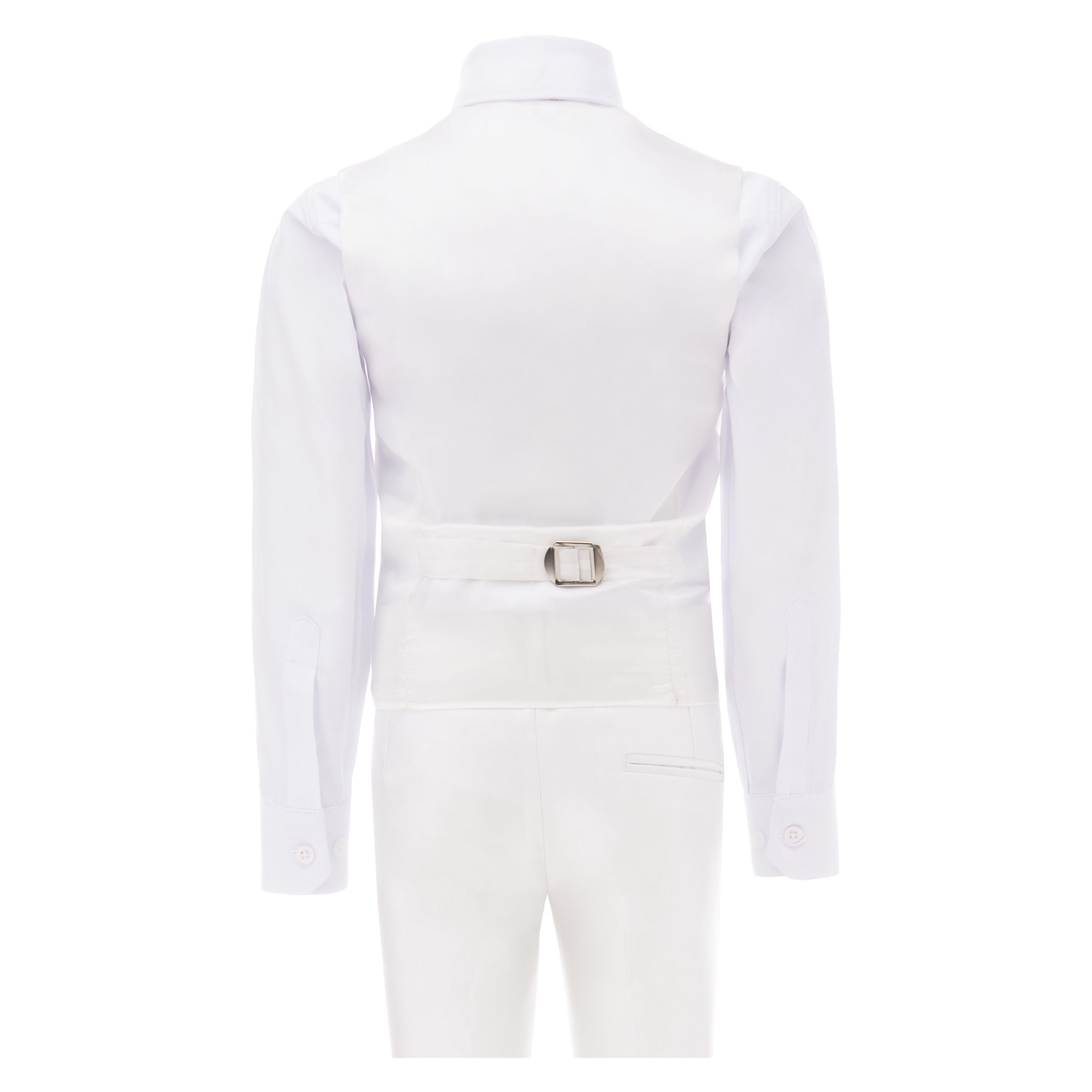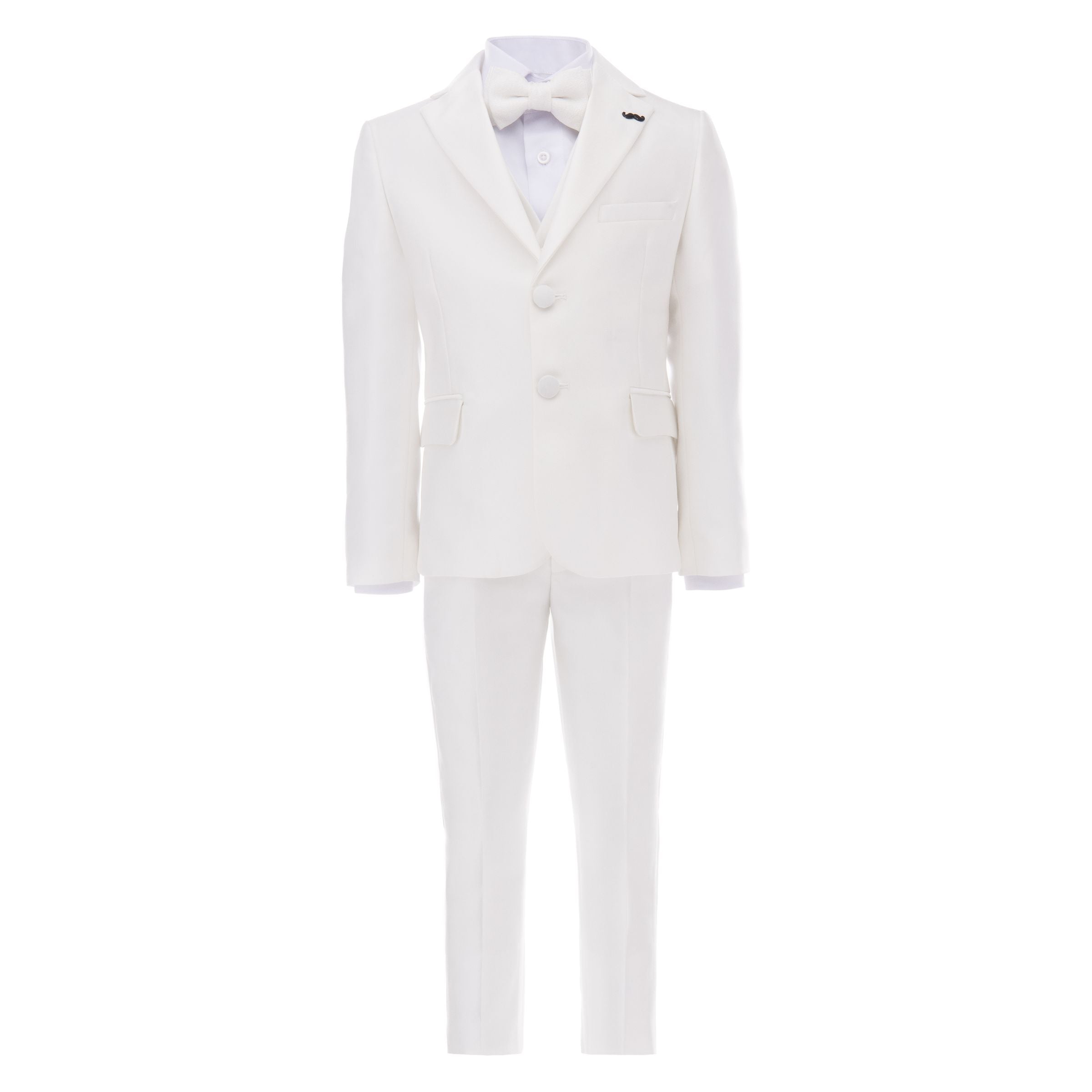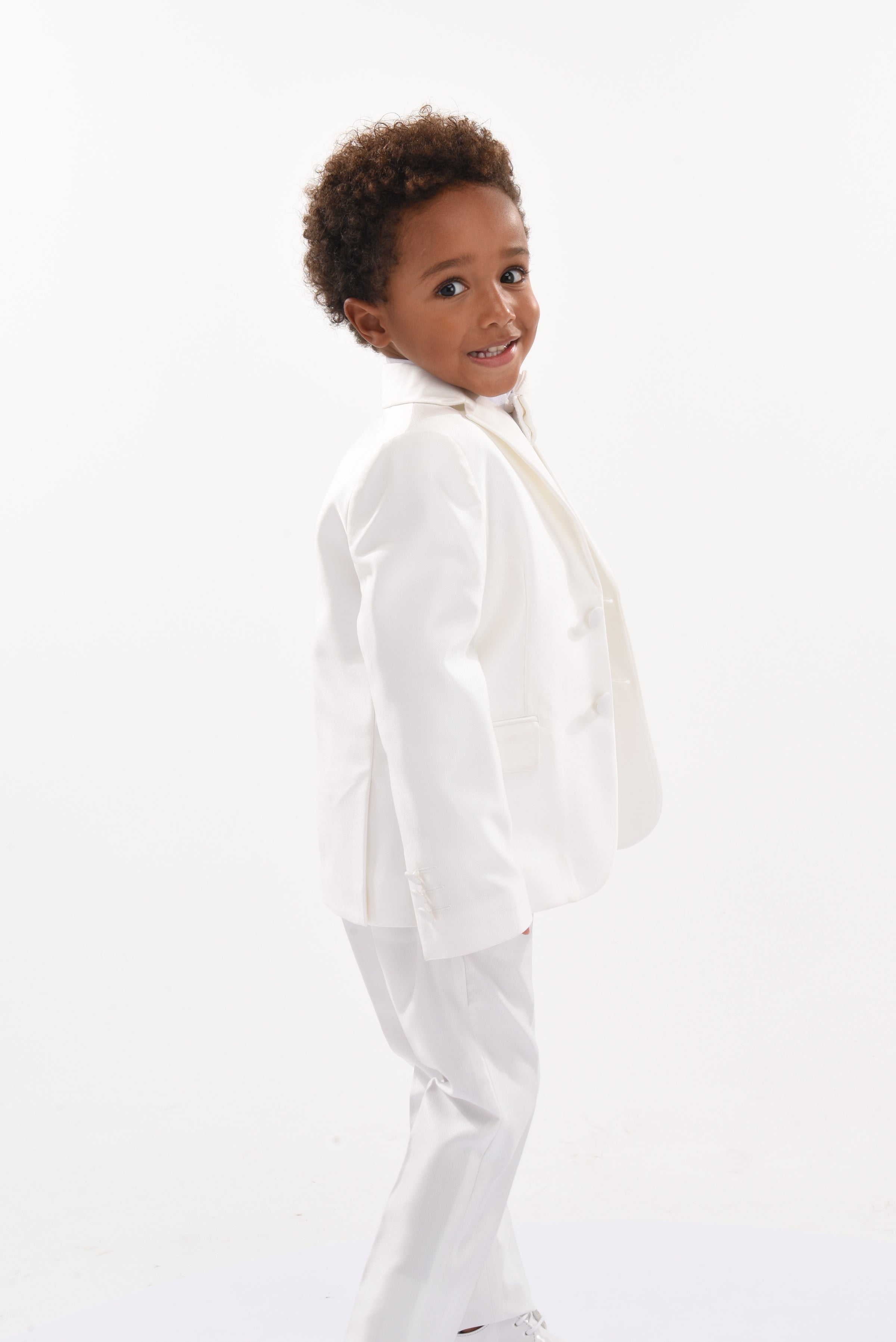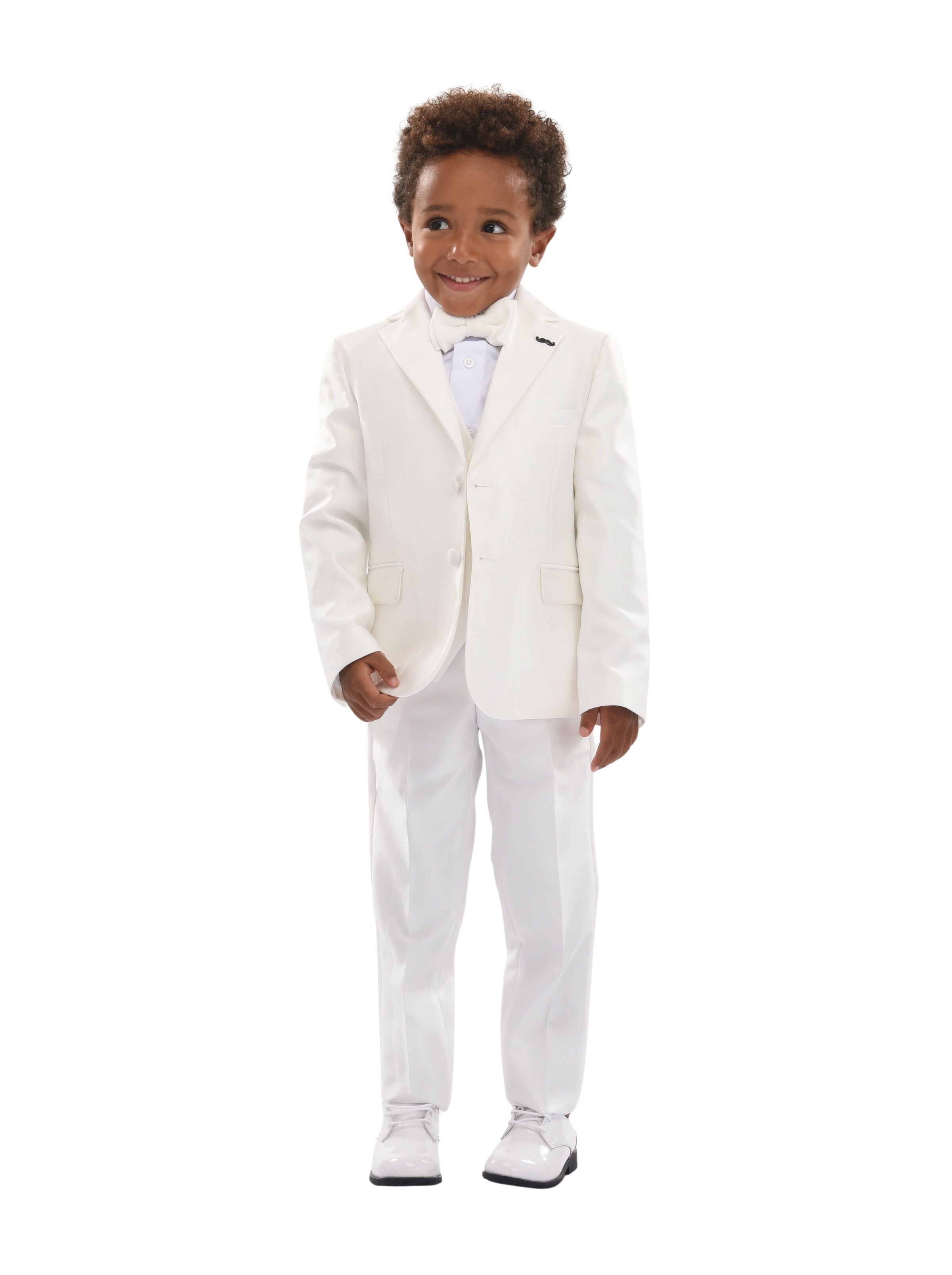 Presenting our exquisitely crafted Ivory 5pc Peak Lapel Tuxedo set, designed to make a lasting impression at any special event. This refined ensemble features a meticulously tailored slim-fit blazer with distinguished peak lapels, creating a sophisticated silhouette that's both timeless and contemporary. The crisp white dress shirt serves as the perfect foundation, while the matching vest, complete with an adjustable back strap, adds a layer of classic elegance. Complementing flat-front pants, precisely cut for a modern slim fit, feature a comfortable adjustable waistband to ensure the perfect fit for your growing child.