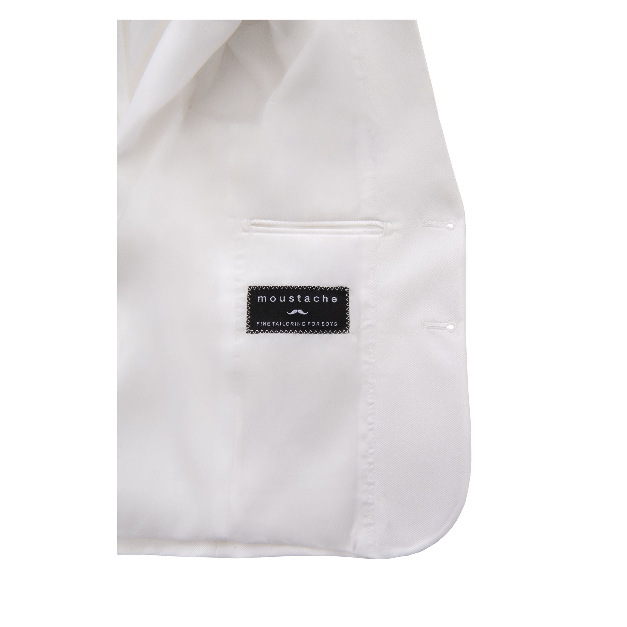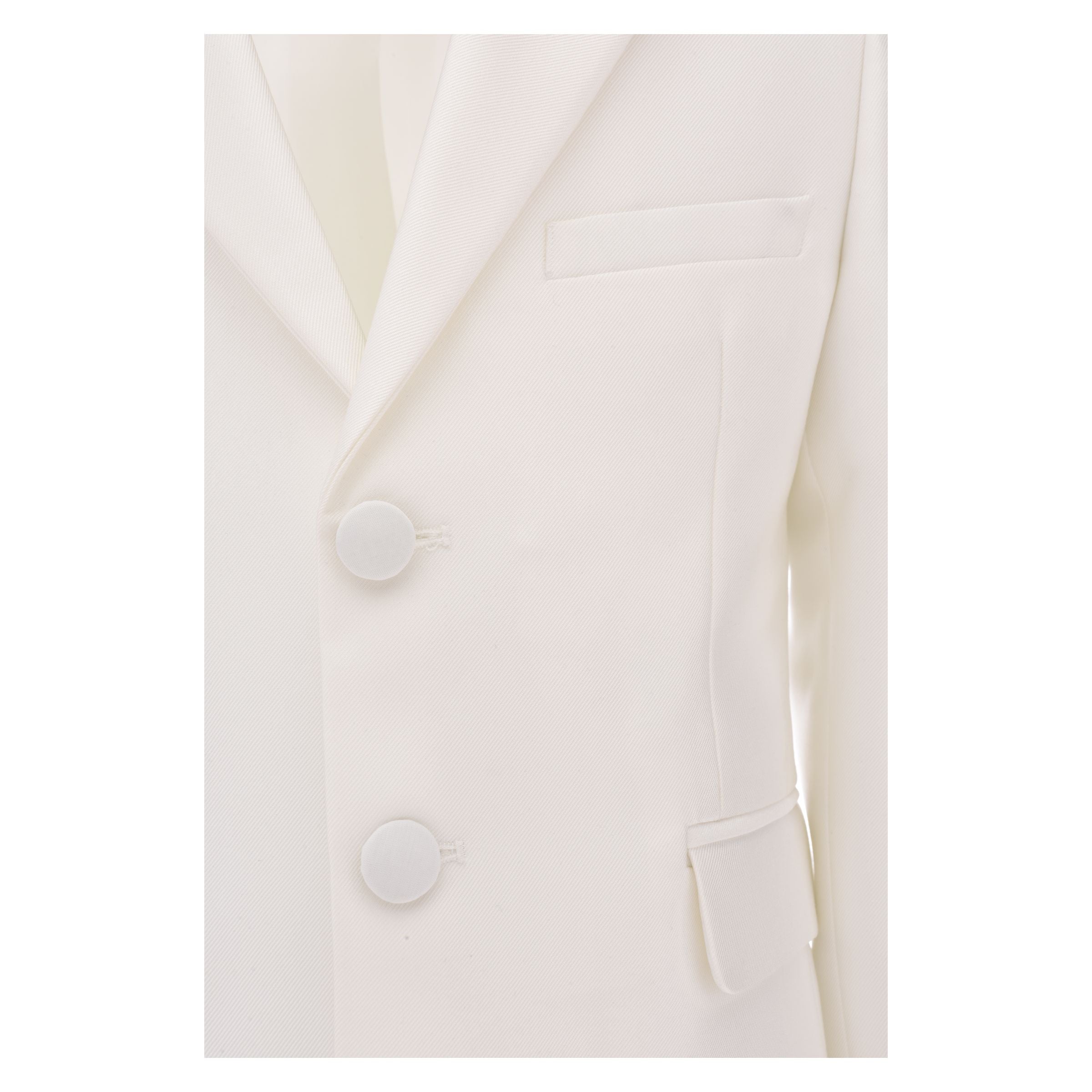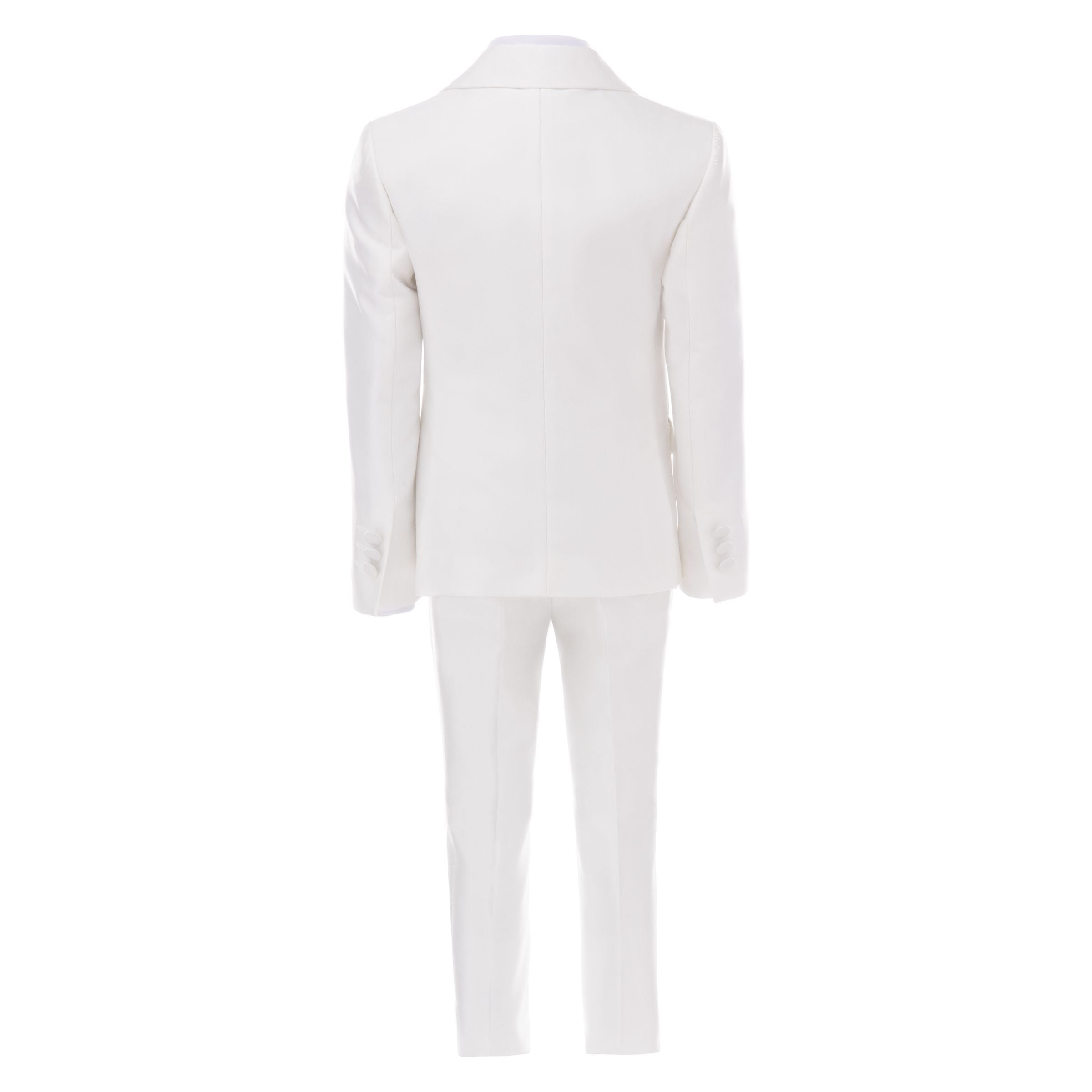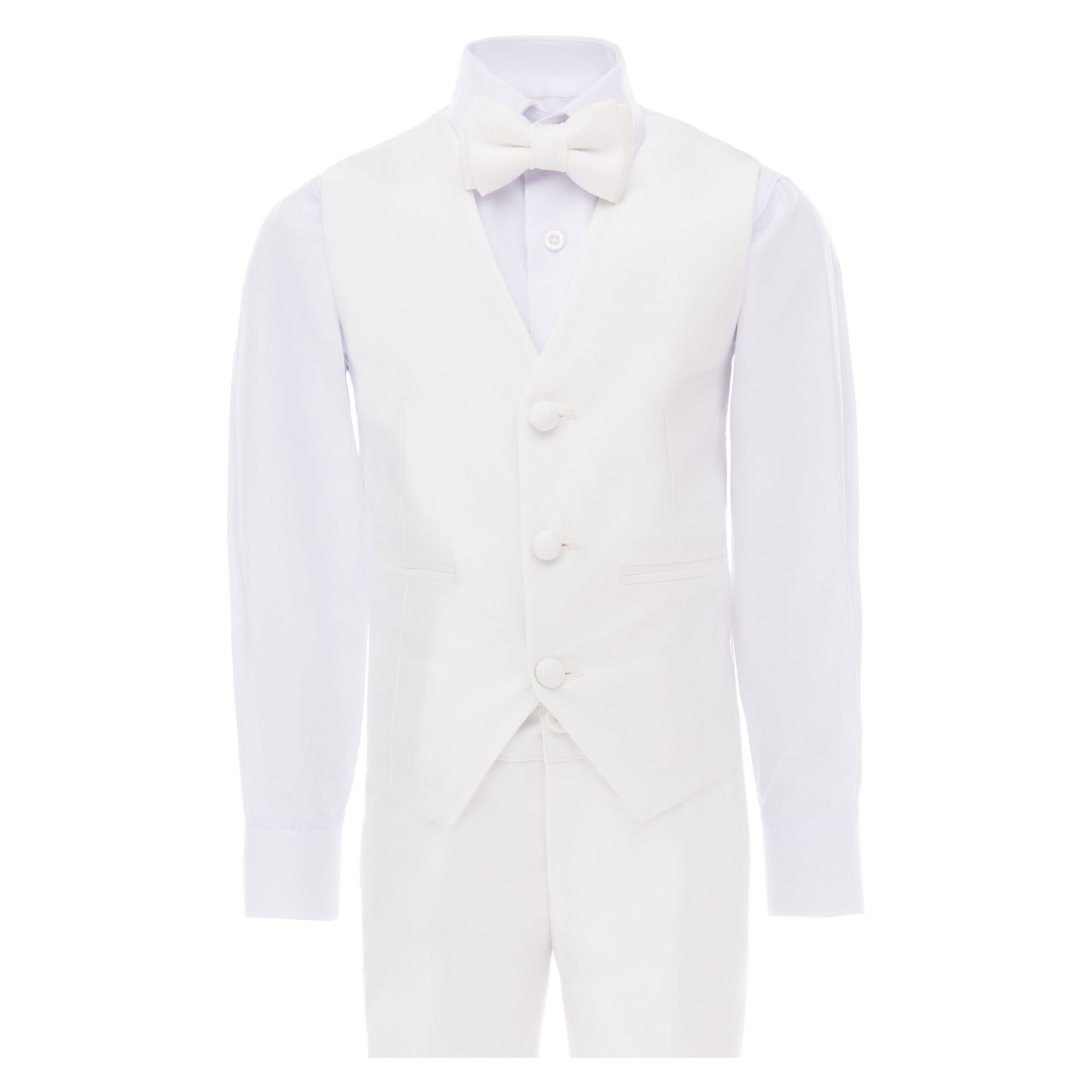 Presenting our exquisitely crafted Ivory 5pc Peak Lapel Tuxedo set, designed to make a lasting impression at any special event. This refined ensemble features a meticulously tailored slim-fit blazer with distinguished peak lapels, creating a sophisticated silhouette that's both timeless and contemporary. The crisp white dress shirt serves as the perfect foundation, while the matching vest, complete with an adjustable back strap, adds a layer of classic elegance. Complementing flat-front pants, precisely cut for a modern slim fit, feature a comfortable adjustable waistband to ensure the perfect fit for your growing child.