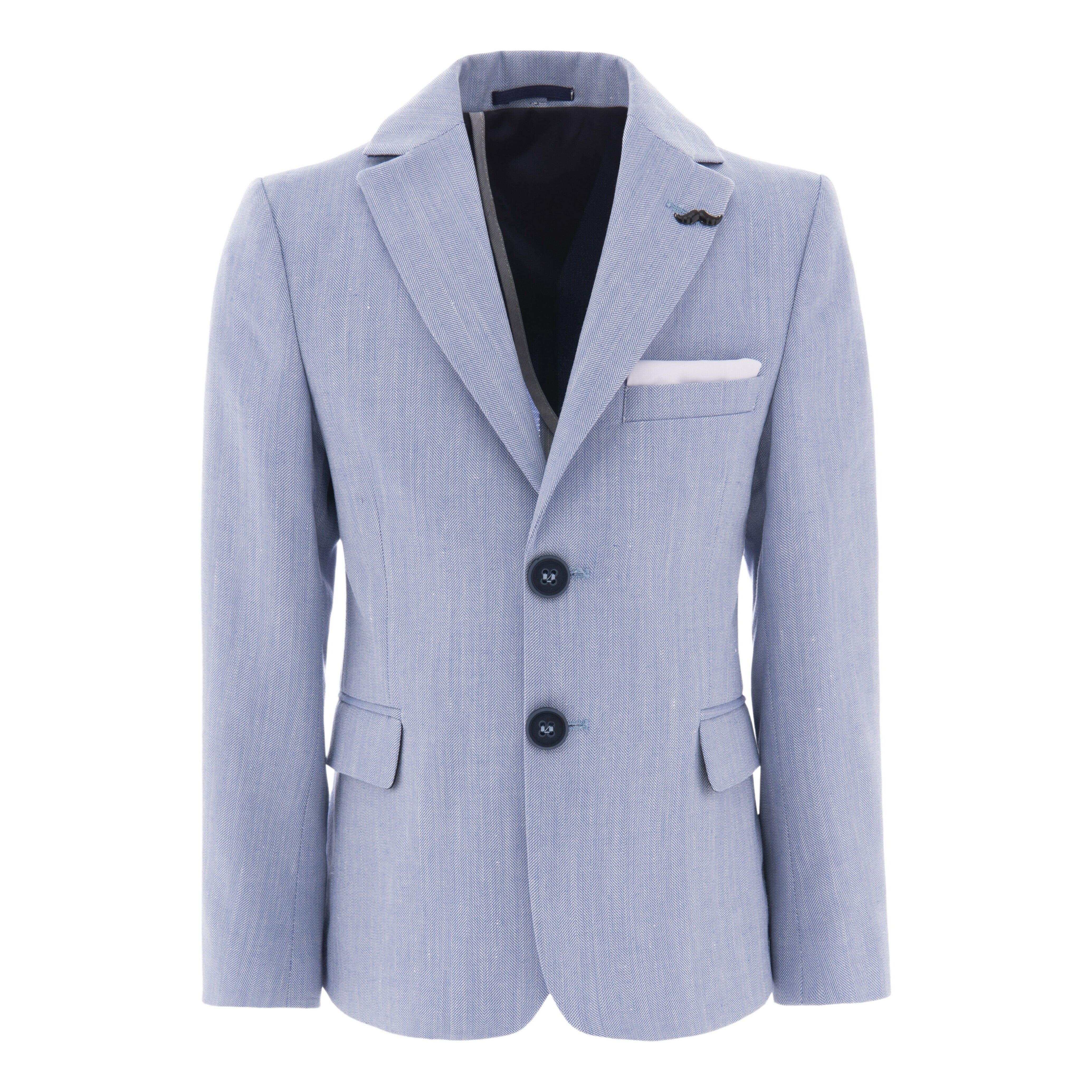 Elevate your child's wardrobe with the Light Blue Peak Lapel Blazer for kid boys from Moustache. Featuring a lightweight fit and a satin-like lining, this blazer ensures comfort and style for any occasion. The long sleeves with button closure hems add a touch of sophistication. Furthermore, the pocket on the upper left-hand side, complete with a handkerchief, enhances its elegant appeal.
