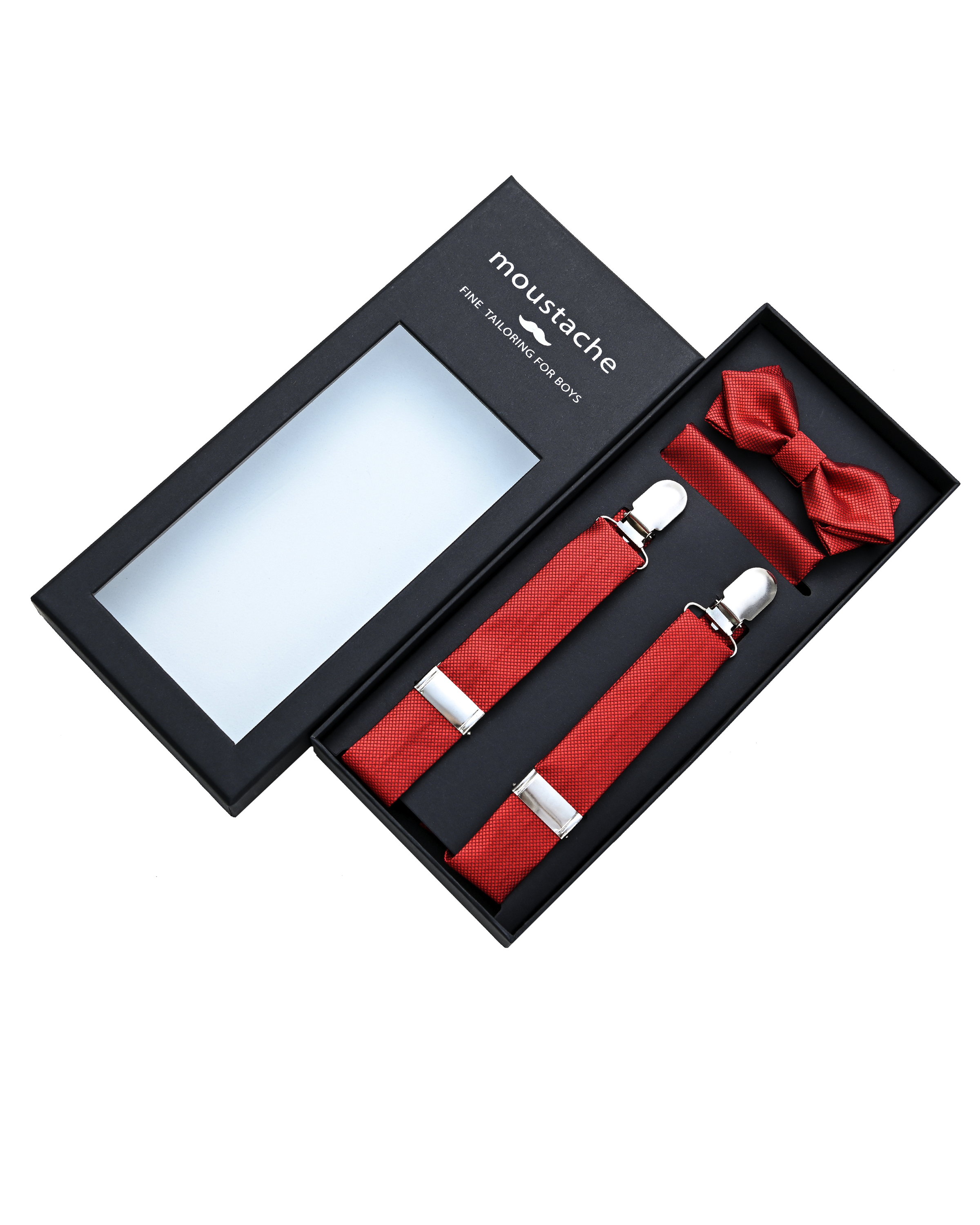 - Set includes matching suspenders, bowtie, and pocket square
