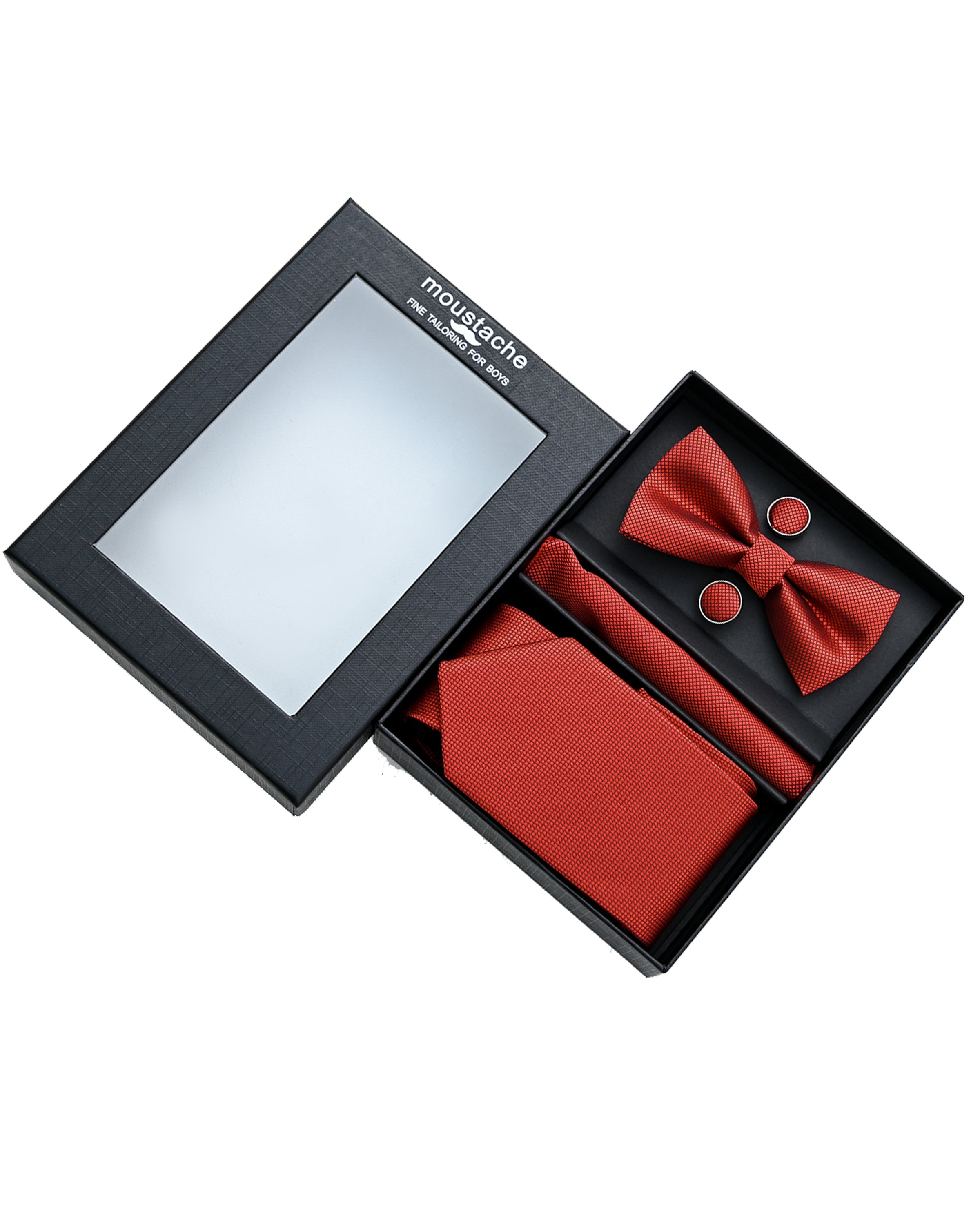 Elevate your young gentleman's attire with the Orange Tie Set from Moustache. This meticulously crafted set includes tie, bowtie, cufflinks and pocket square. Moreover, it's perfect for both formal events and stylish everyday wear.