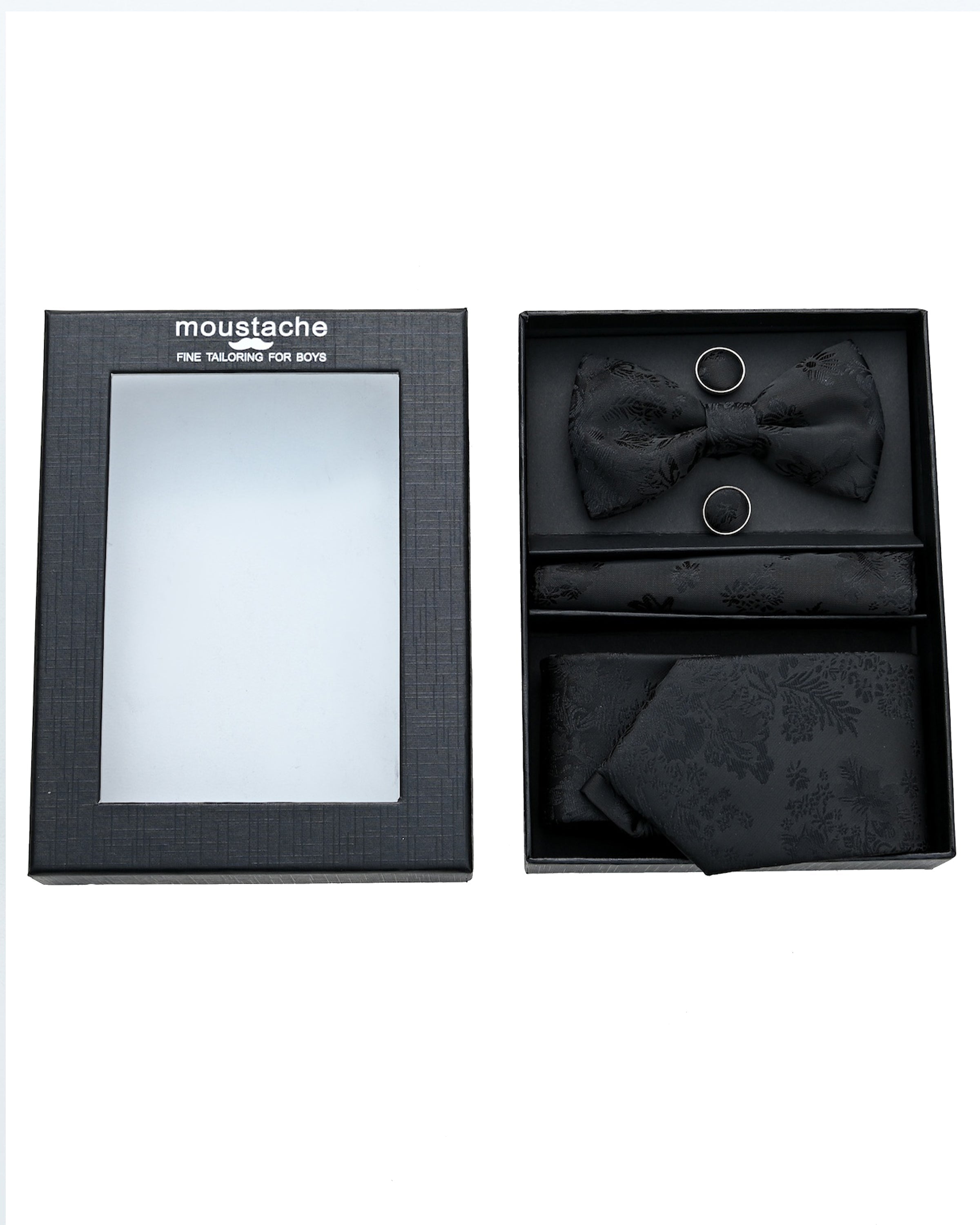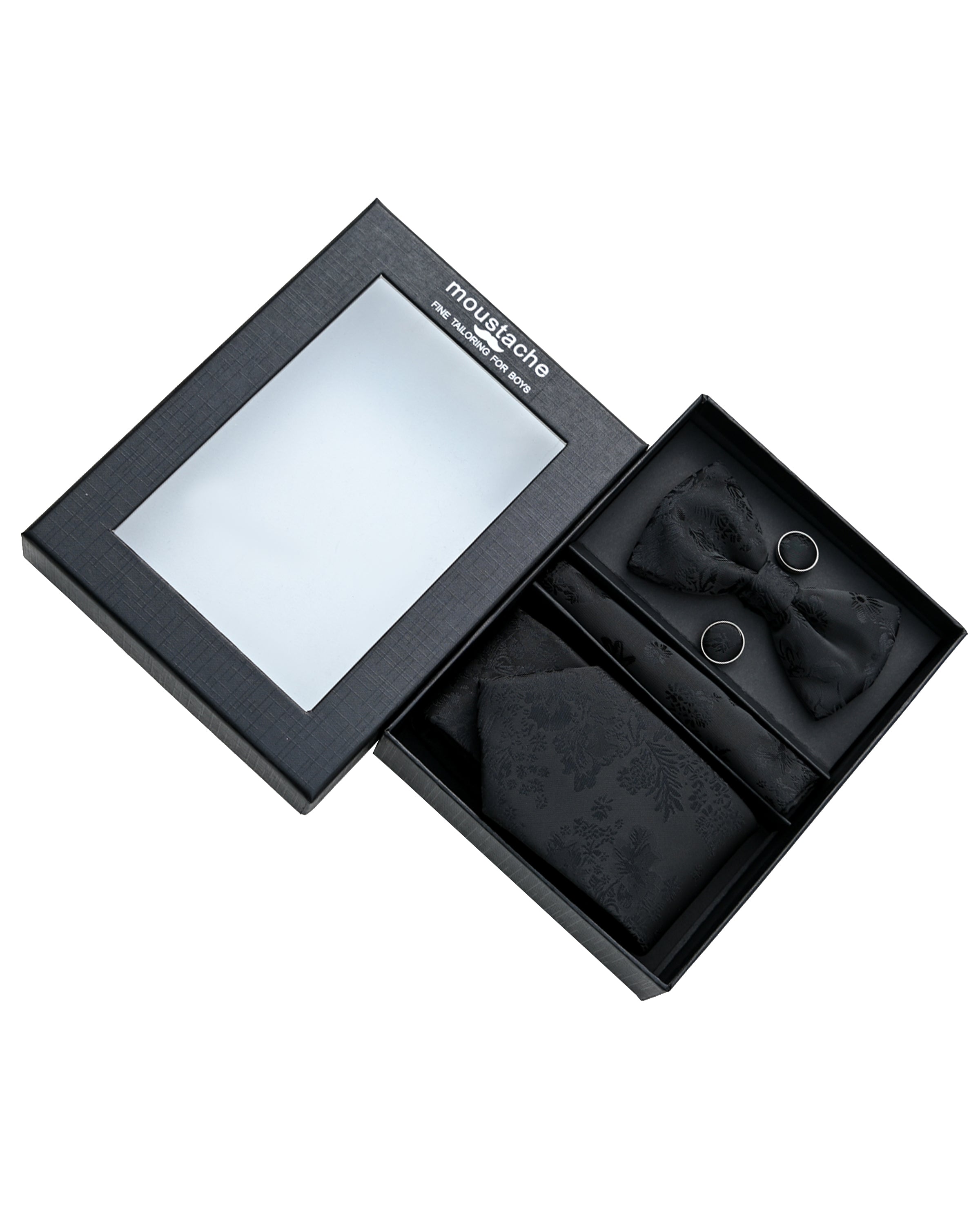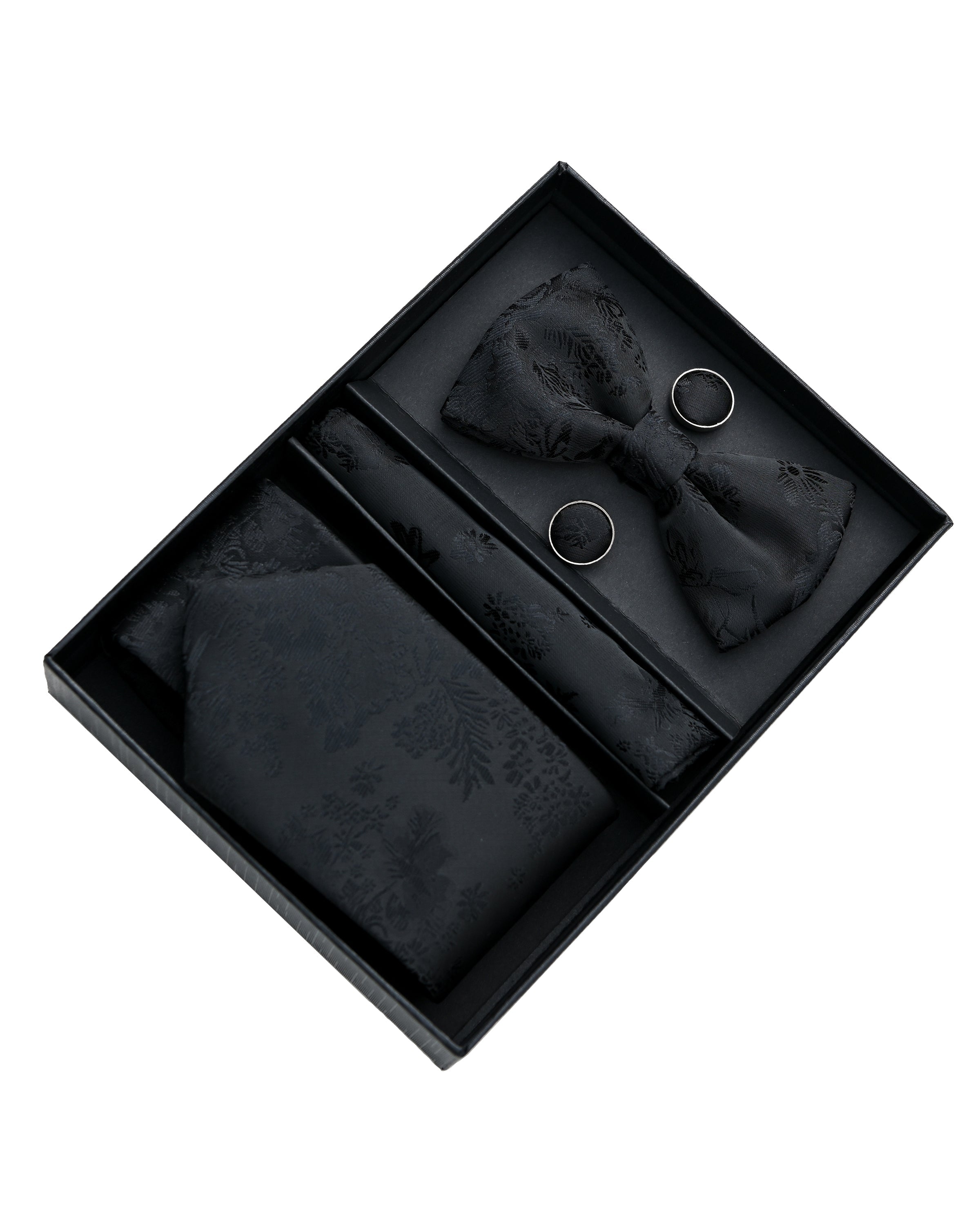 The set includes a tie, bowtie, pocket square and cufflinks. Showcasing a rich black fabric adorned with delicate floral patterns. Thus adding depth and visual interest to any outfit.