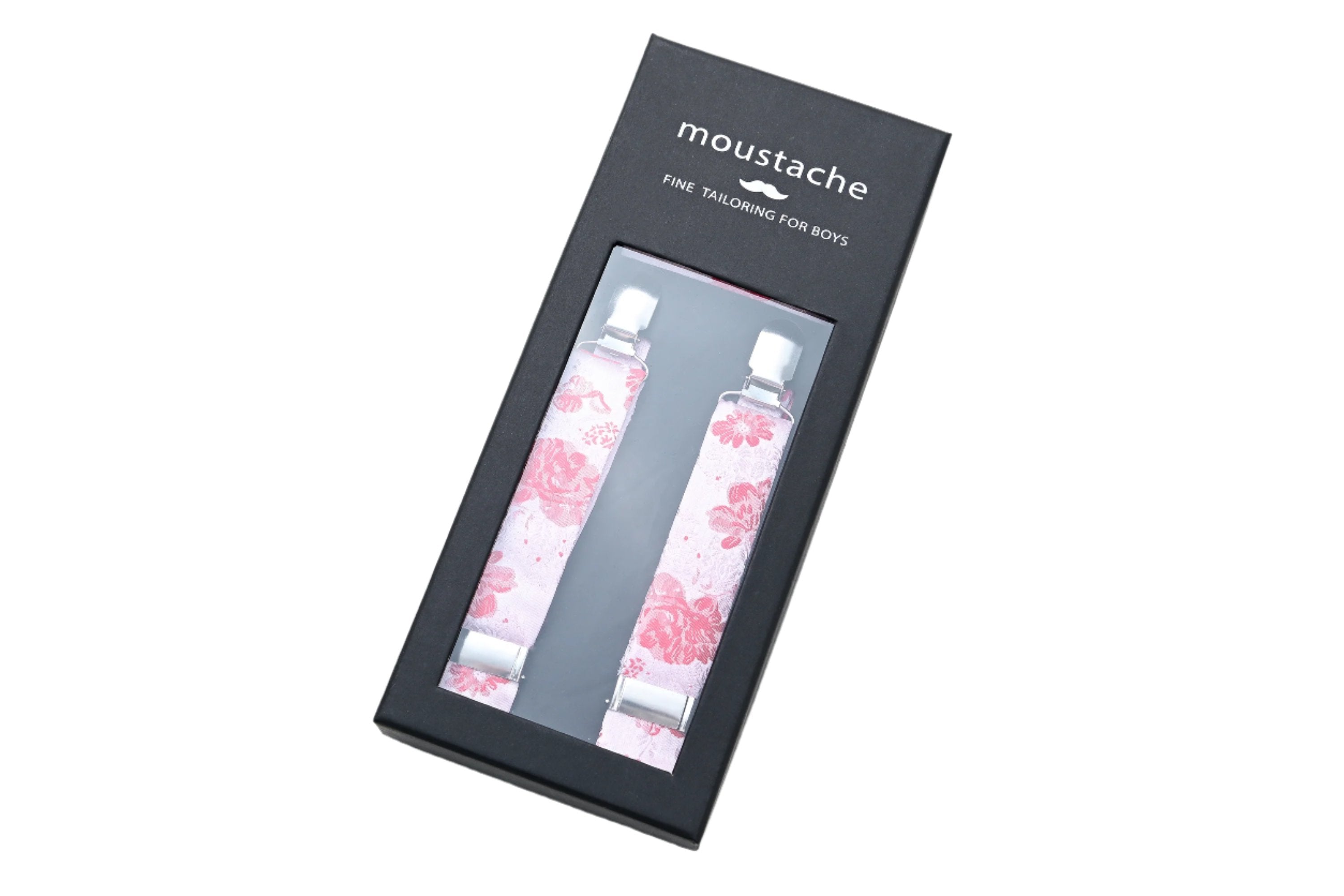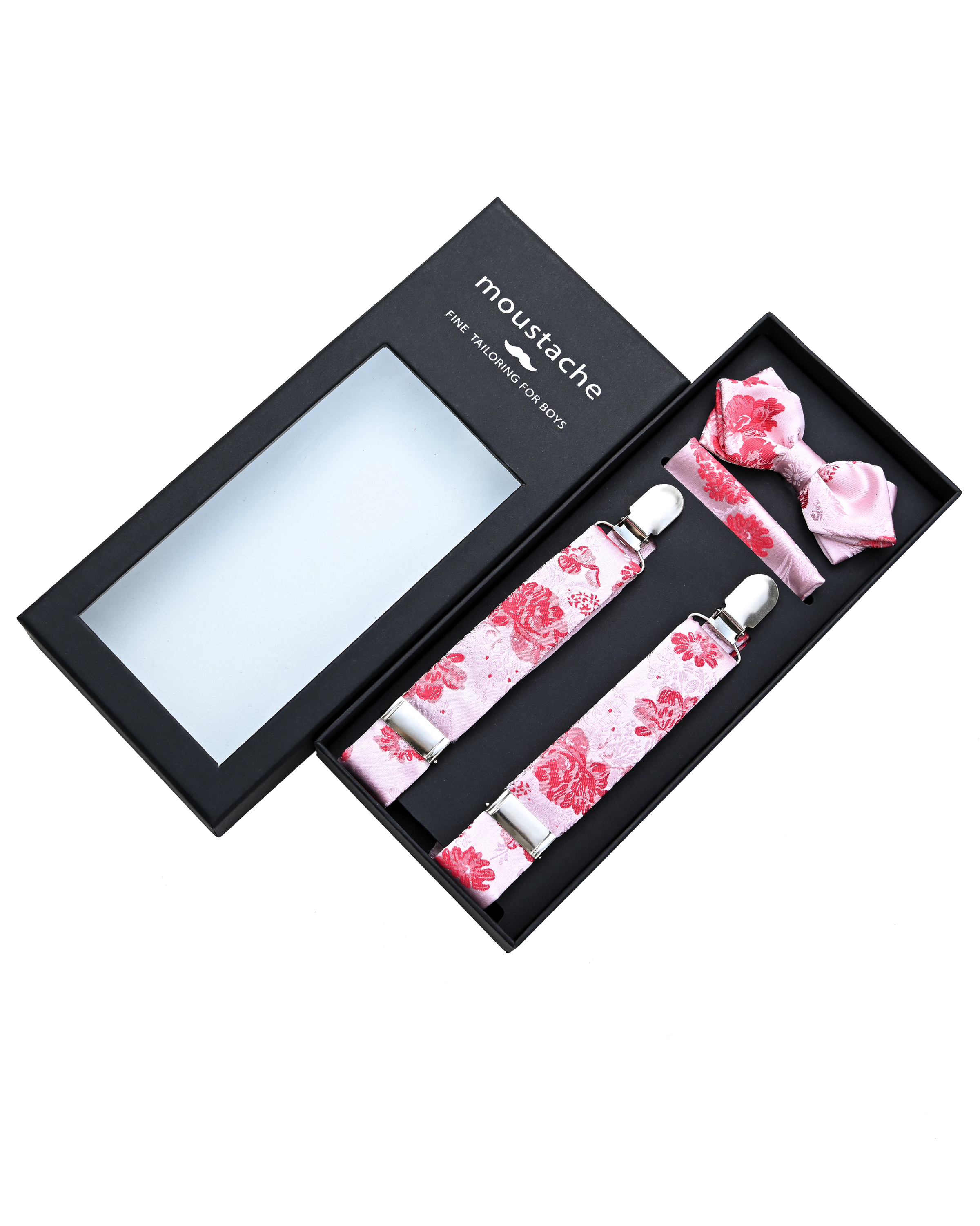 Enhance your young gentleman's wardrobe with the Pink and Red Floral Suspenders Set from Moustache. This meticulously crafted set includes suspenders, bowtie and pocket square. Moreover, it's ideal for formal events and fashionable everyday wear alike.