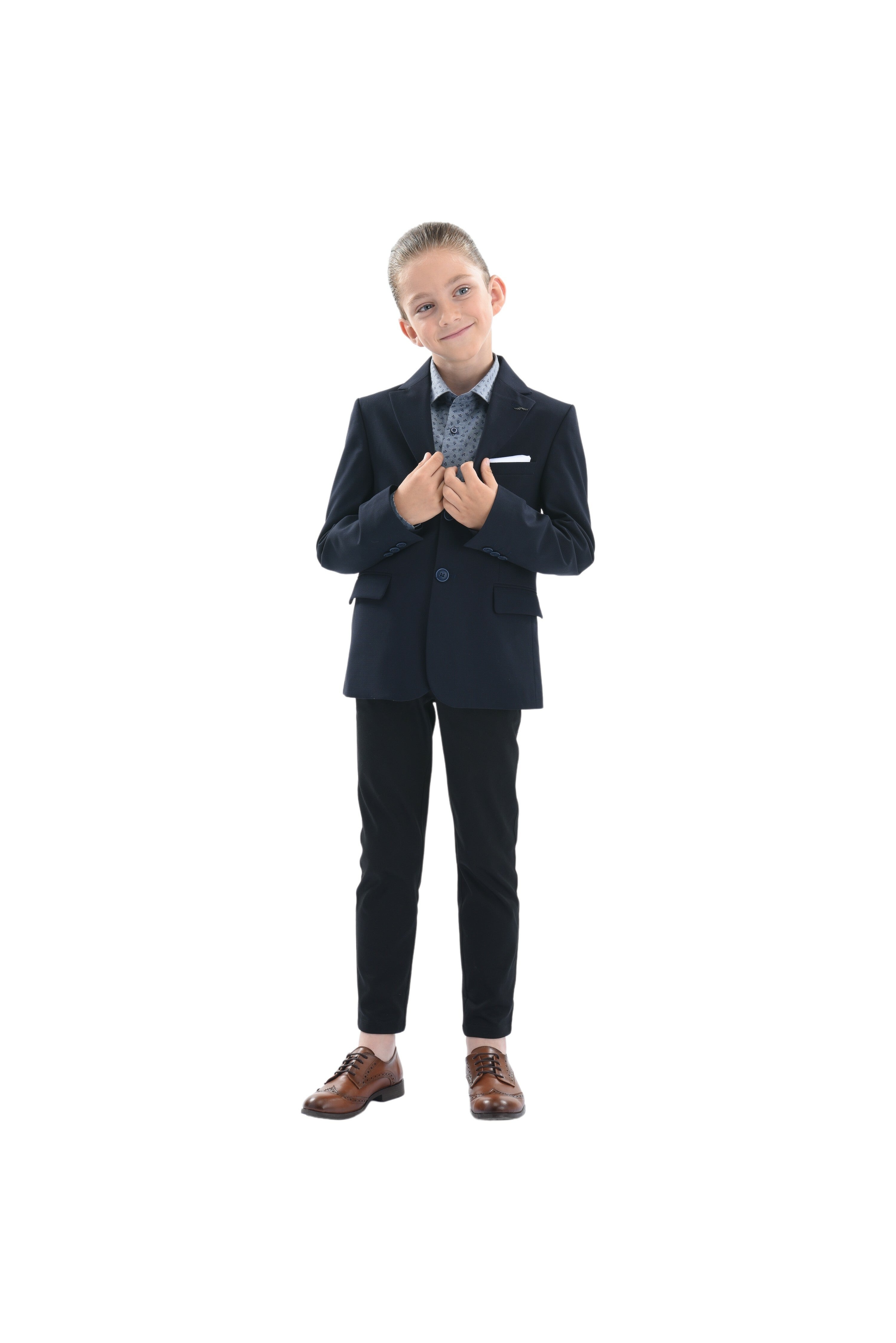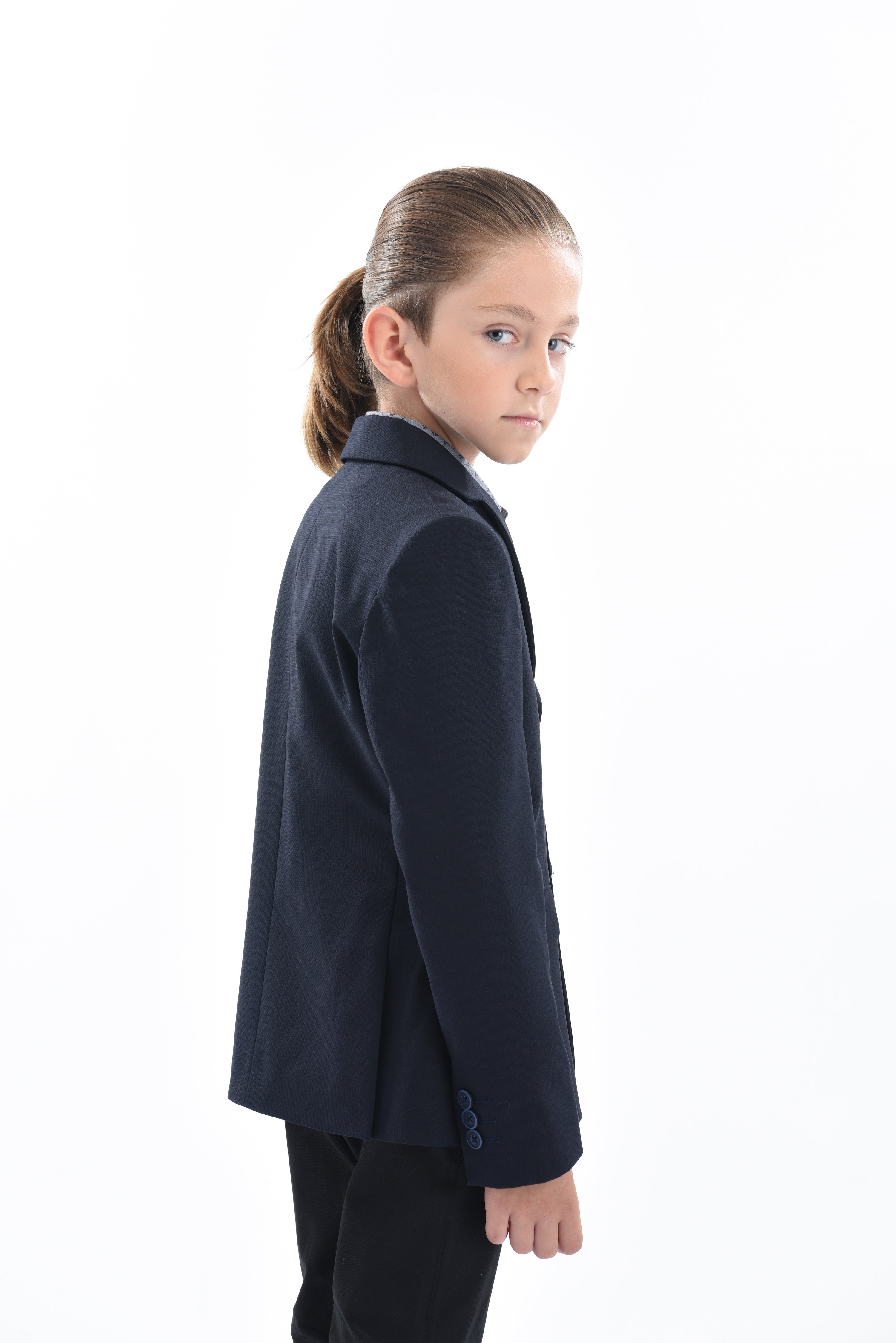 The navy peak lapel blazer features a classic design with dual pockets and a double button closure, adding a touch of sophistication to your child's look. The blazer is designed to be true to size and should be dry cleaned only to maintain its quality.