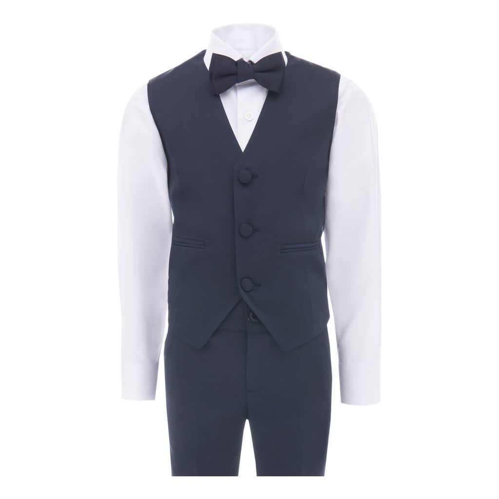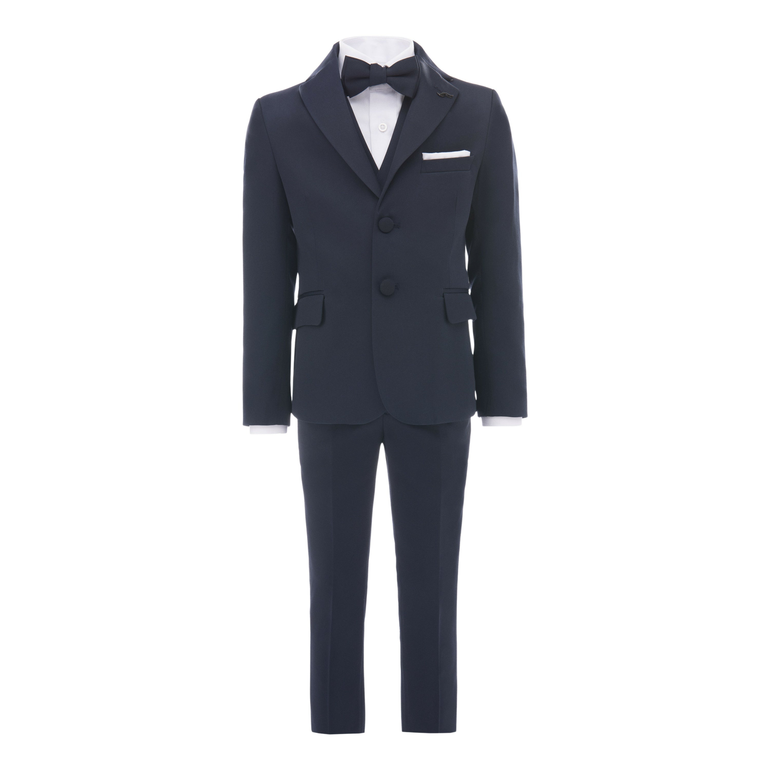 The set is completed with a classic navy blue bow tie, adding a final touch of elegance to the ensemble.