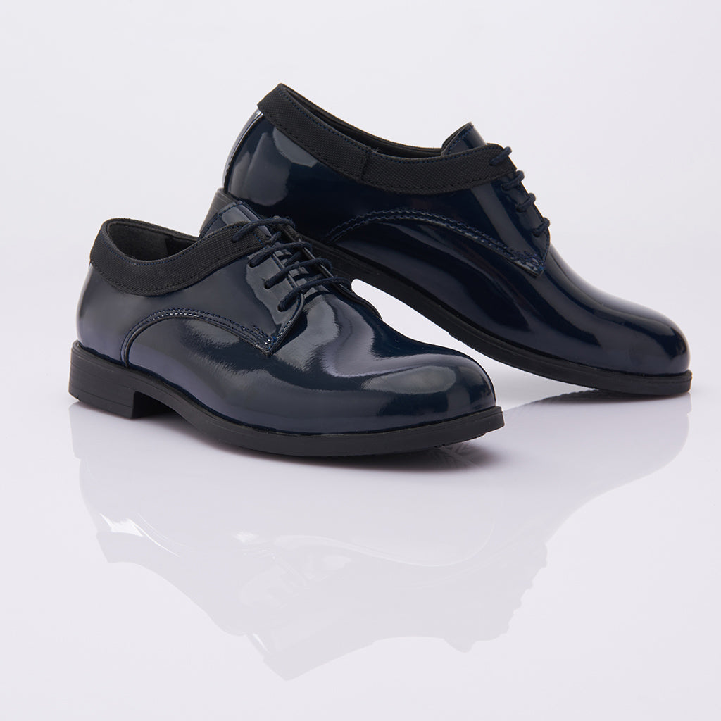 Introducing the Navy Cap Toe Oxford Shoes from Moustache, a perfect addition to your child's wardrobe. These sophisticated shoes feature a clean and shiny patent finish, offering an elegant look that is perfect for special occasions, whether it's a wedding, a formal event, or a family gathering. The lace closure ensures a secure fit, allowing your child to move comfortably and confidently throughout the day.