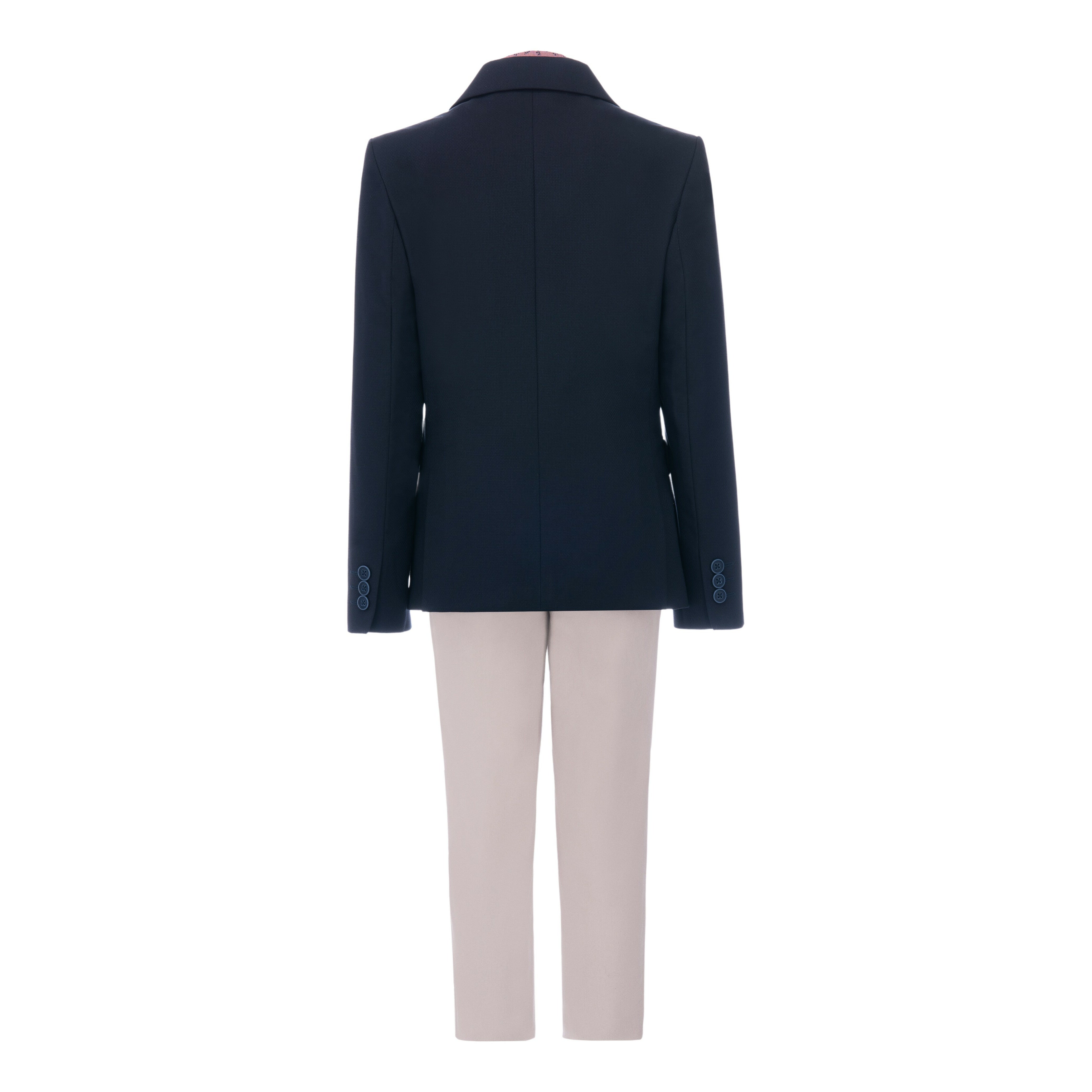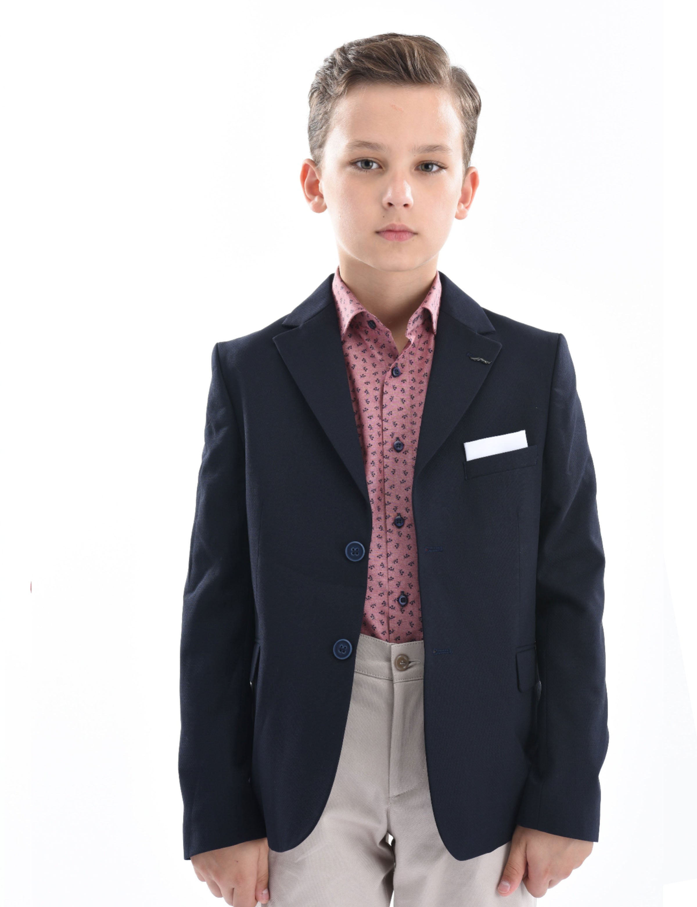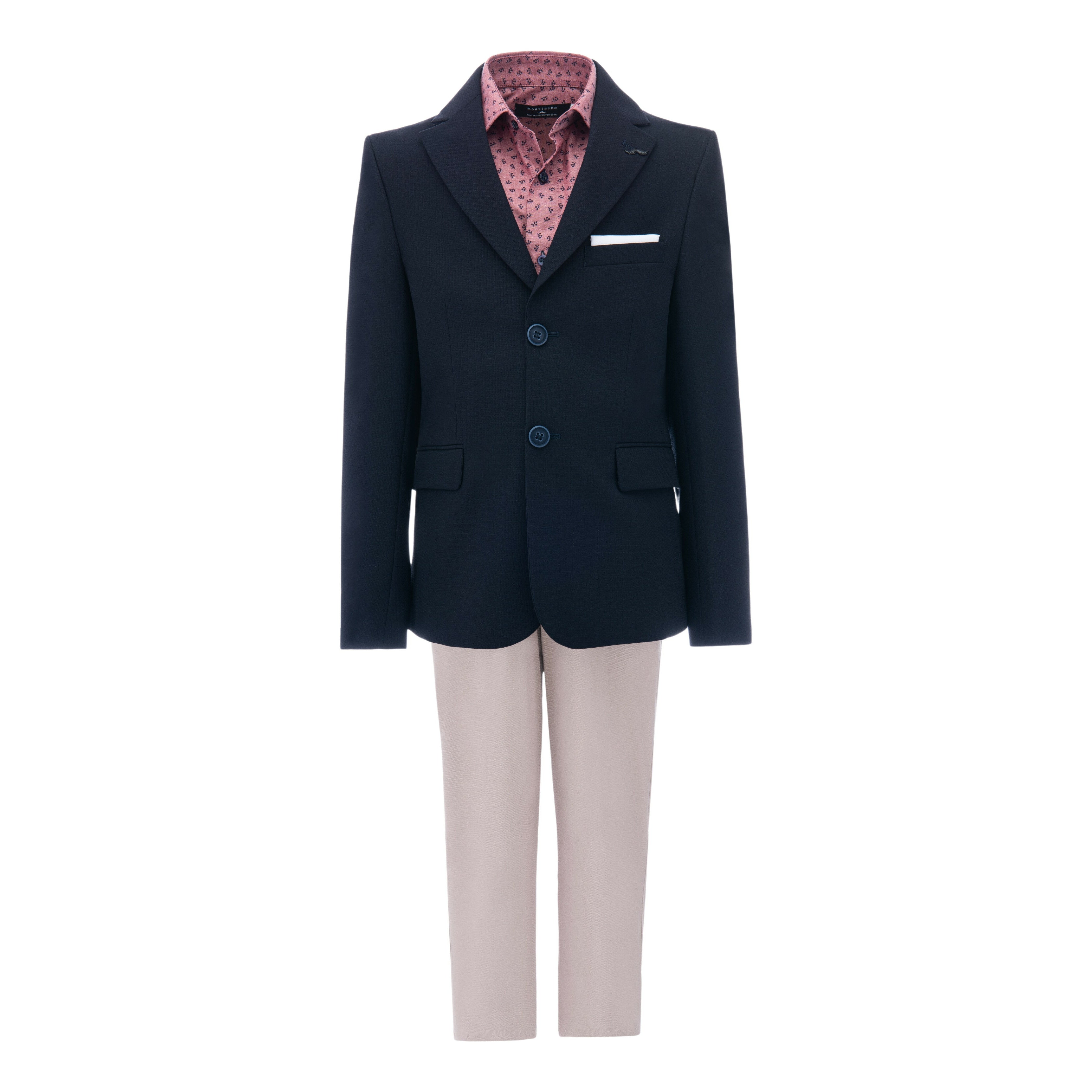 Dress your little gentleman in style with our Navy Declan Formal Dress Outfit from Moustache. This sophisticated 3-piece ensemble includes a navy peak lapel blazer, a red dandelion print dress shirt, and matching beige pants.