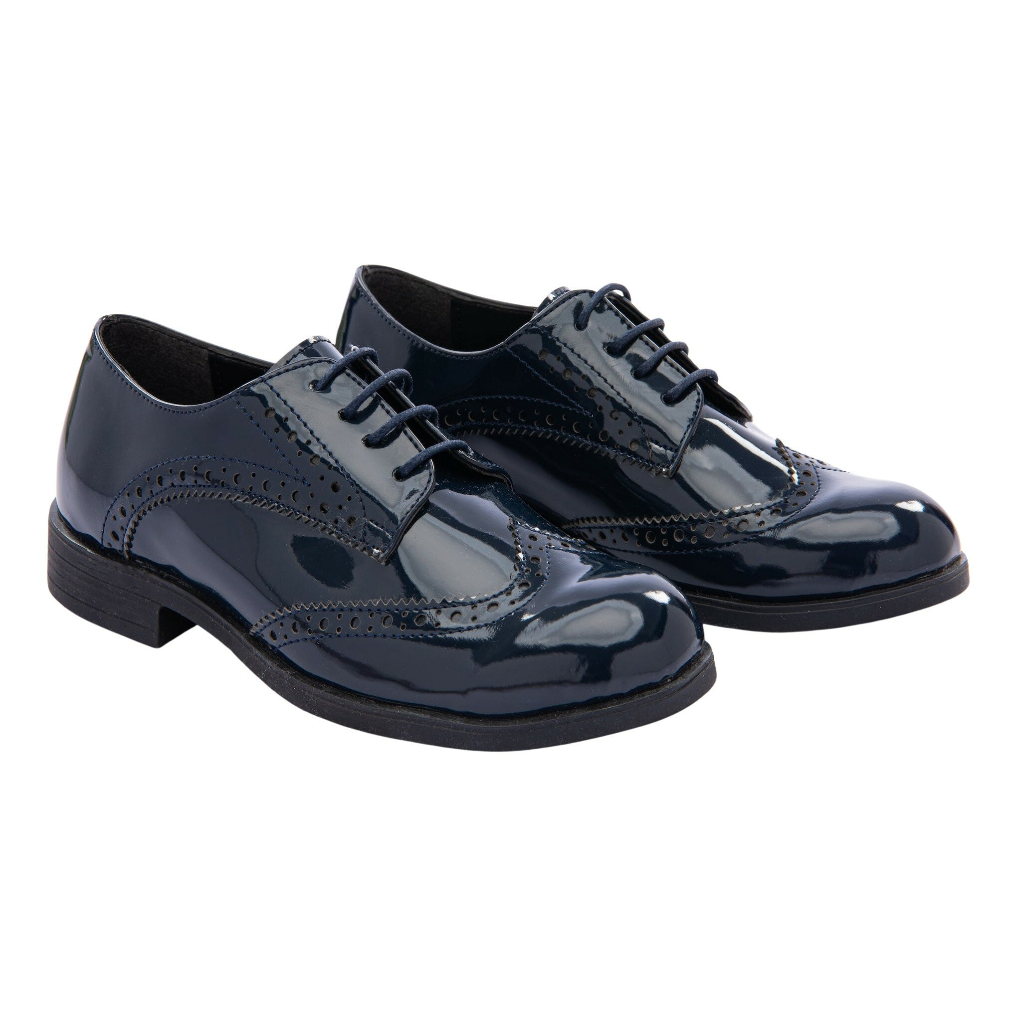 Step up your child's shoe game with the navy patent brogue style dress shoes from Moustache. These sophisticated lace-ups exude timeless elegance, making them a must-have for any formal occasion or special event.