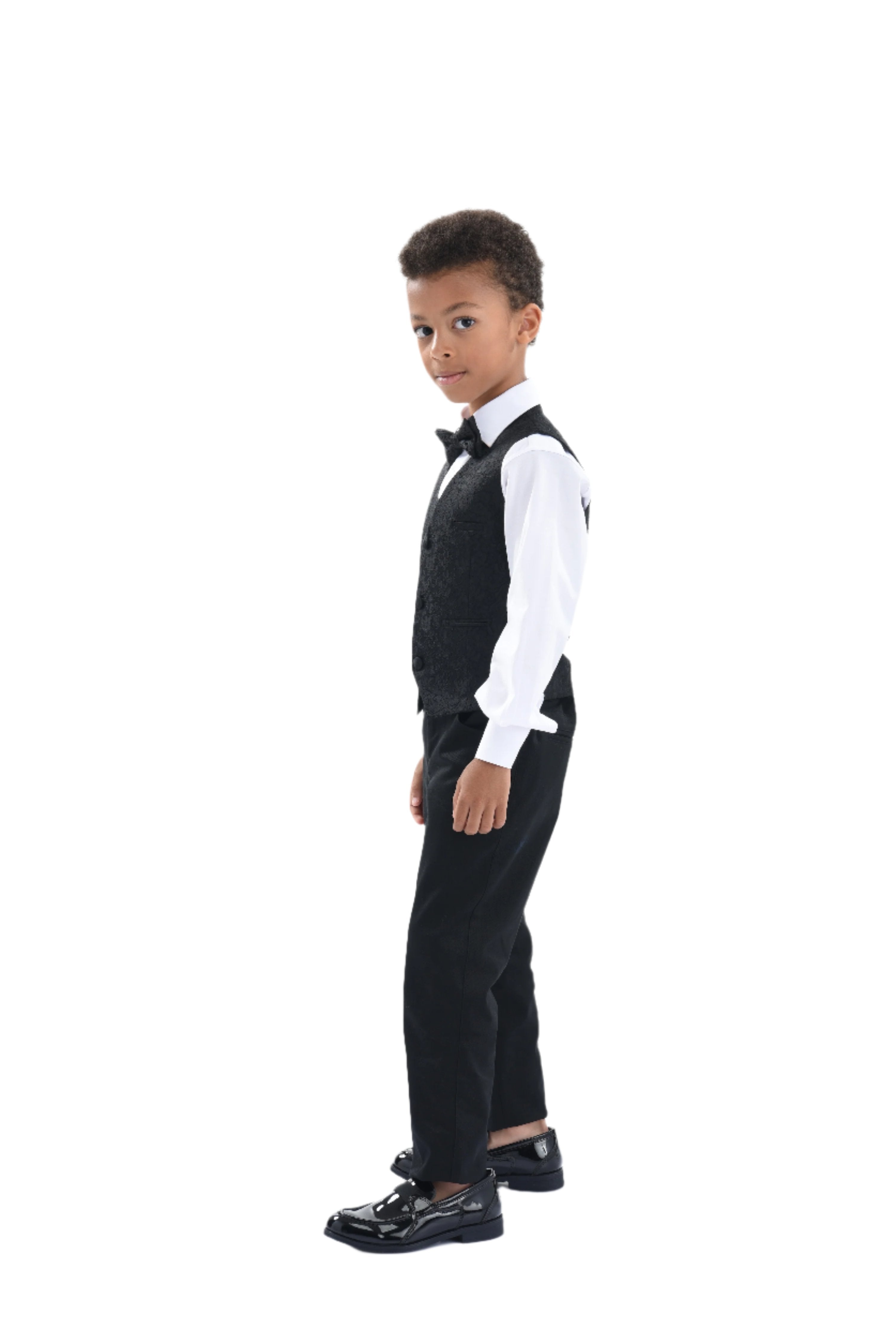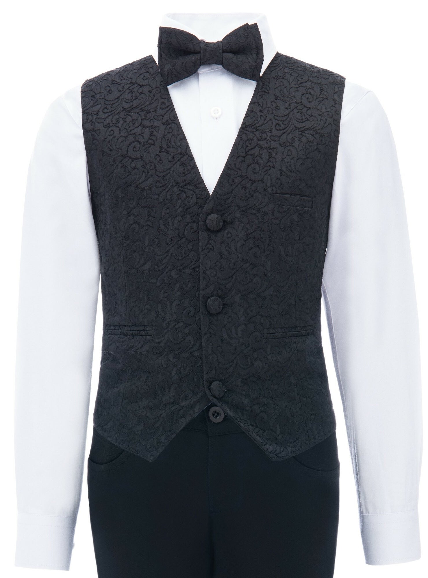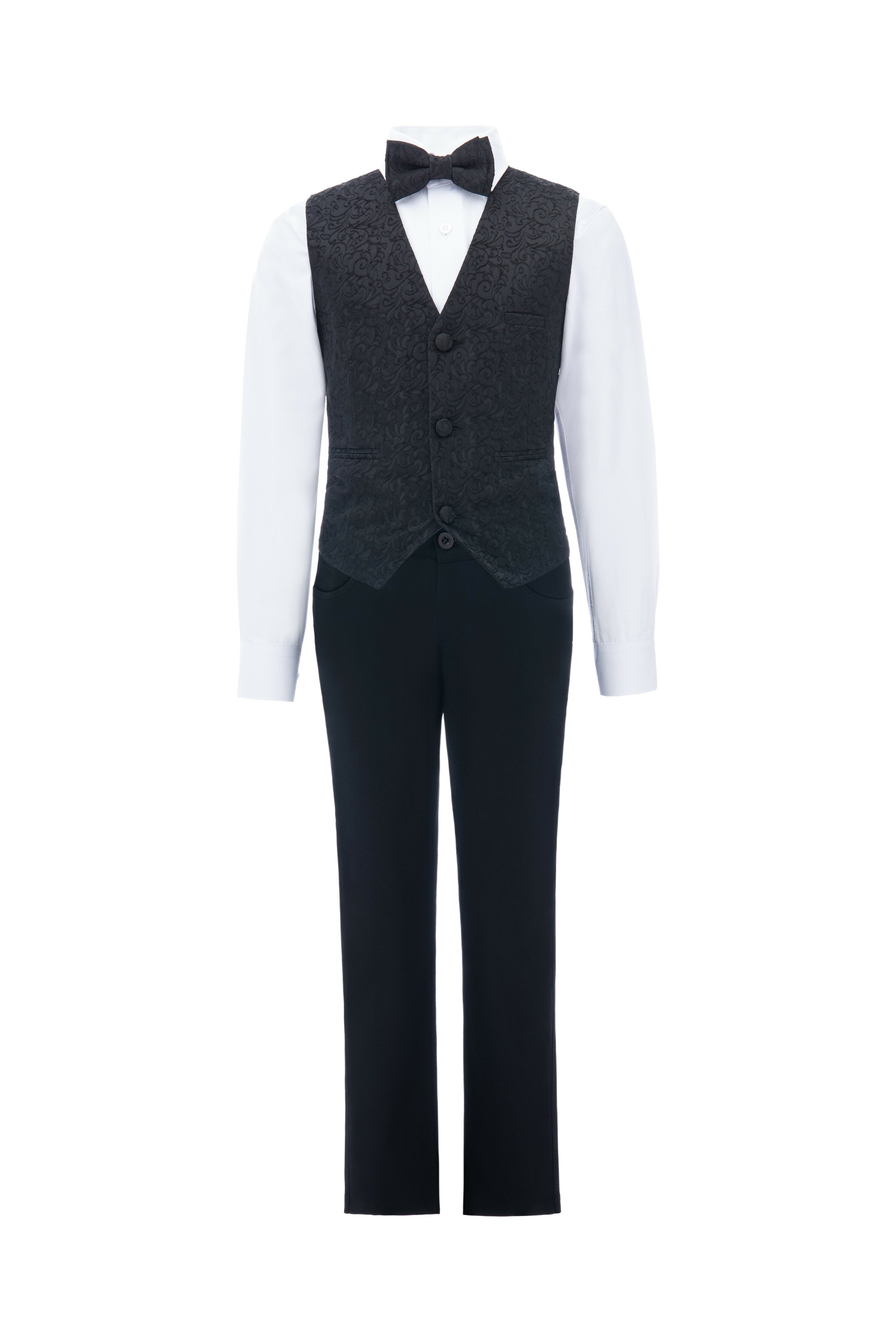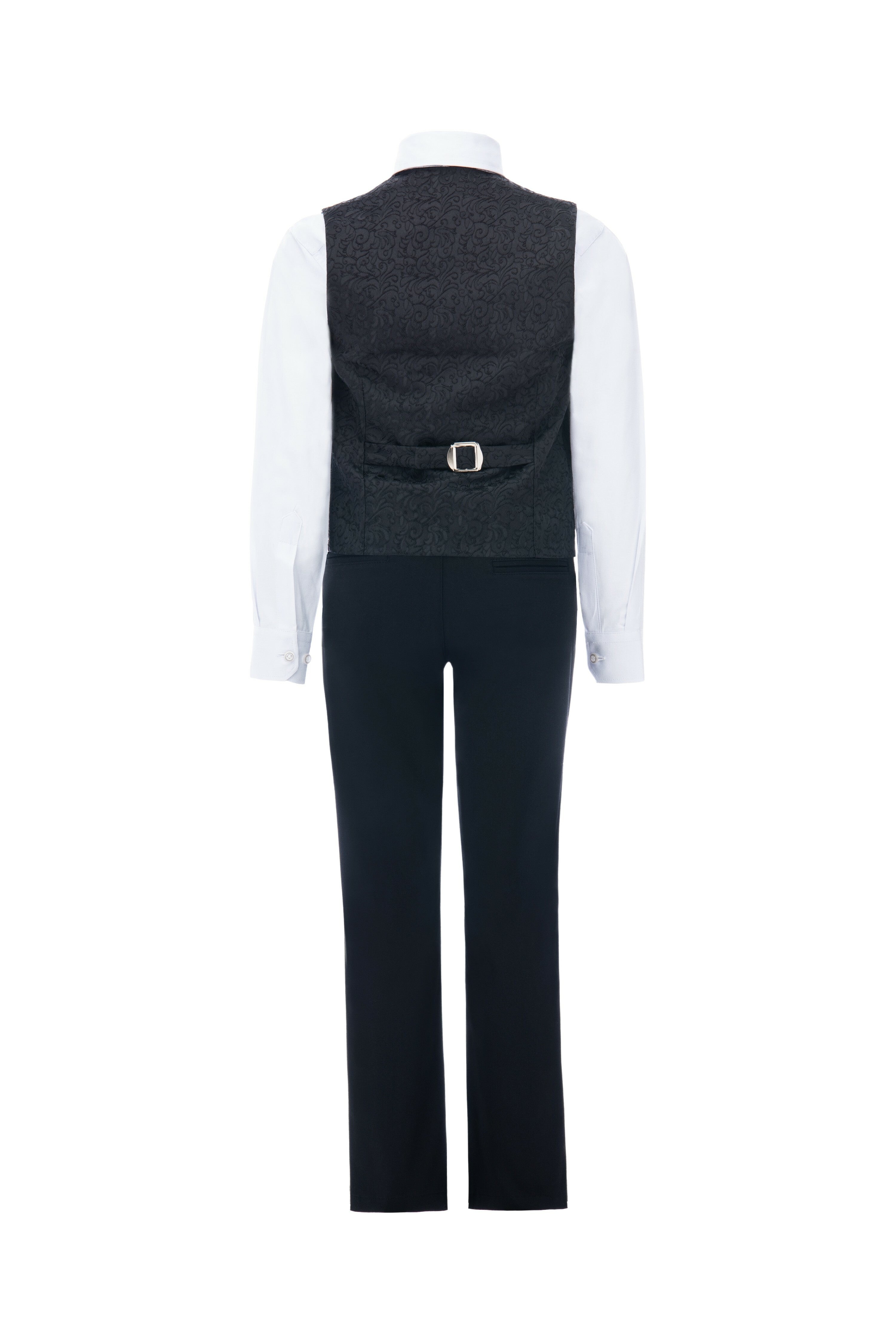 Introducing the Nero Floral Vest Outfit Set for kid boys from the Moustache collection by Kids Atelier. This stylish set includes a dapper vest with a three-button closure, a satin interior. An adjustable waist for the perfect fit! Paired with a matching bow tie, black dress pants, and a crisp white dress shirt, this ensemble adds a touch of elegance to any outfit.