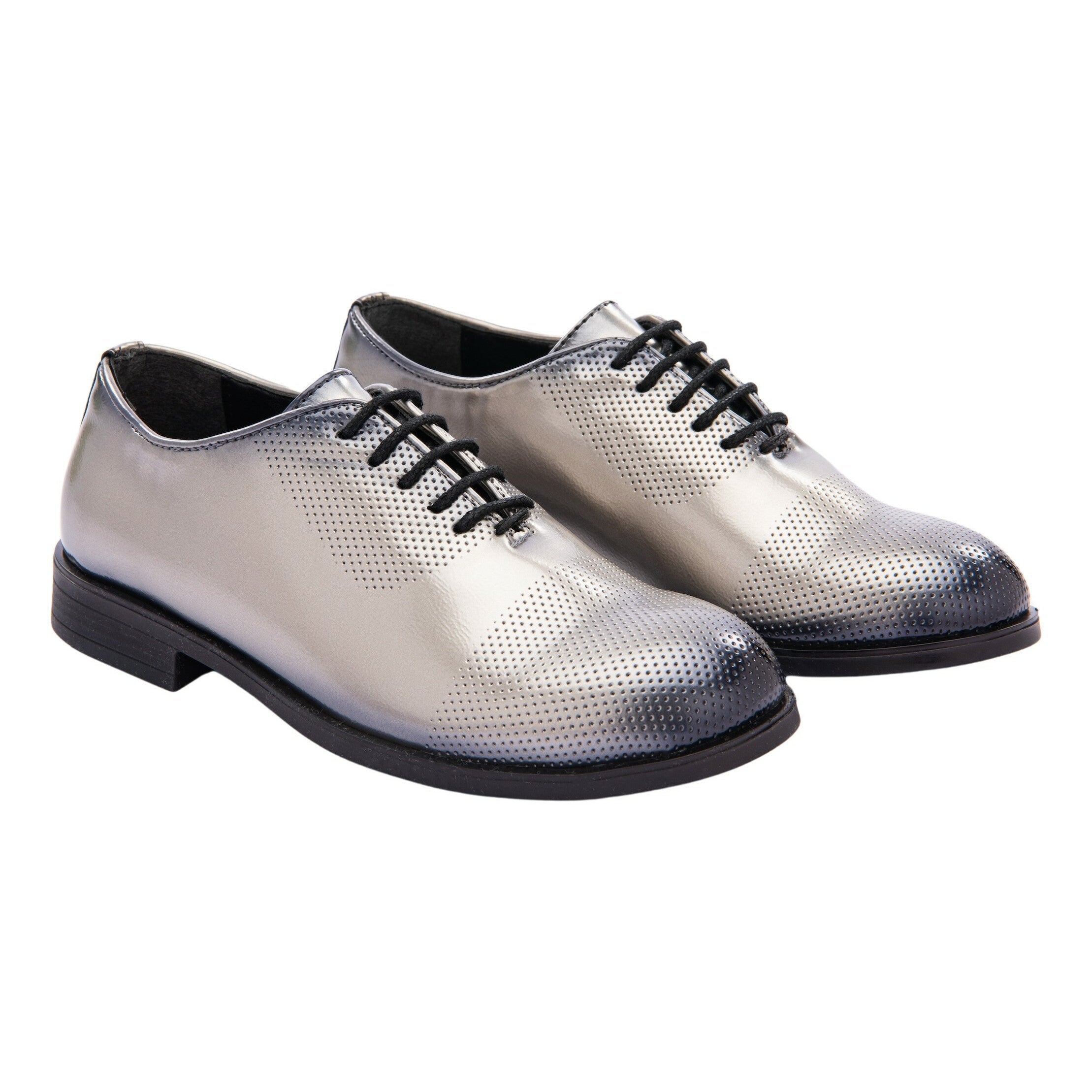 Introducing the Platinum Ivory Closed Lace Style Dress Shoes for kids and baby boys from Moustache. These shoes feature a clean and bright patent finish, offering a sophisticated look for any special occasion. The lace closure ensures a secure fit, while the perforated design between the heel and toe adds a touch of elegance.