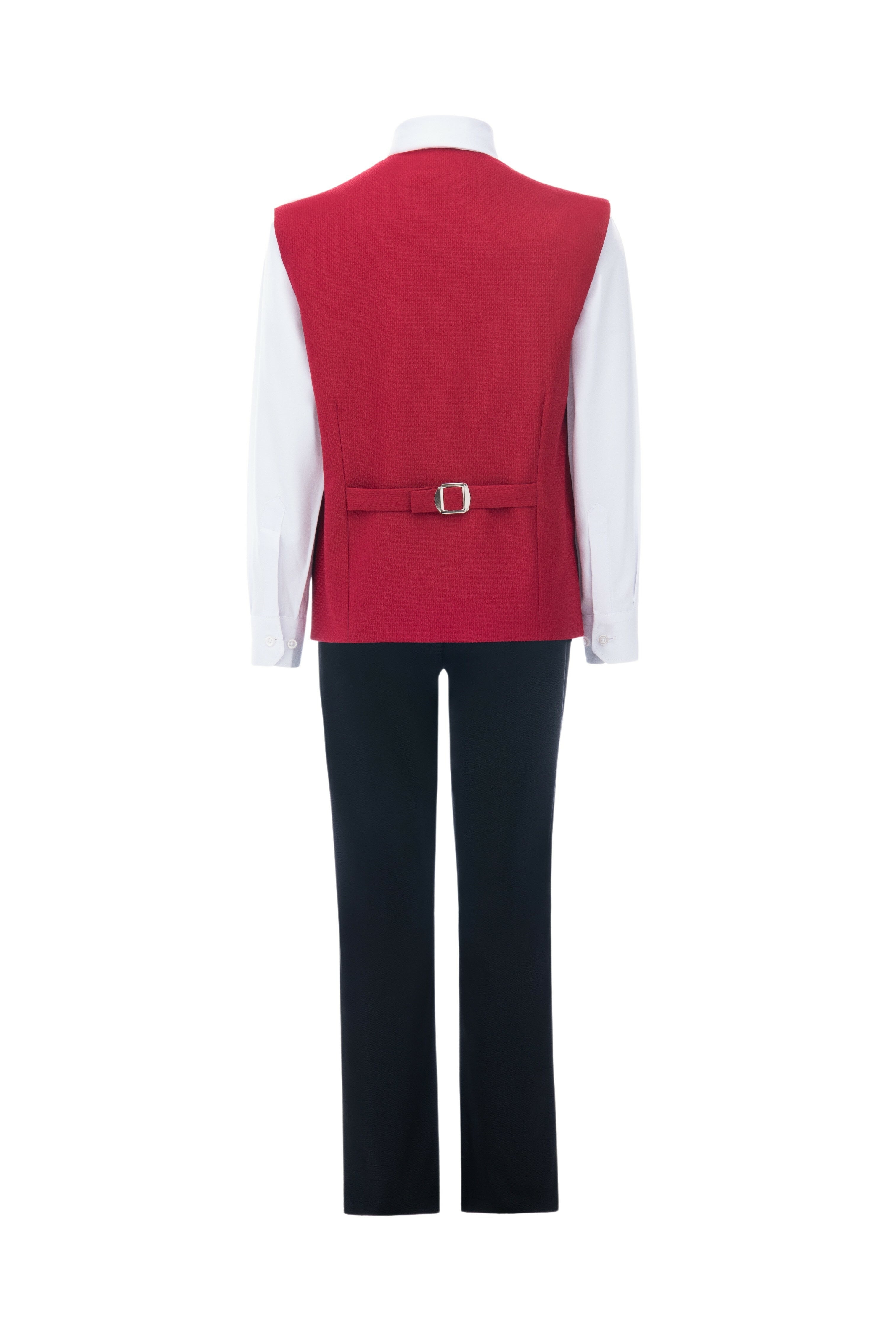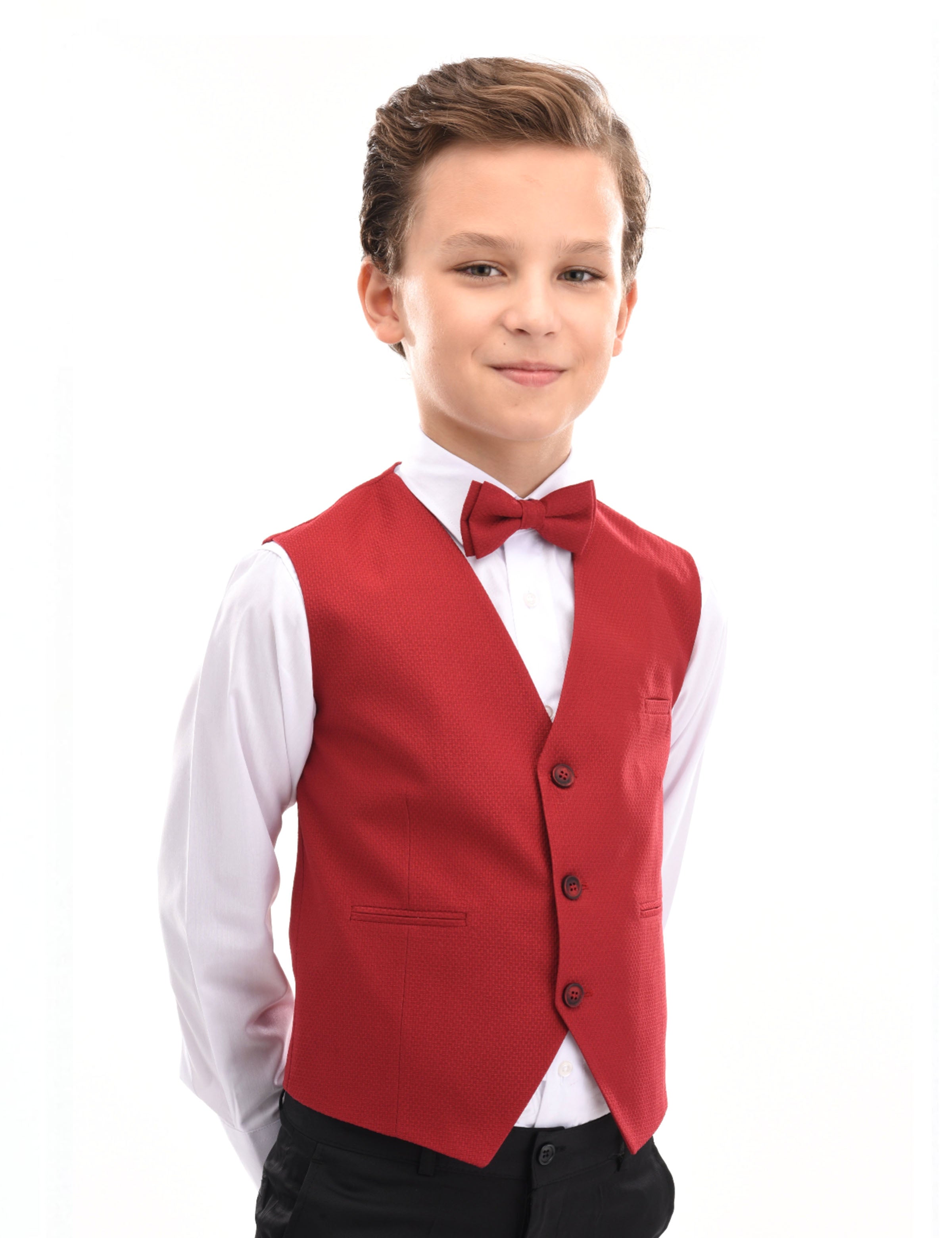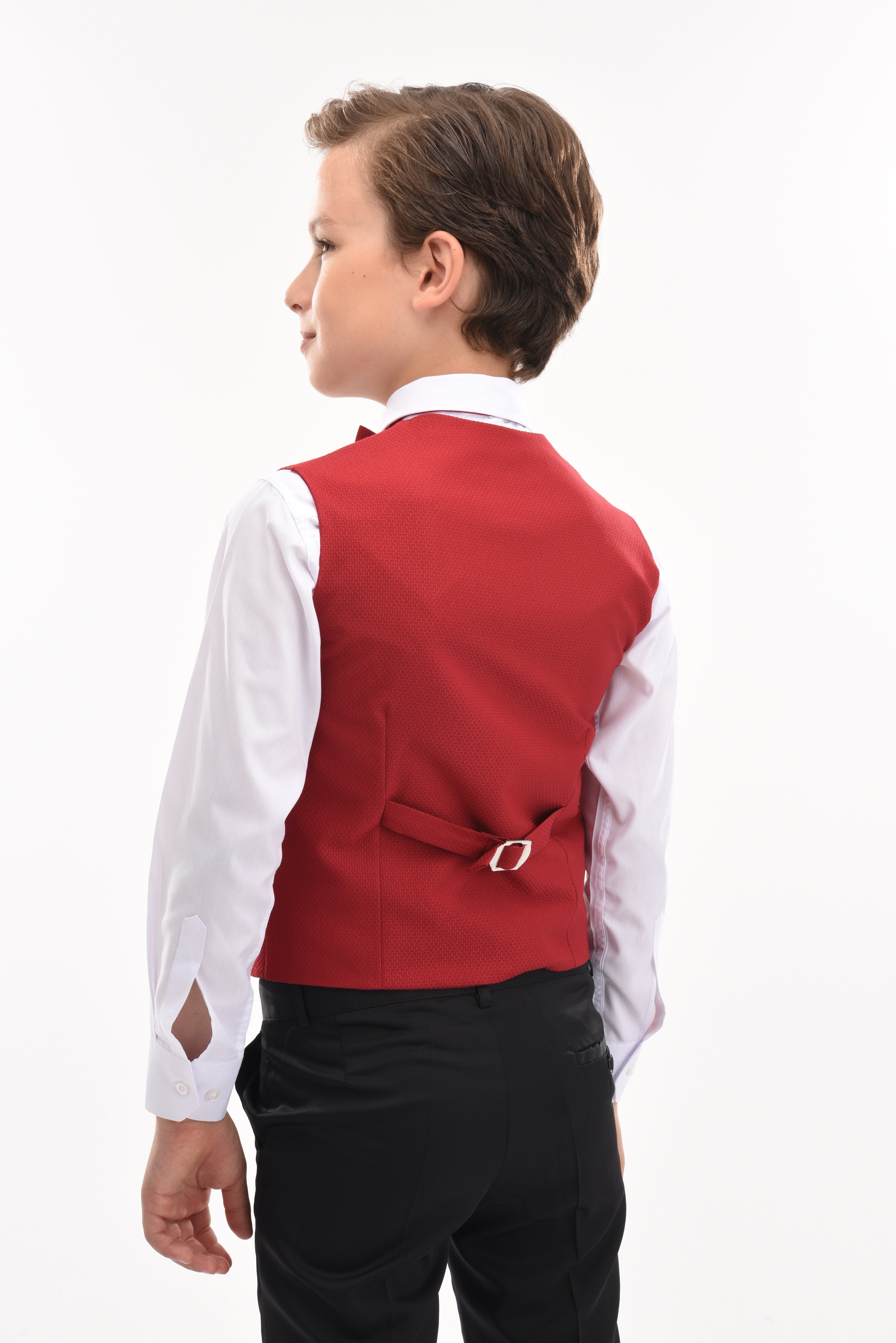 Introducing the Lachlan Suit Vest Outfit Set for boys from the Moustache collection by Kids Atelier. This stylish set includes a dapper vest with a three-button closure, a satin interior. An adjustable waist for the perfect fit! Paired with a matching red bow tie, black dress pants, and a crisp white dress shirt, this ensemble adds a touch of elegance to any outfit.