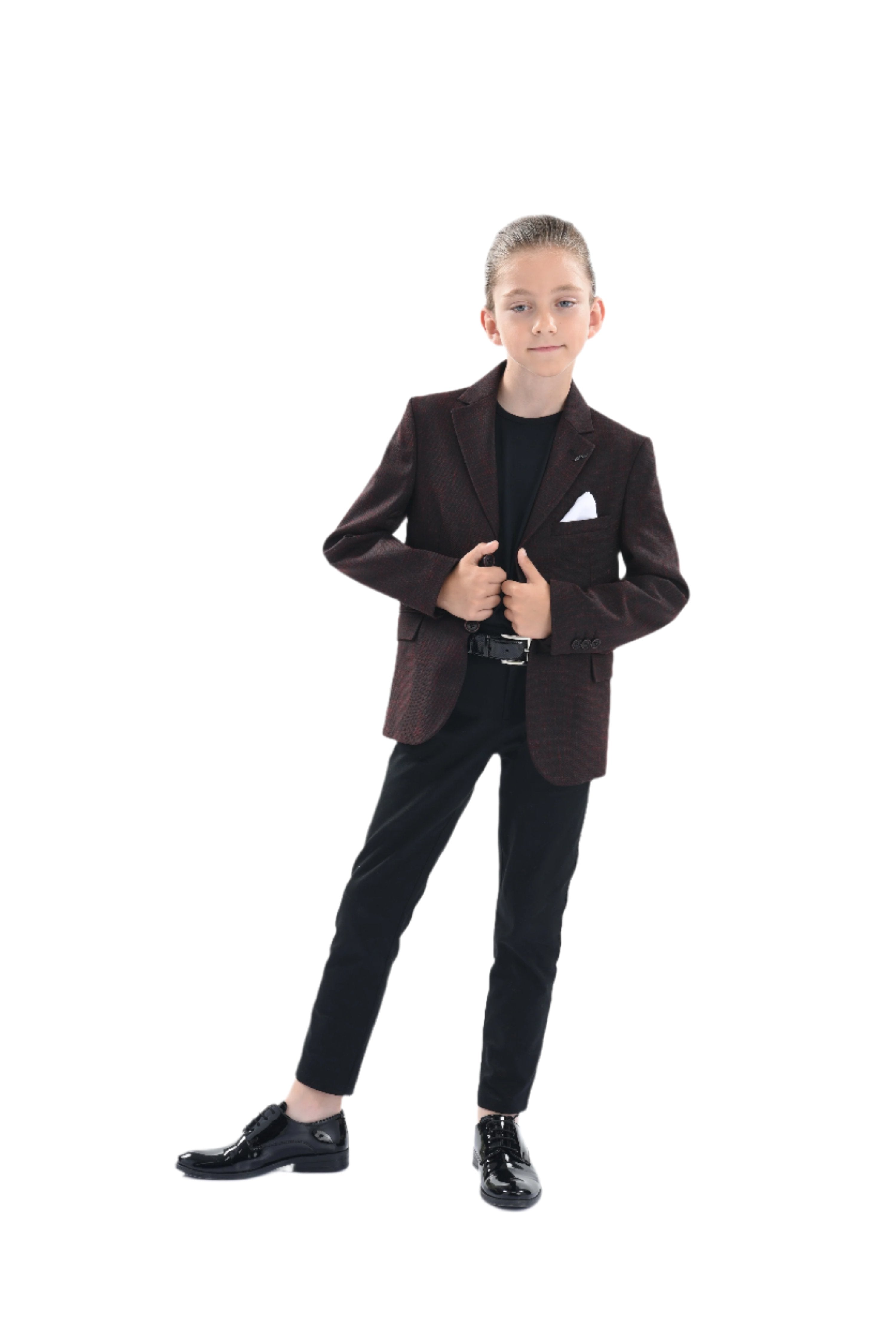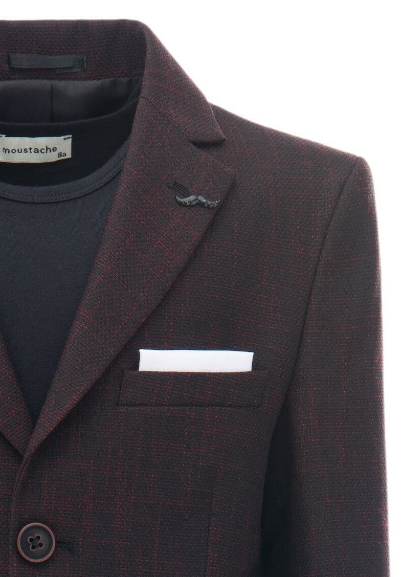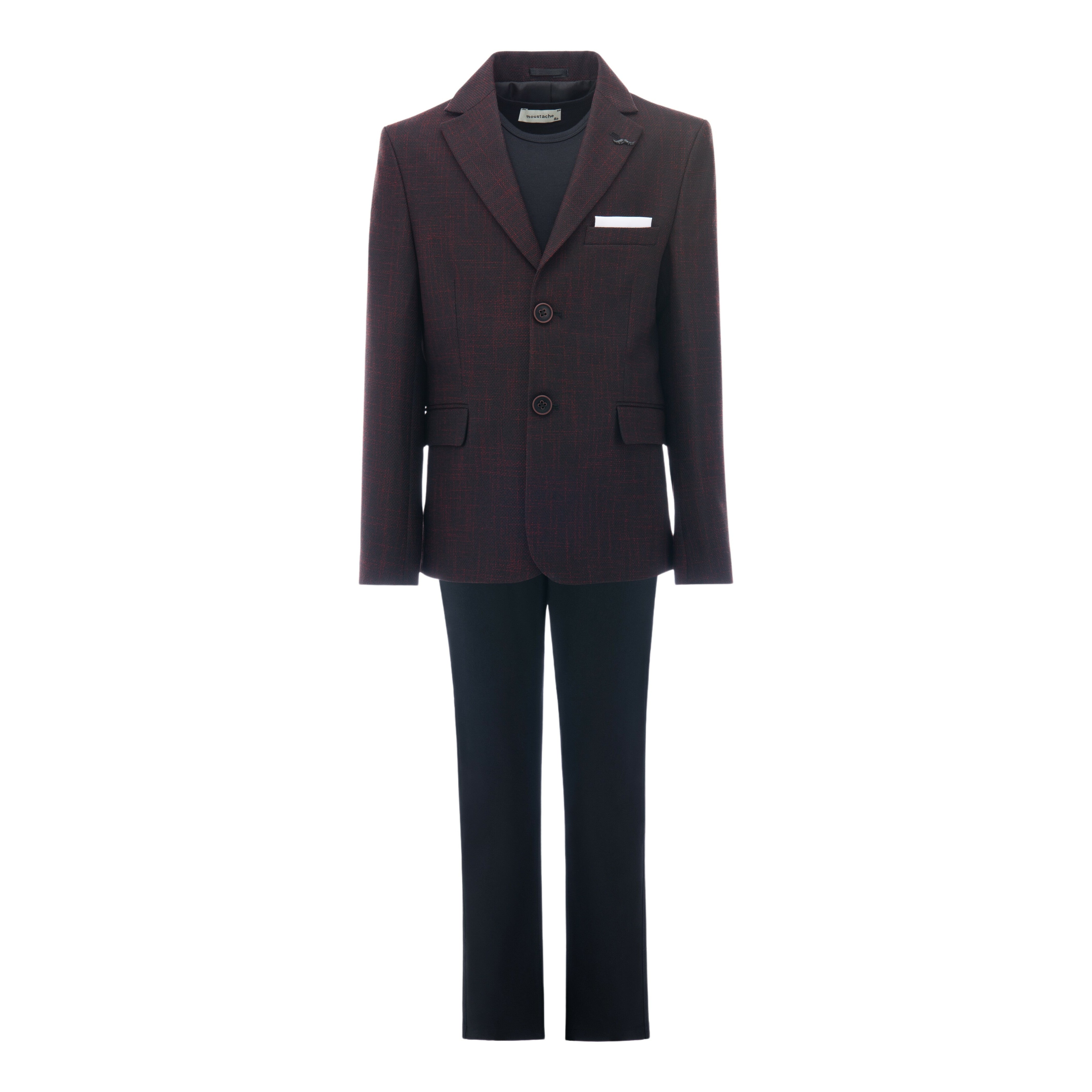 Introducing the Red Olivero Casual Dress Outfit from Moustache. This stylish 3-piece ensemble includes a red bordeaux lapel blazer, a black plain cotton t-shirt, and matching black pants, creating the perfect set for any special occasion.