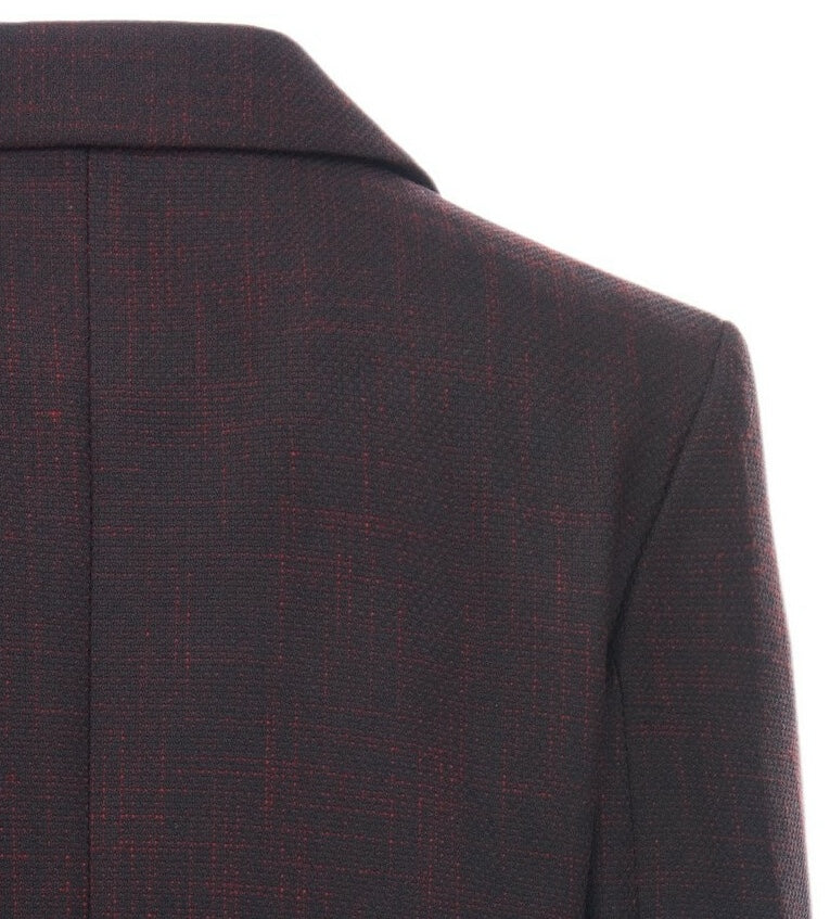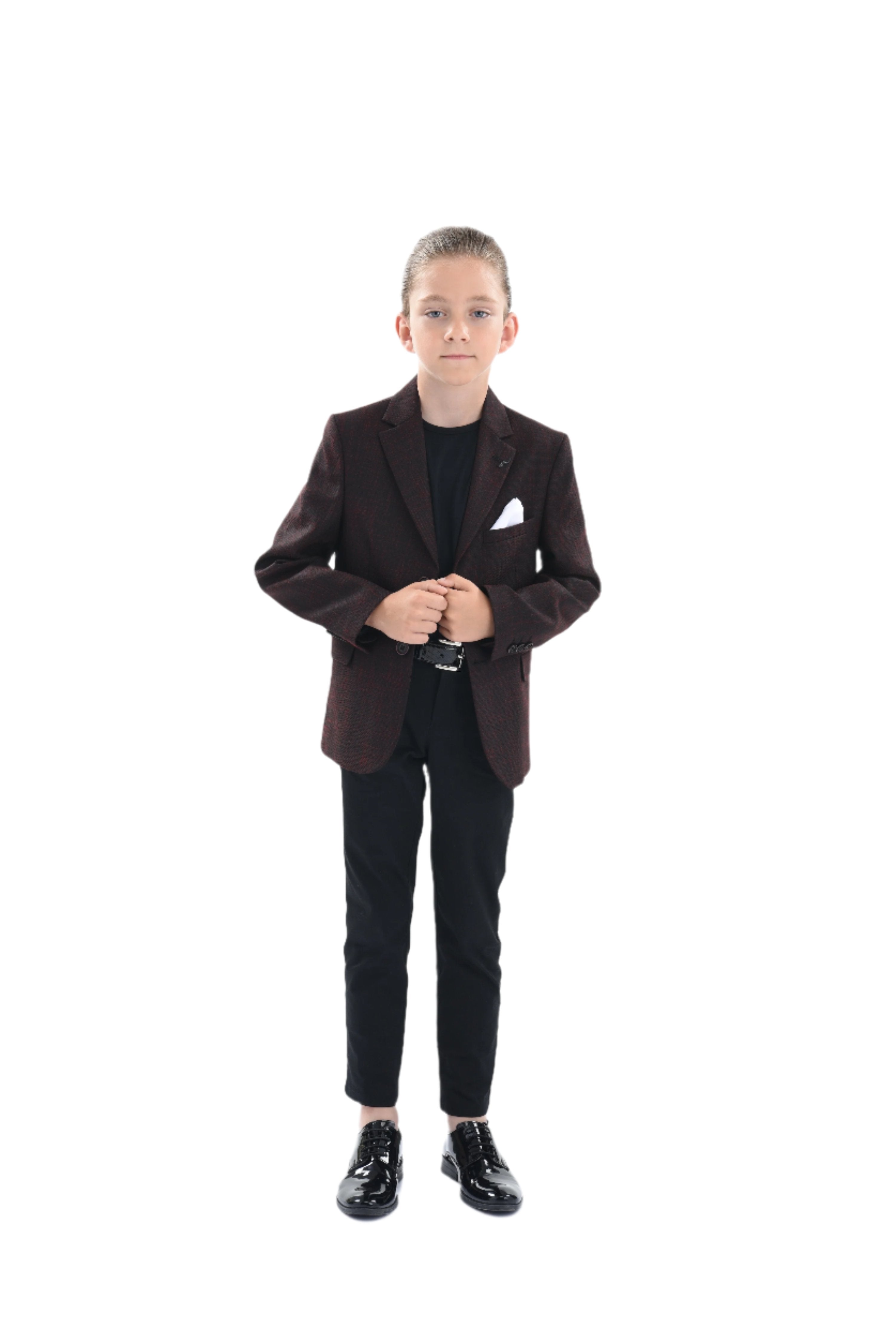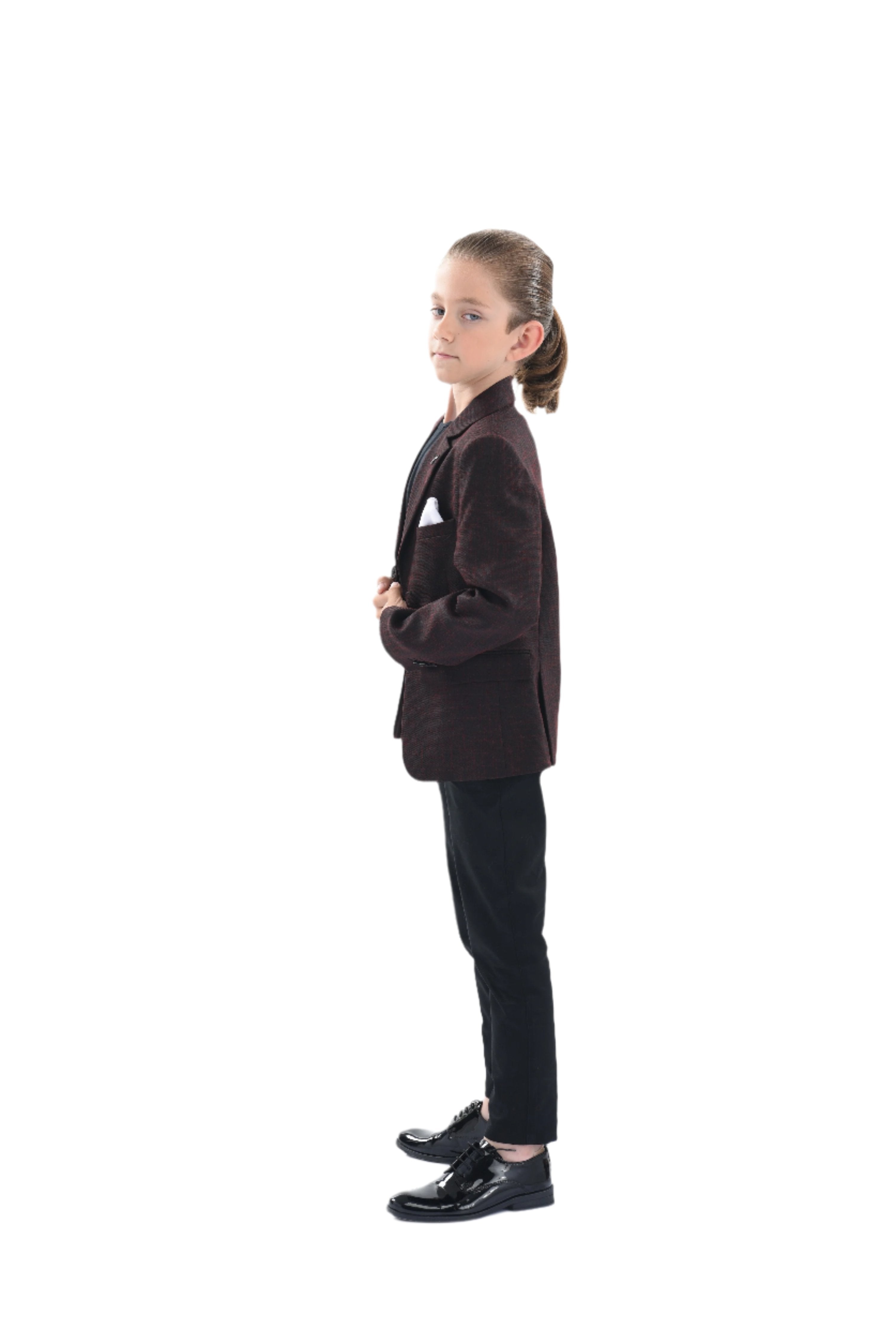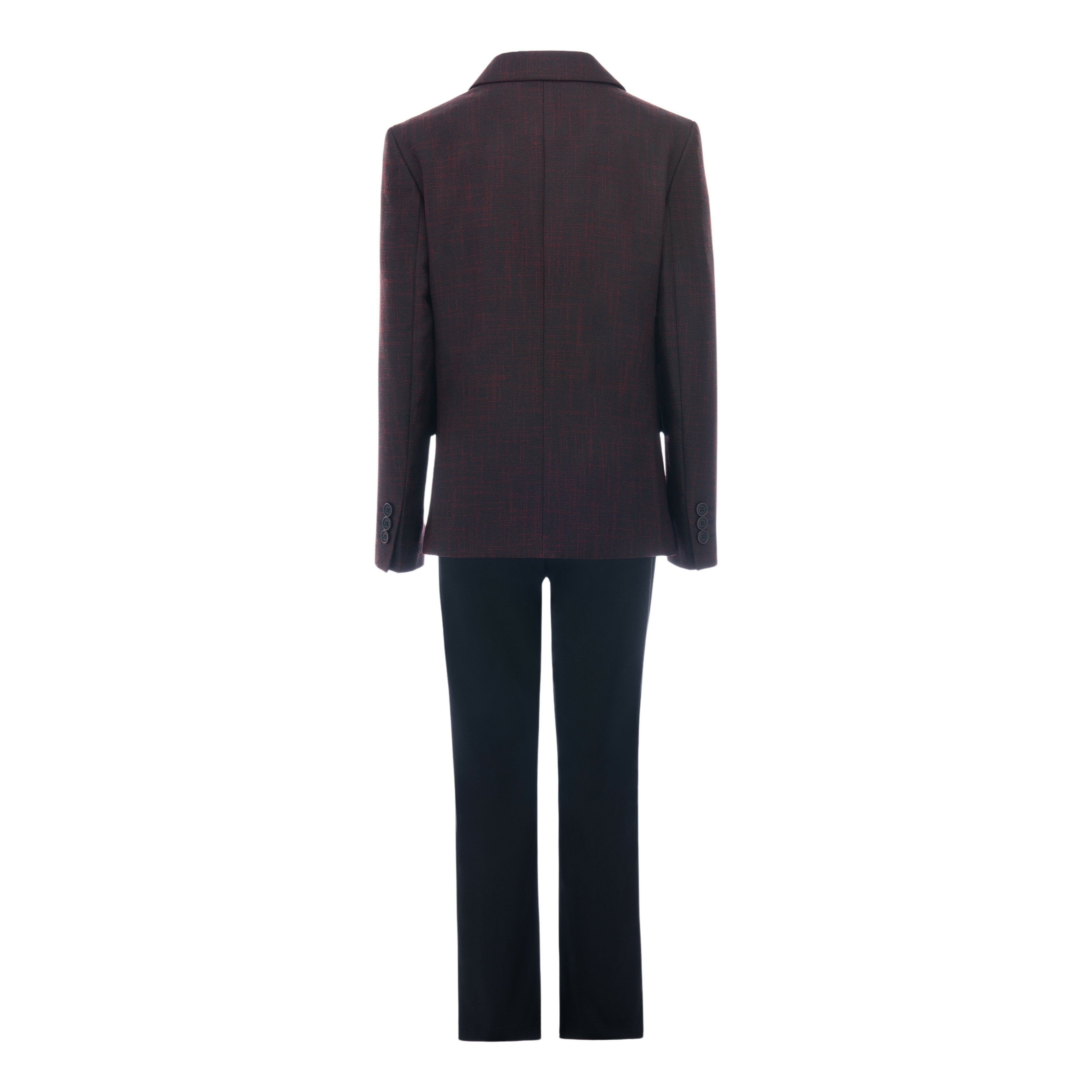 Introducing the Red Olivero Casual Dress Outfit from Moustache. This stylish 3-piece ensemble includes a red bordeaux lapel blazer, a black plain cotton t-shirt, and matching black pants, creating the perfect set for any special occasion.