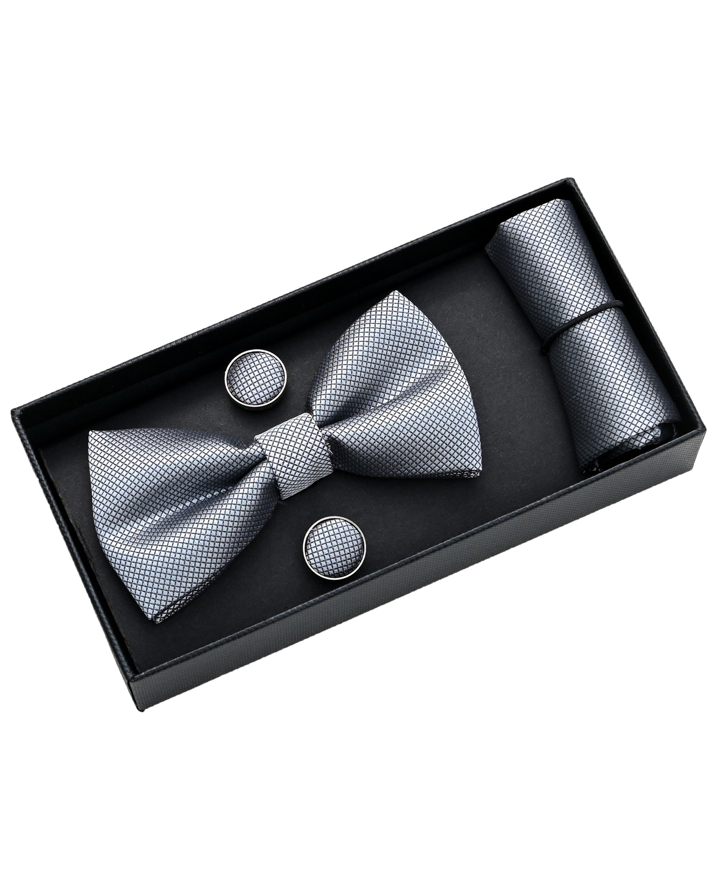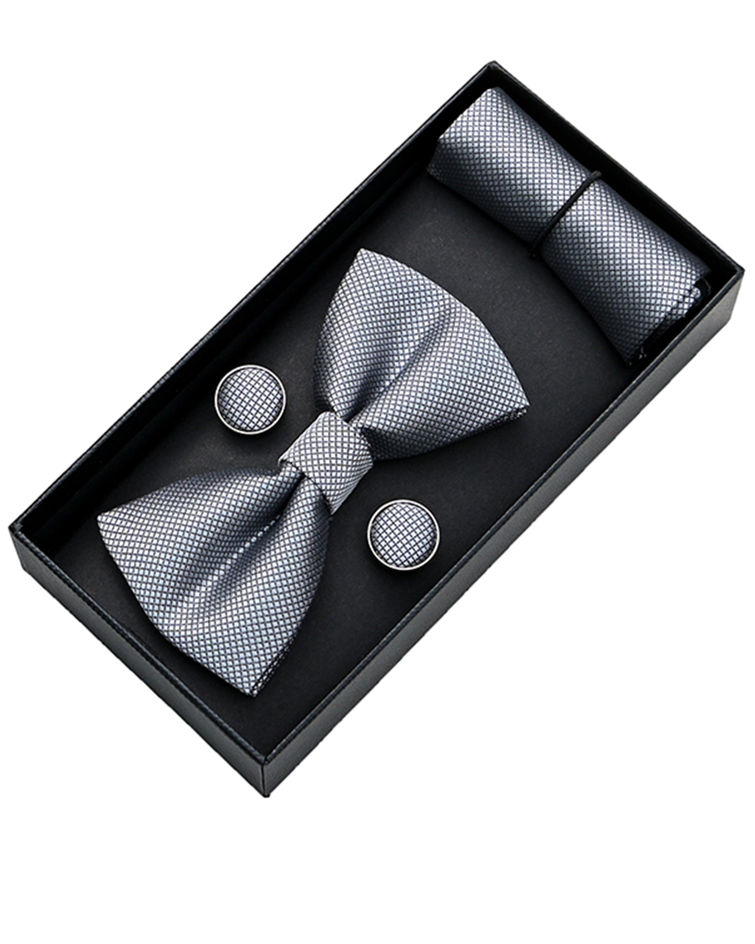 - Set includes matching bowtie, cufflinks, and pocket square