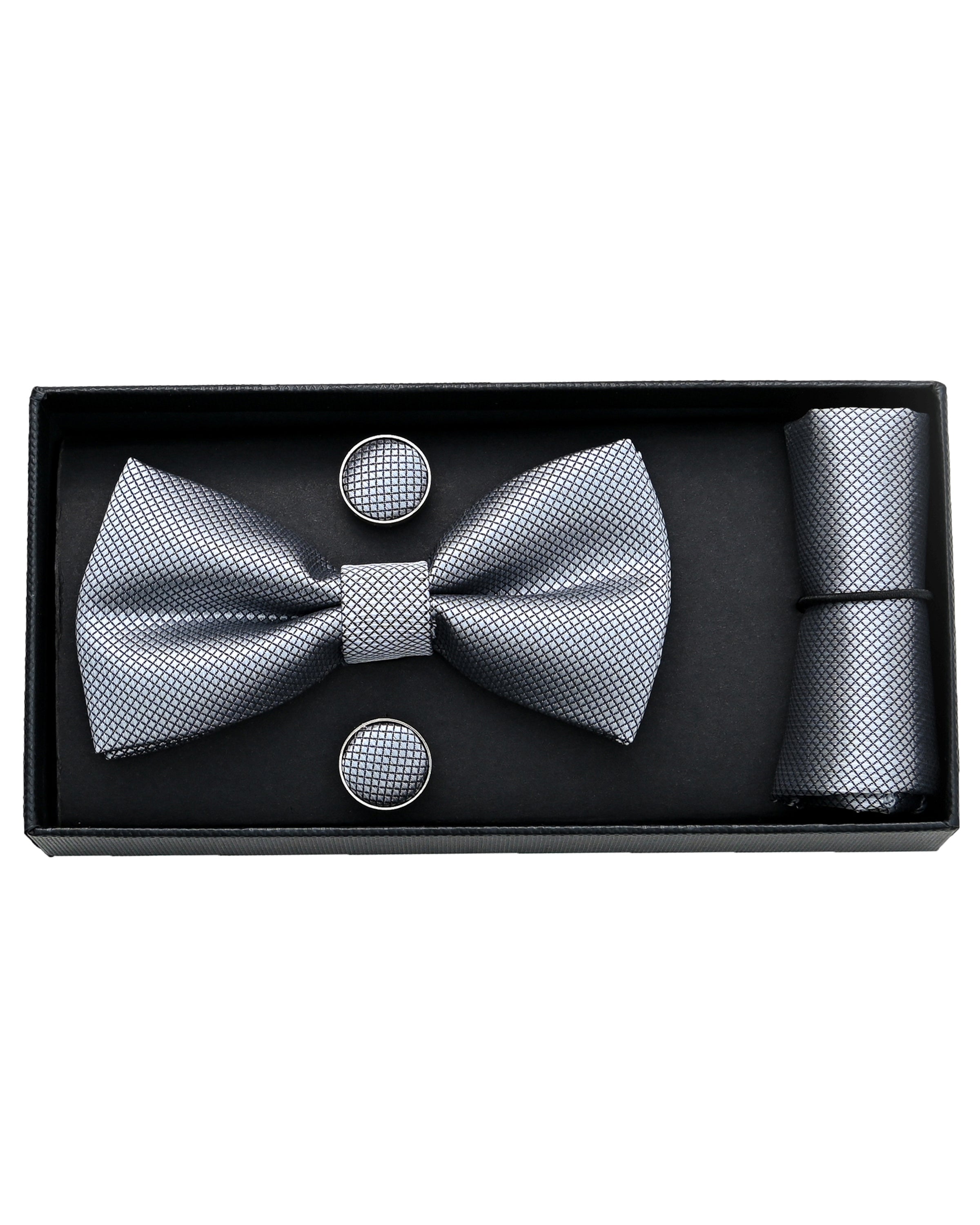 The bowtie showcases a crosshatch pattern in shimmering silver, adding depth and sophisticated texture to any outfit. Pair these matching cufflinks and pocket square creates a polished and cohesive look.