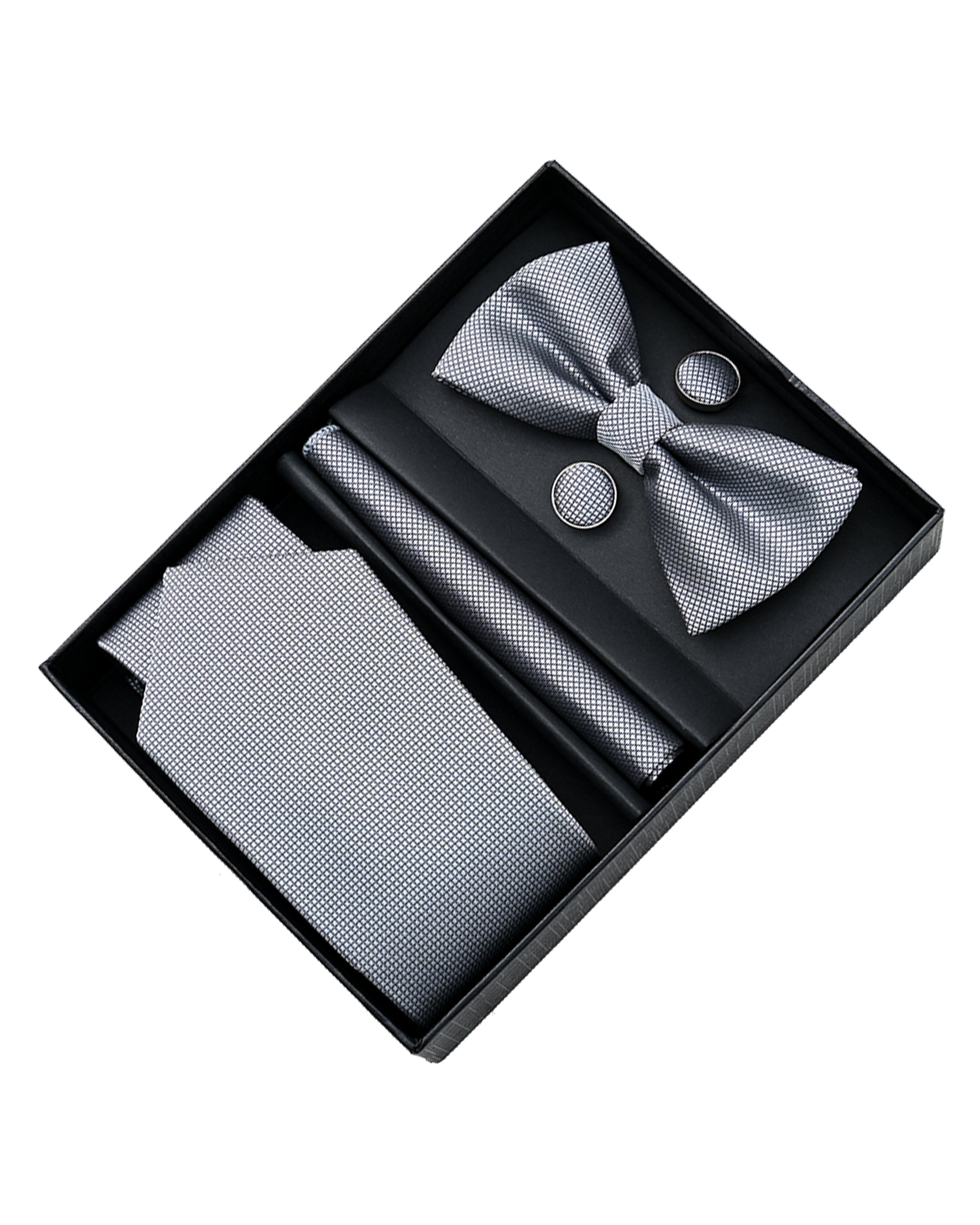 - Set includes matching tie, bowtie, pocket square, and cufflinks