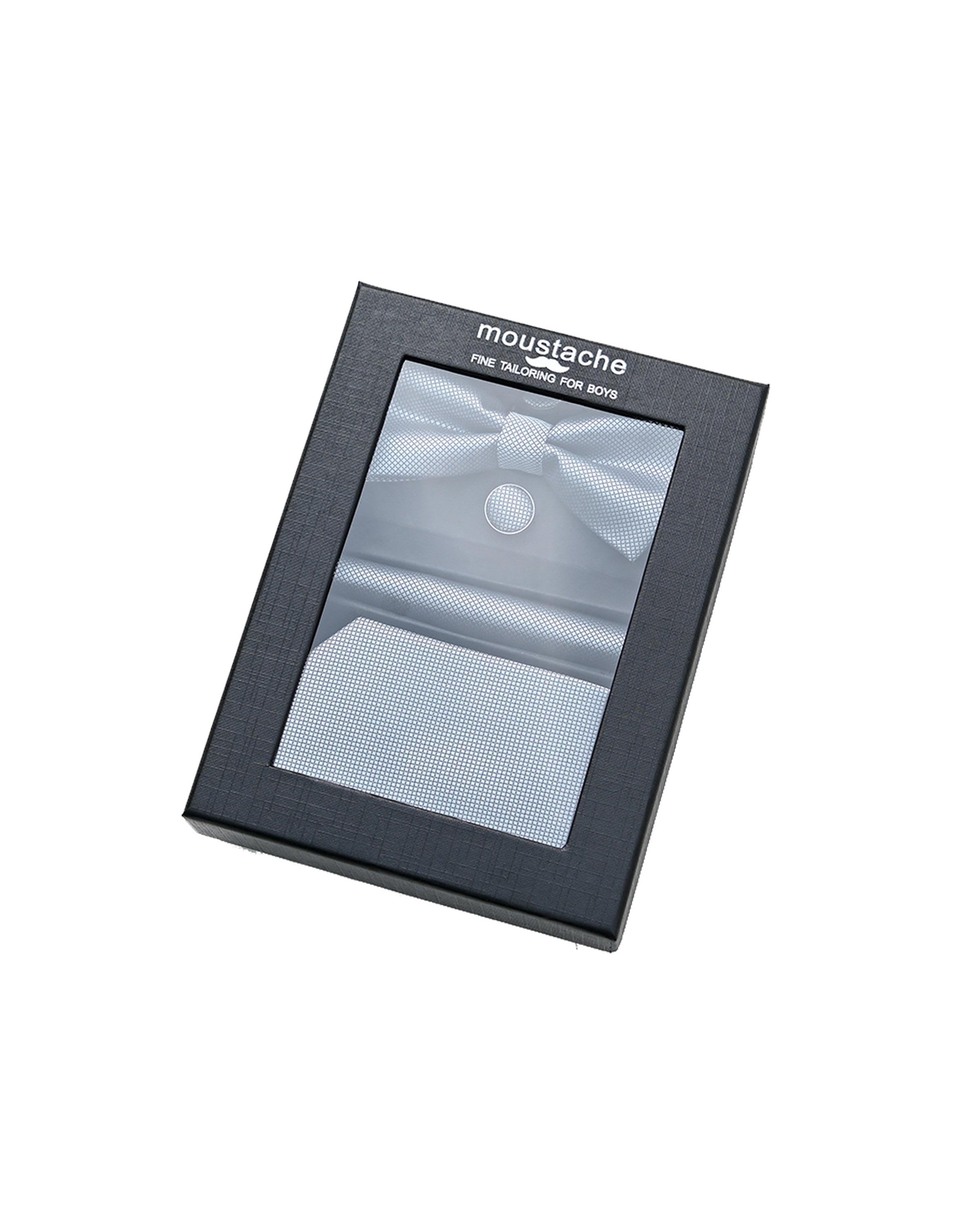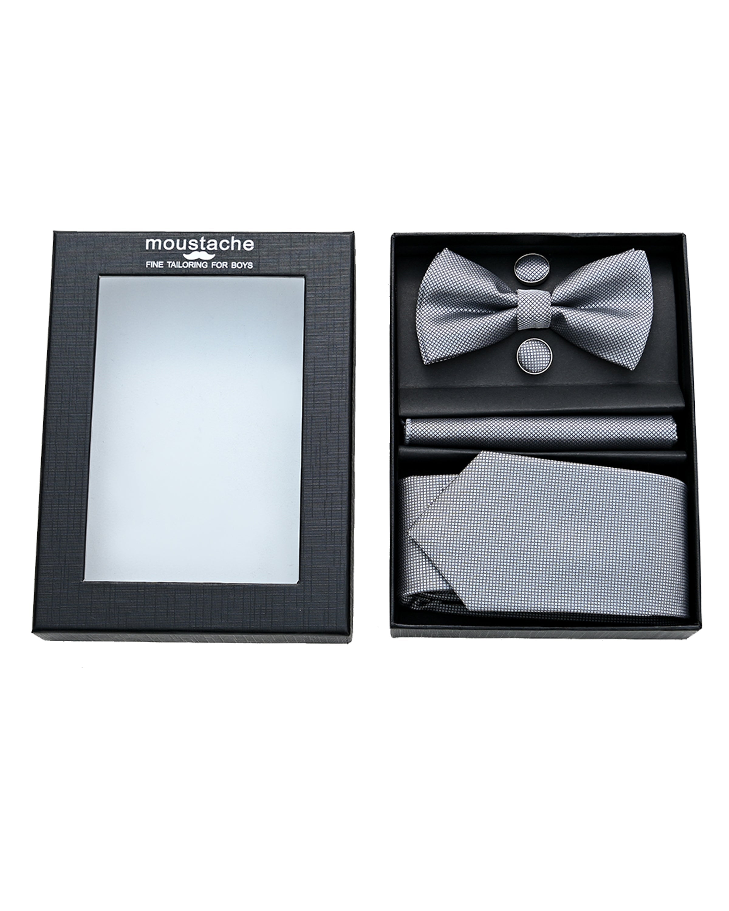 Elevate your young gentleman's attire with the Silver Texture Tie Set from Moustache. This meticulously crafted ensemble combines contemporary elegance with subtle sophistication, featuring a tie, bowtie, pocket square, and cufflinks. Moreover, it's perfect for both formal events and stylish everyday wear.