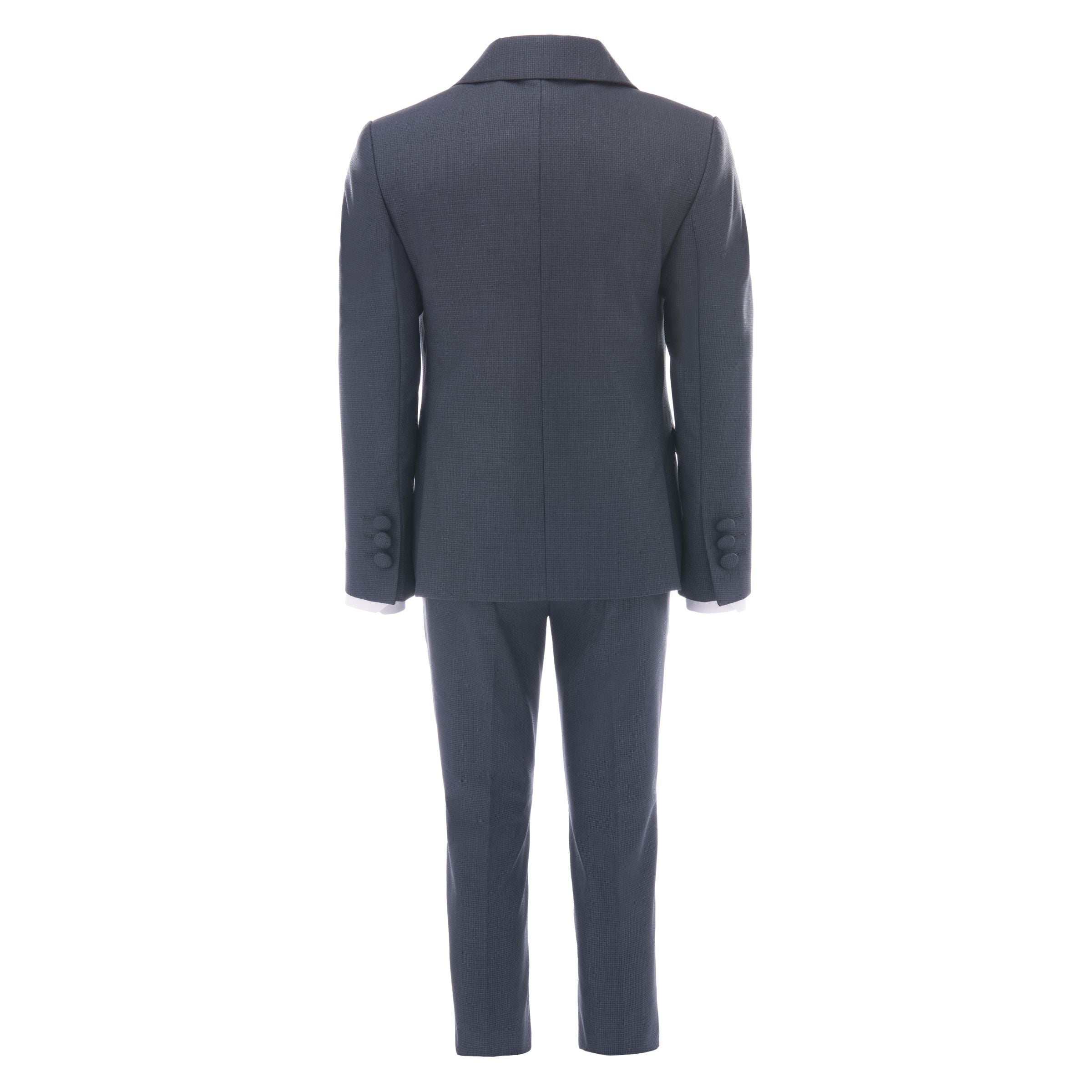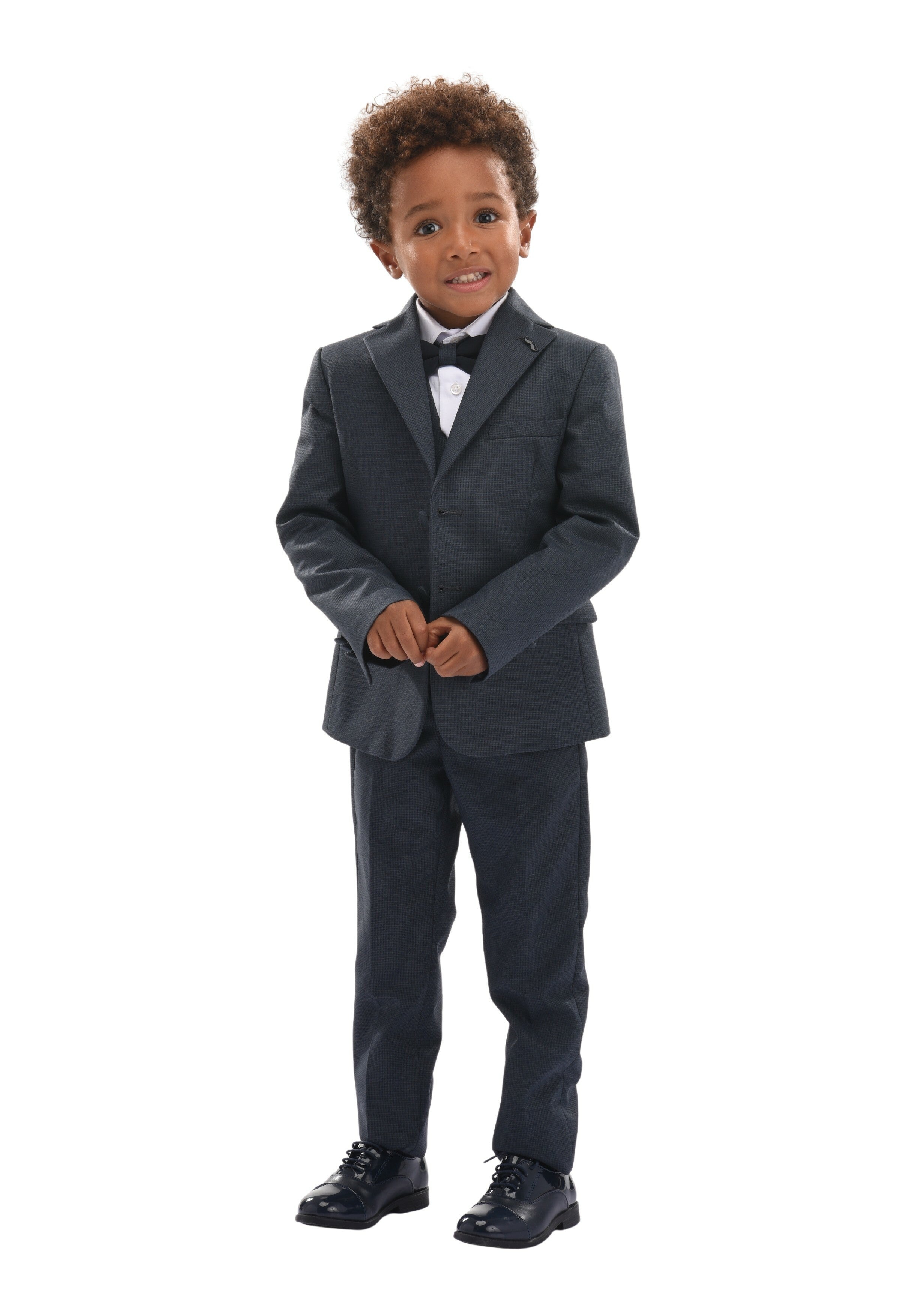Presenting our exquisitely crafted Steel Blue 5pc Peak Lapel Tuxedo set, designed to make a lasting impression at any special event. This refined ensemble features a meticulously tailored slim-fit blazer with distinguished peak lapels, creating a sophisticated silhouette that's both timeless and contemporary. The crisp white dress shirt serves as the perfect foundation, while the matching vest, complete with an adjustable back strap, adds a layer of classic elegance. Complementing flat-front pants, precisely cut for a modern slim fit, feature a comfortable adjustable waistband to ensure the perfect fit for your growing child.